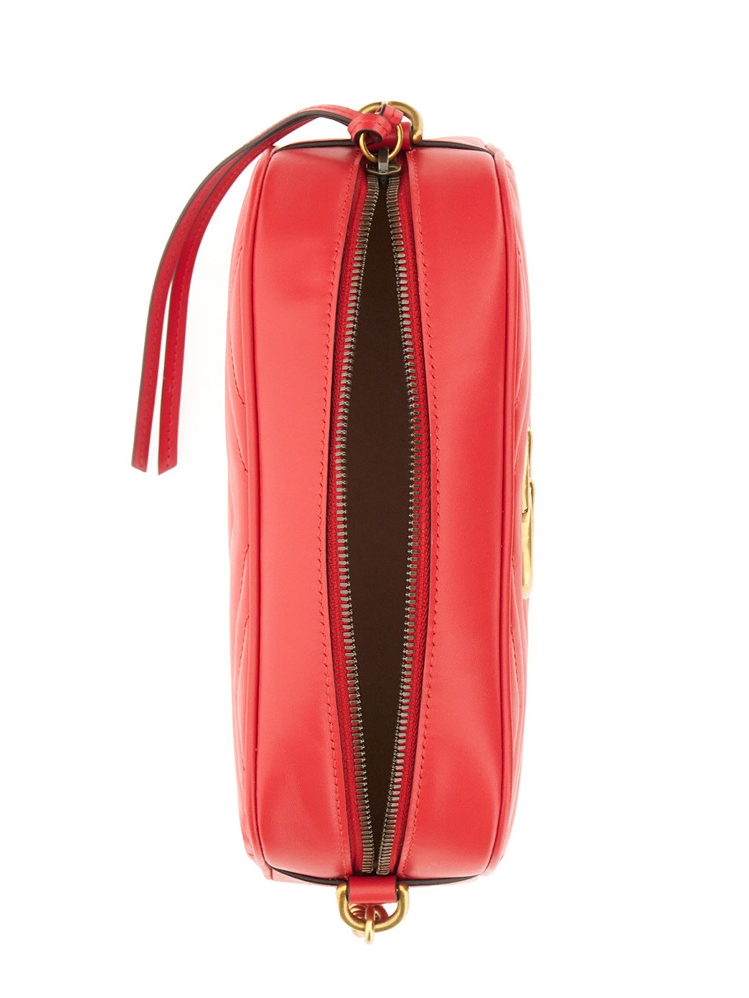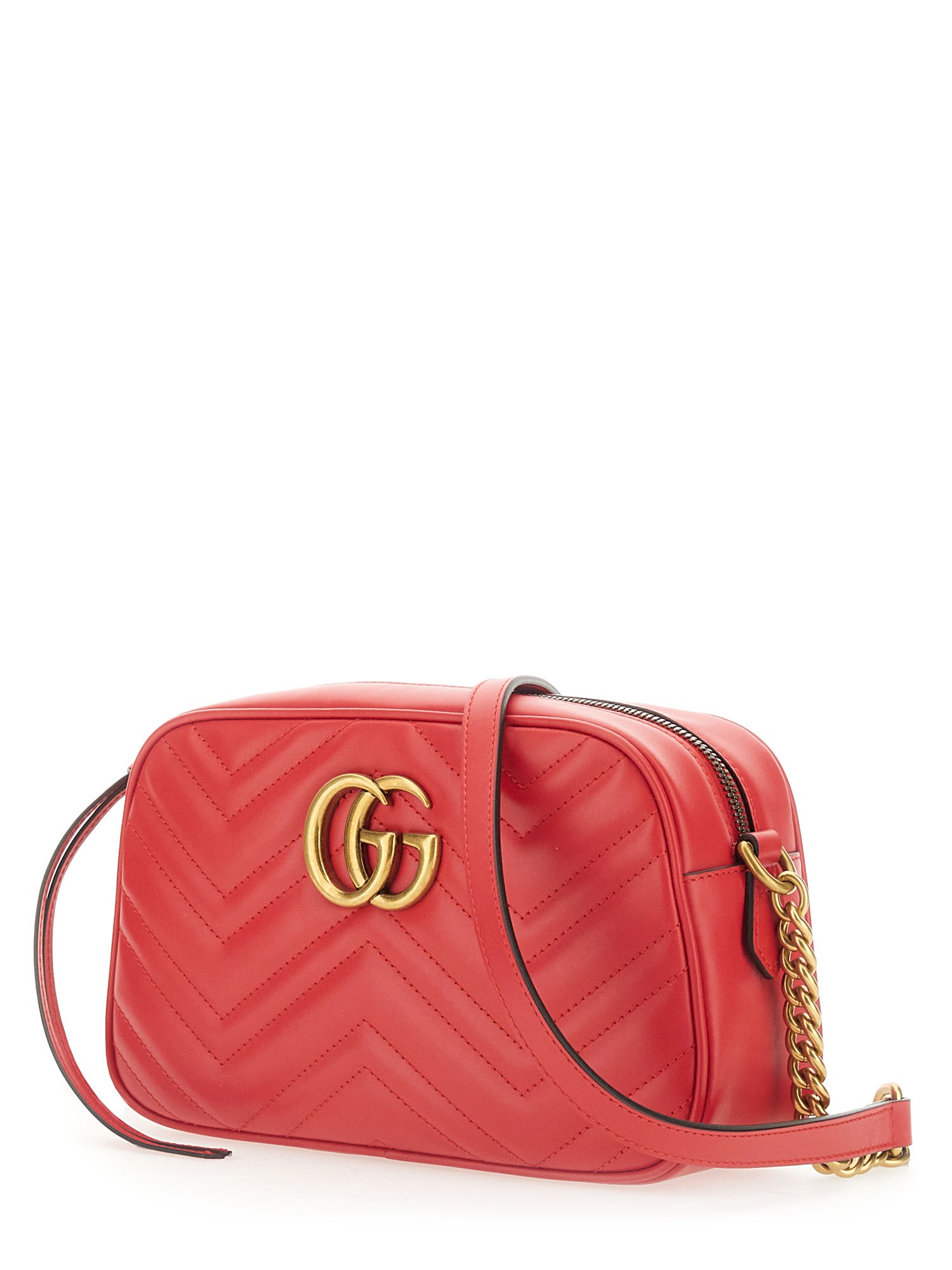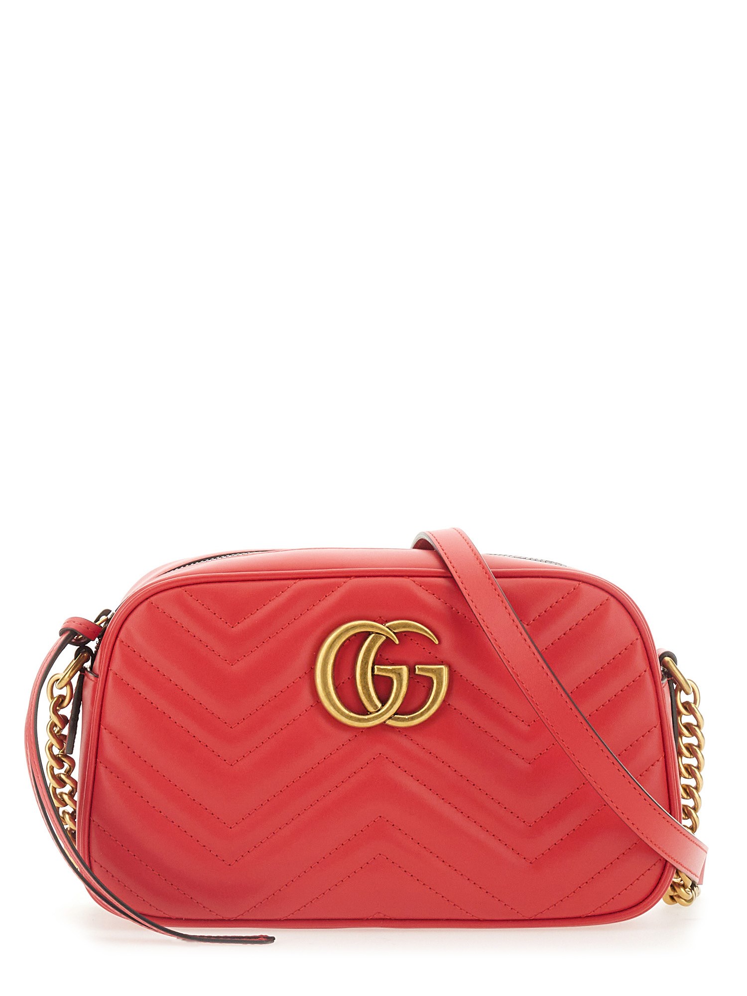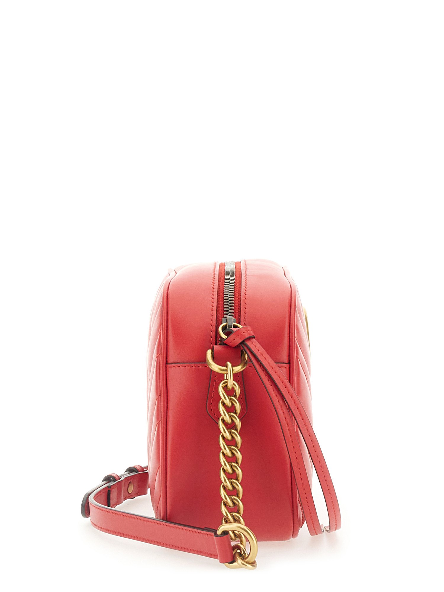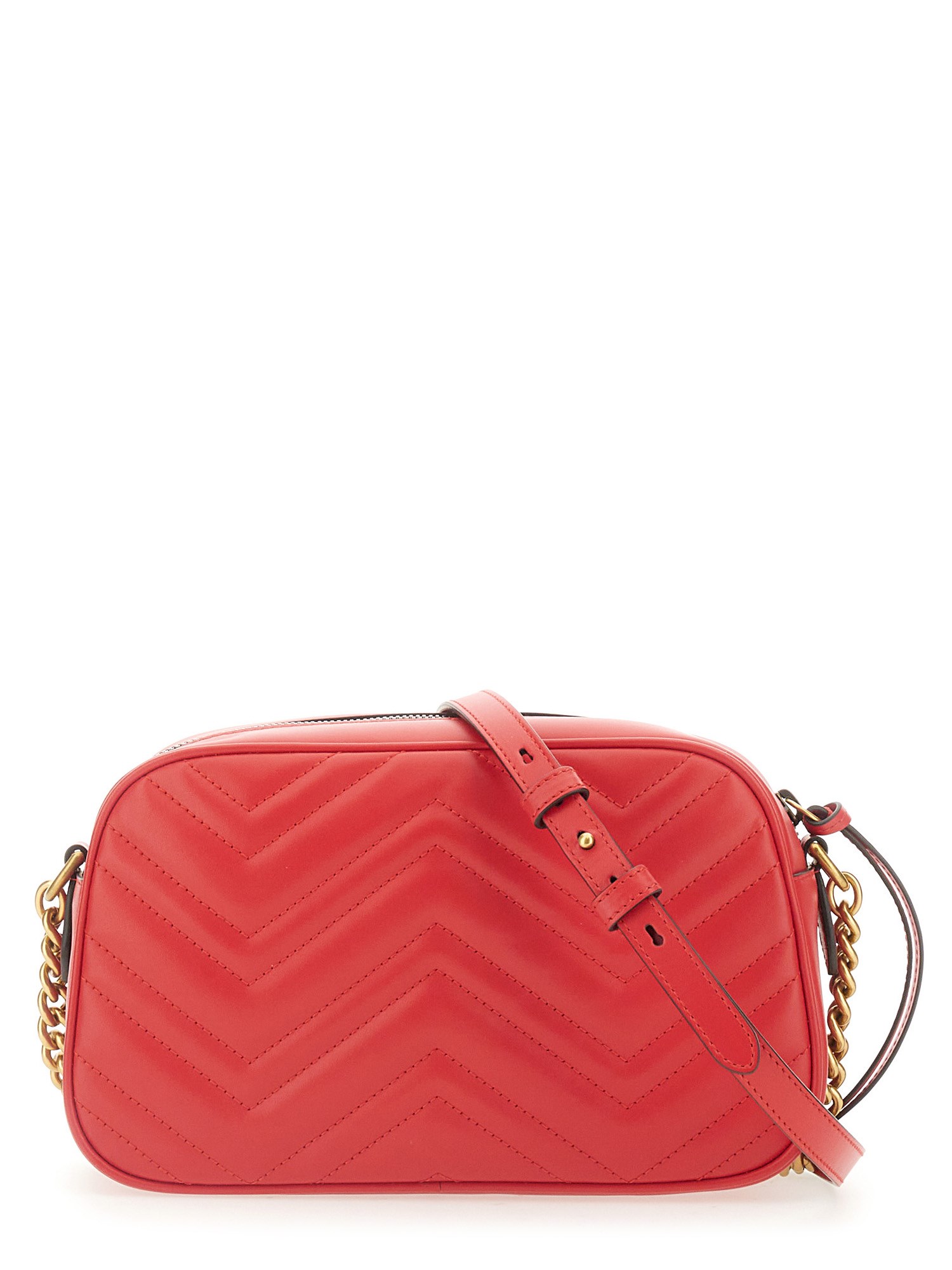Crafted from red matelassé leather, this small GG Marmont chain shoulder bag has a softly structured shape and a zip top closure with the Double G hardware. The chain shoulder strap has a leather shoulder detail.