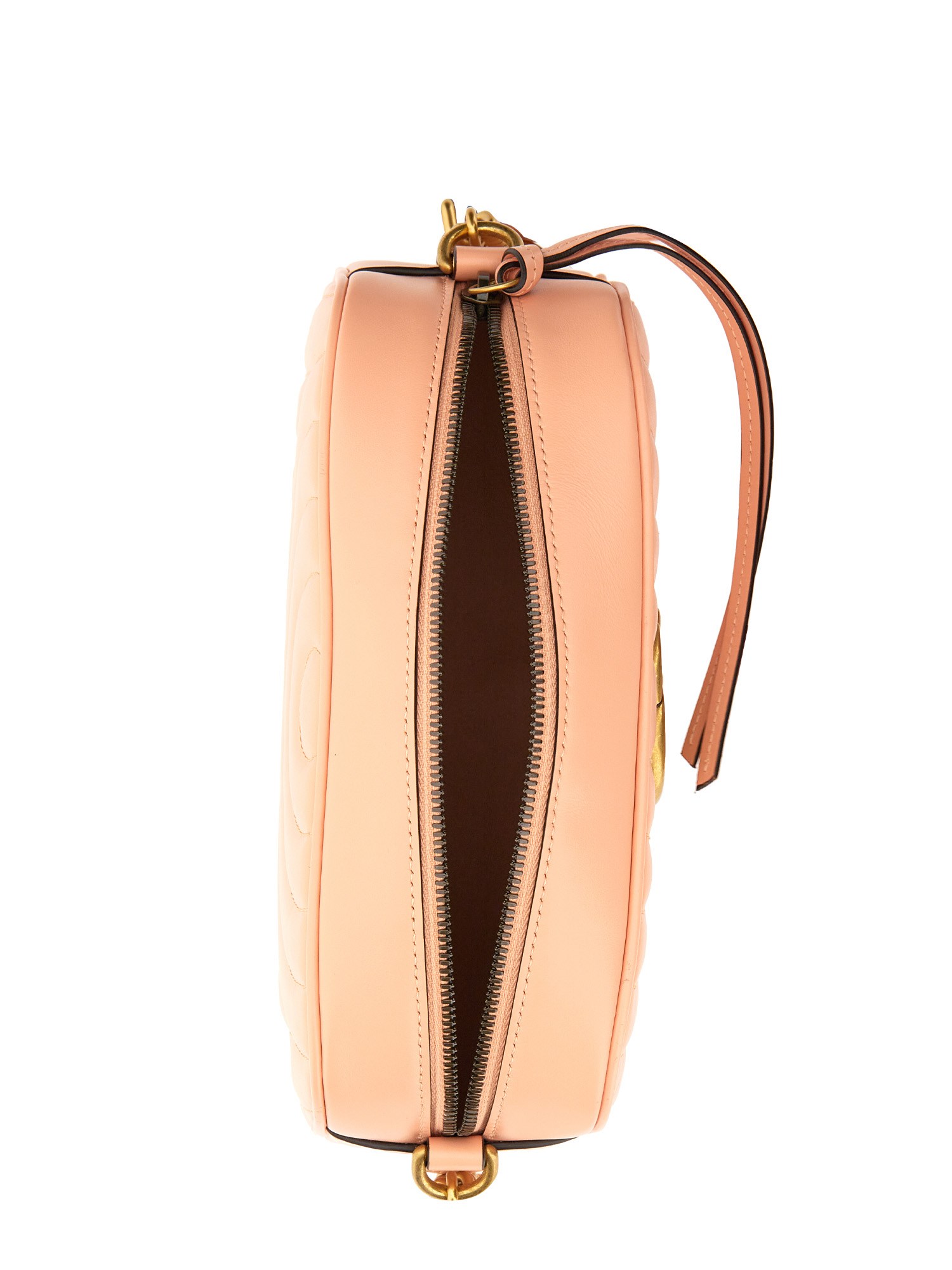 The small GG Marmont chain shoulder bag has a softly structured shape and a zip top closure, completed by the Double G. The leather shoulder strap is adjustable, allowing it to be styled as a crossbody, whereas matelassé leather with a geometric design draws attention to the line's monogram hardware.