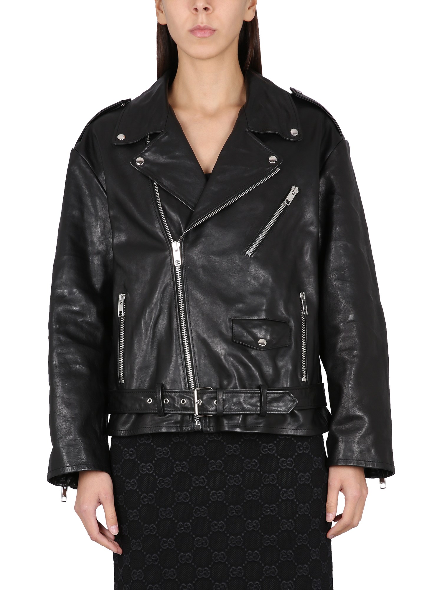 The biker jacket is a cult ready-to-wear piece that truly transcends the seasons. Crafted in a soft black leather, this classic silhouette is enriched with a Gucci leather patch on the reverse and a vibrant red satin lining.