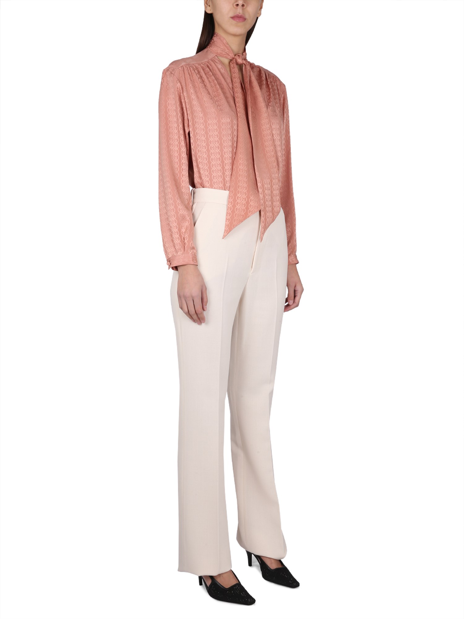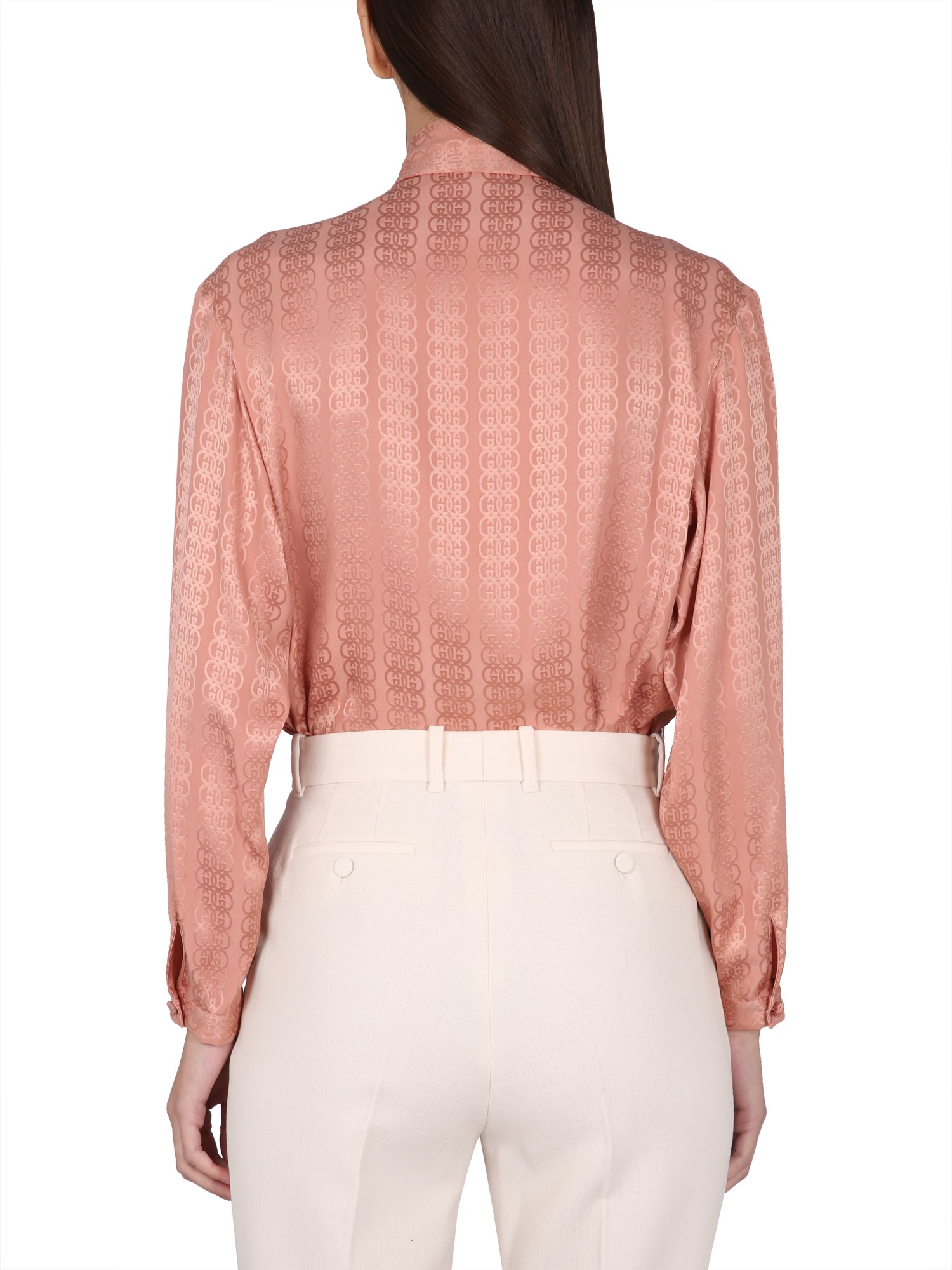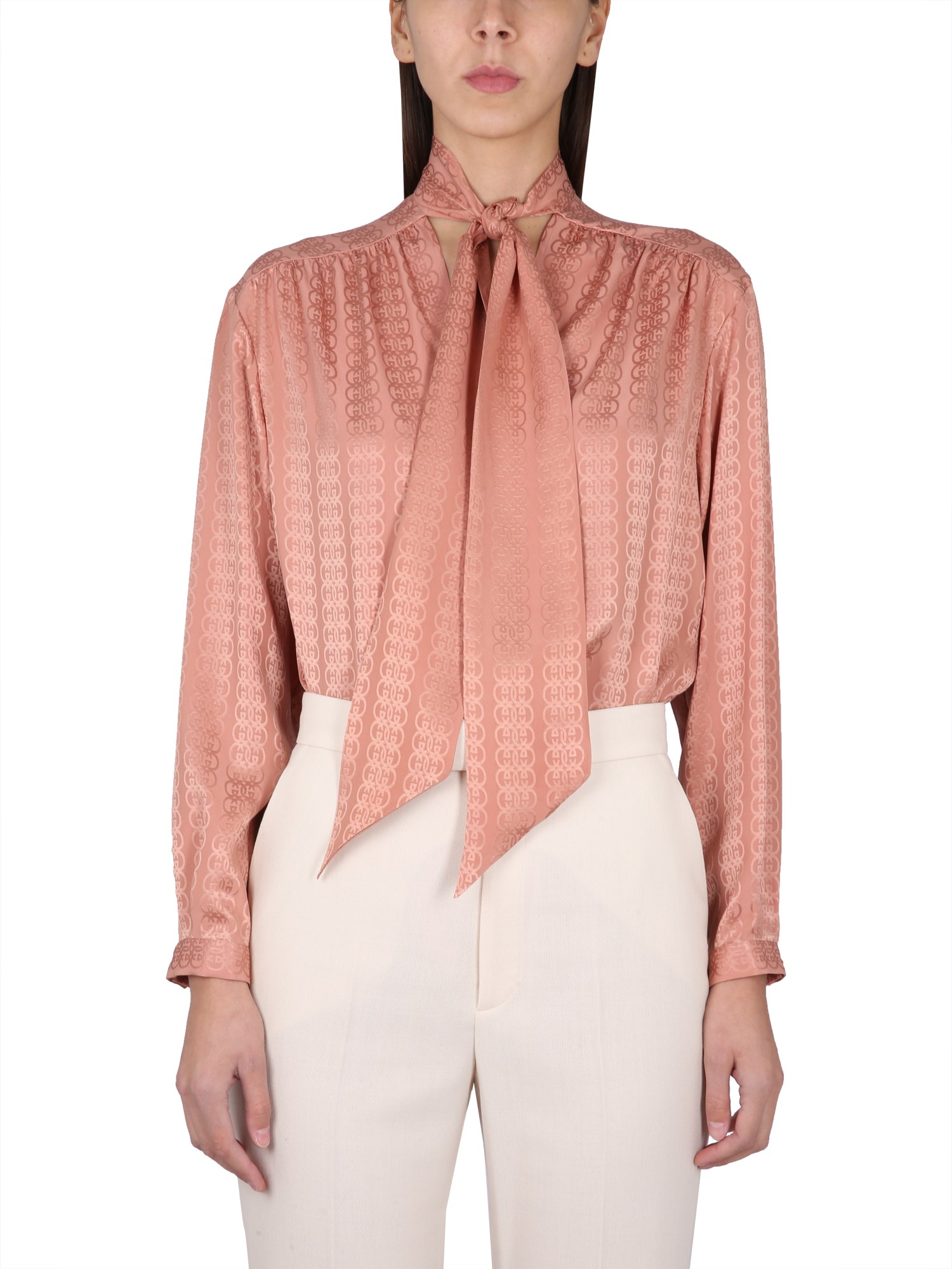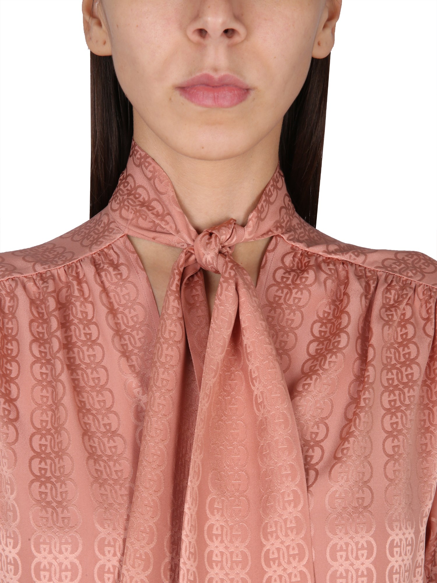 A self-tie bow adds a feminine touch to this pink crêpe satin shirt, complete with a gathered silhouette. Gucci transcribes its heritage, creativity, and innovation into a plenitude of collections, from staple items to distinctive accessories, from the everyday wardrobe to special occasions.