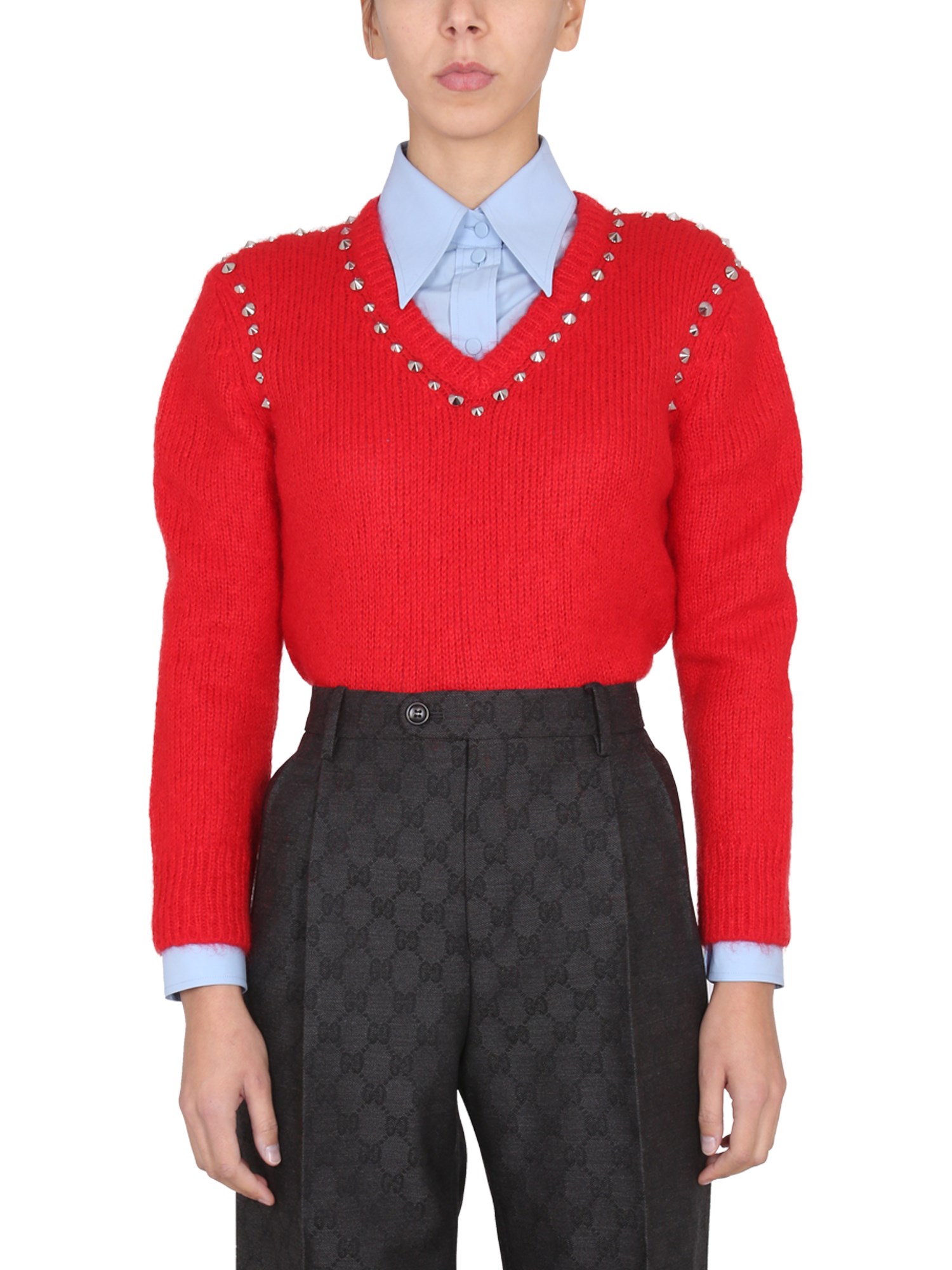 Reminiscent of the punk scene, metal eyelets and studs form a textured cut-out design across a selection of knitwear pieces. Presented in red mohair, this sweater is defined by a stud trim.