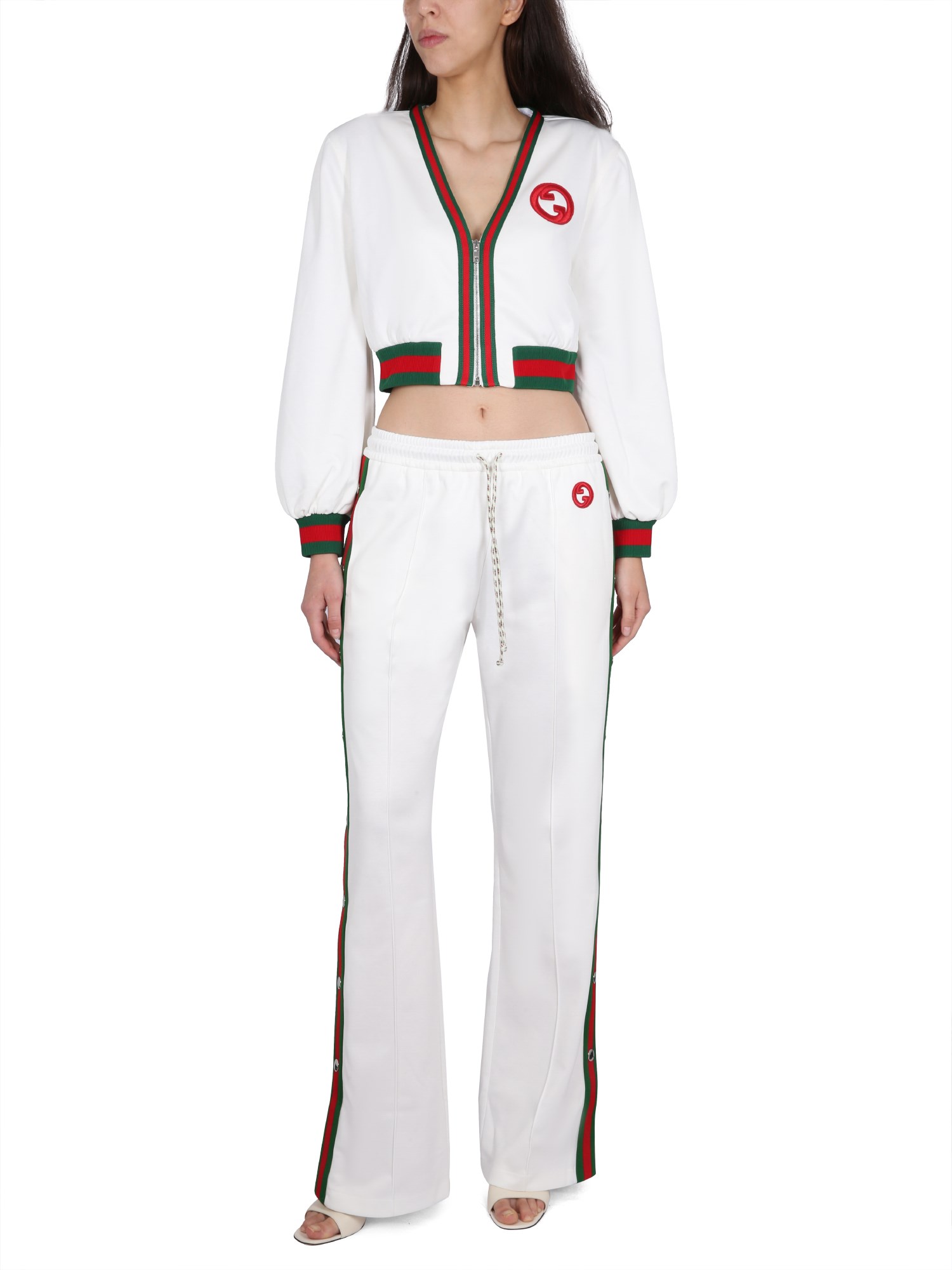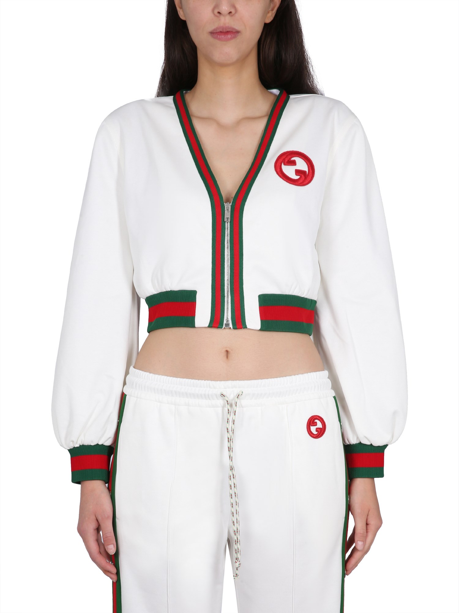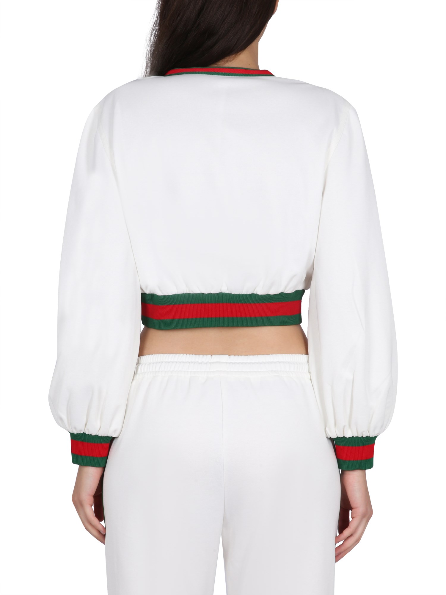- V-NECK- ZIPPER CLOSURE- LOGO PATCH- RED AND GREEN WEB RIBBON- CROPPED- 55% POLYESTER, 45% COTTON- MODEL IS 180 CM TALL AND WEARS SIZE S
