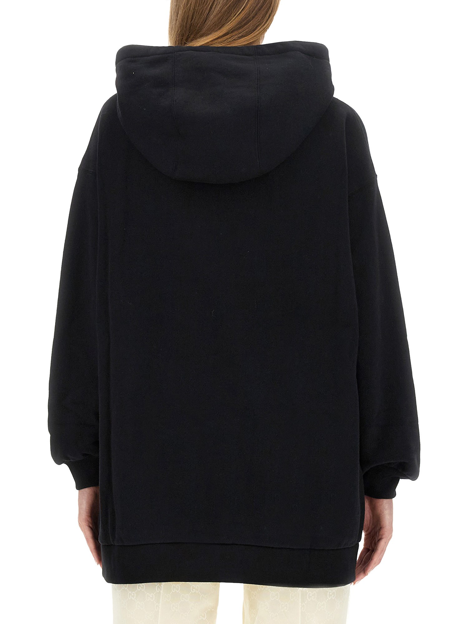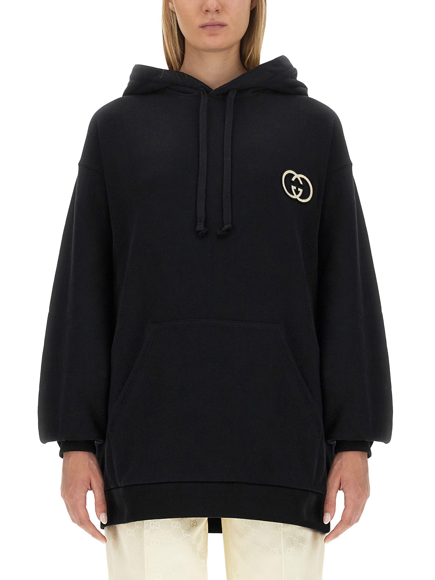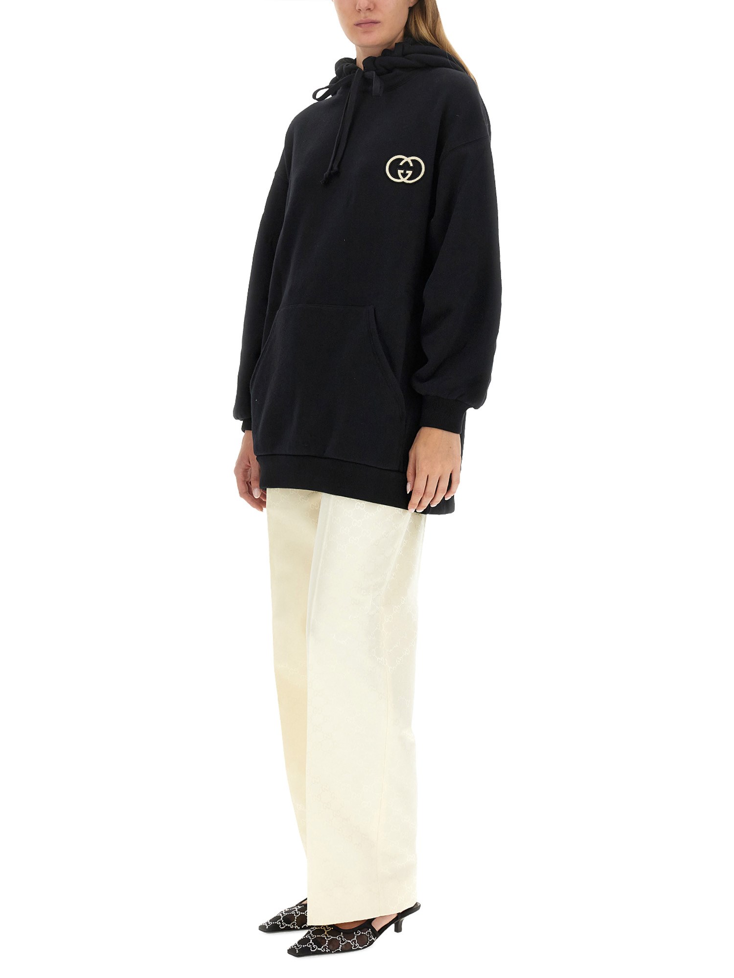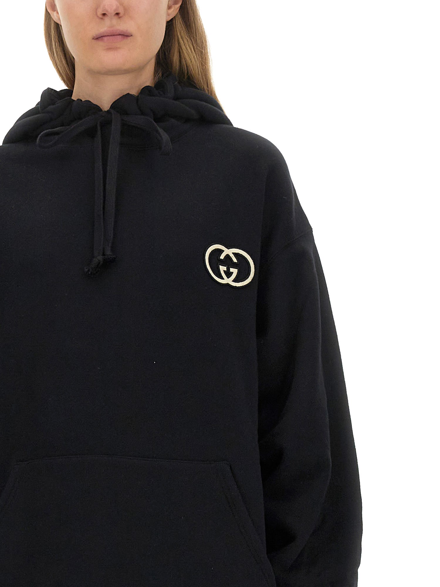 Oversized volumes are presented across a variety of college-inspired knitwear and jersey styles, presenting the everyday looks in a variety of colours. This cotton jersey hooded sweatshirt is characterised by an Interlocking G embroidered patch and a tonal rib trim.