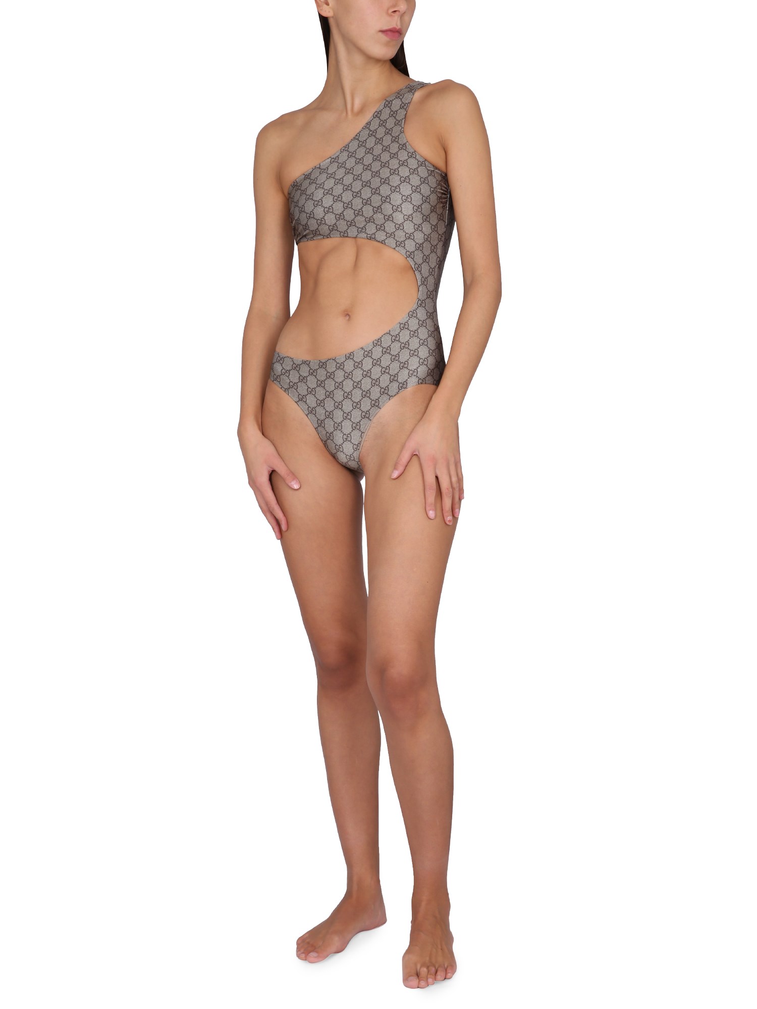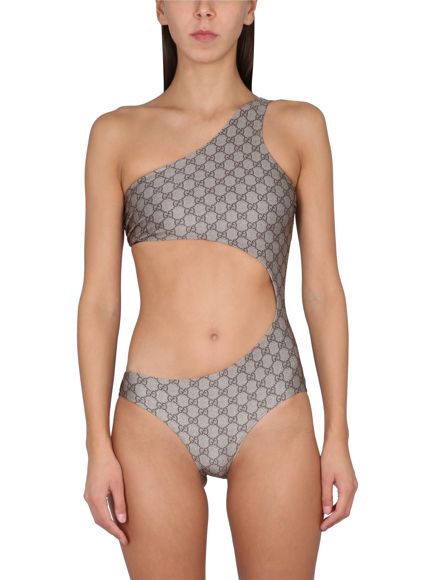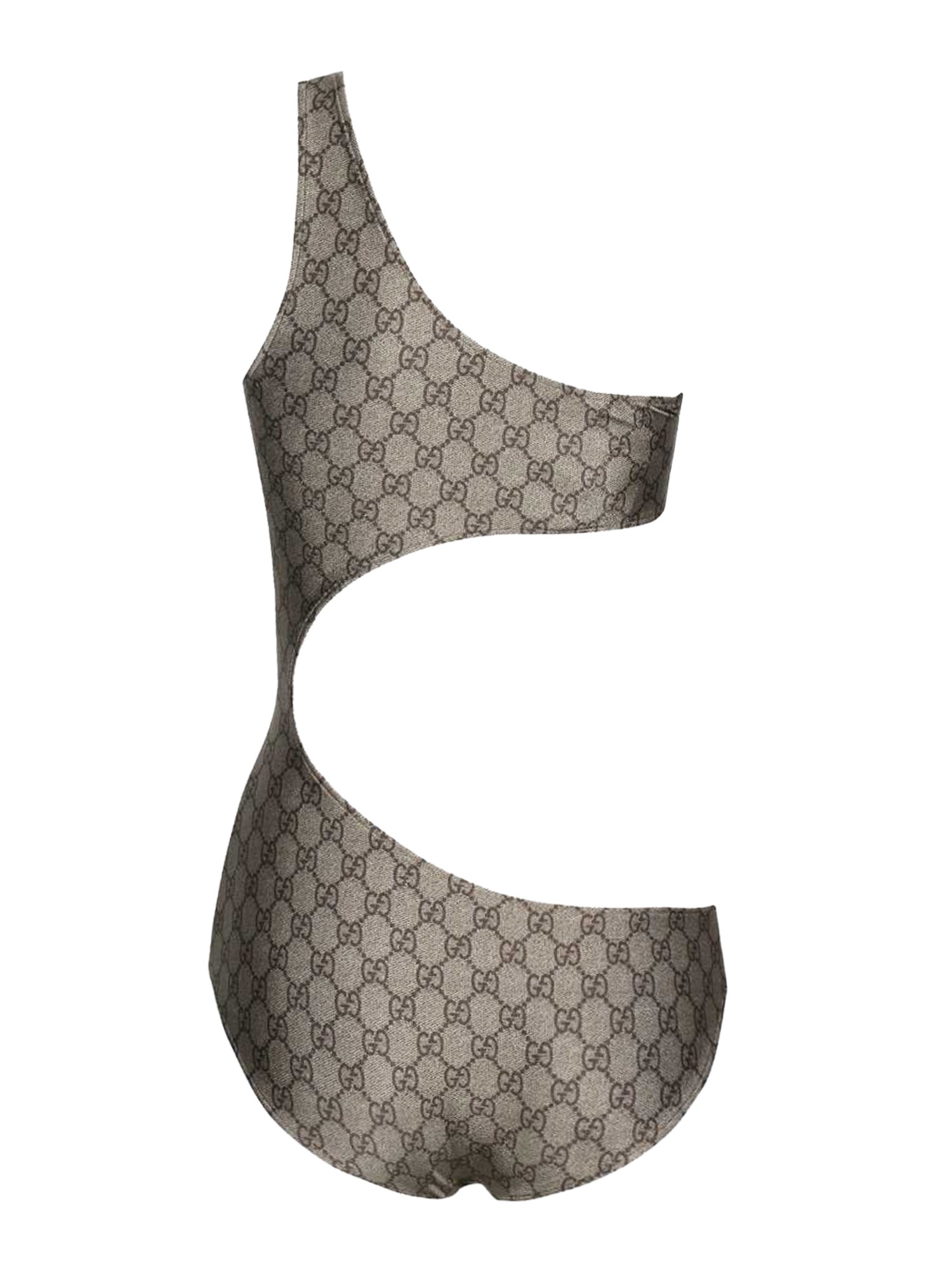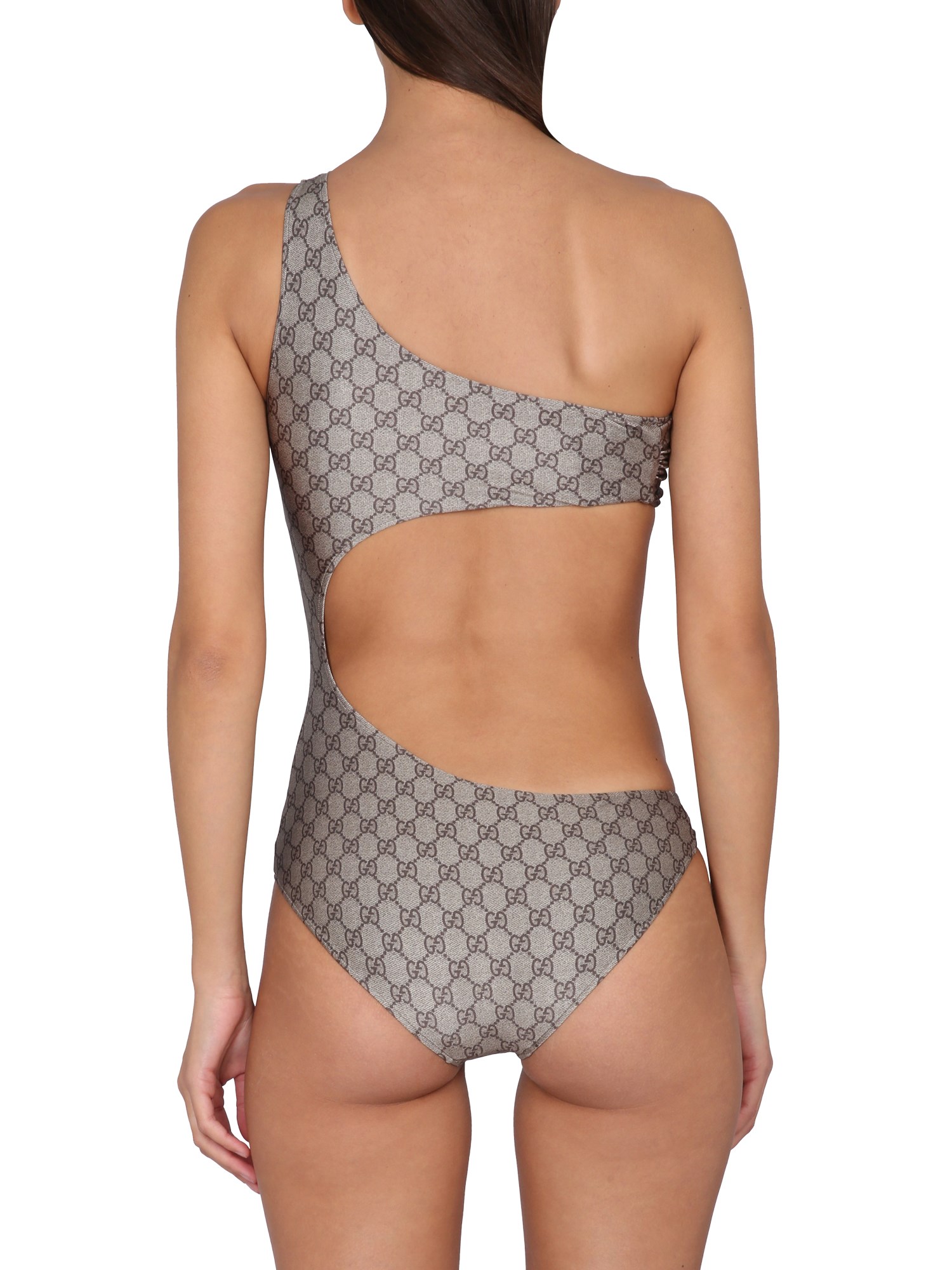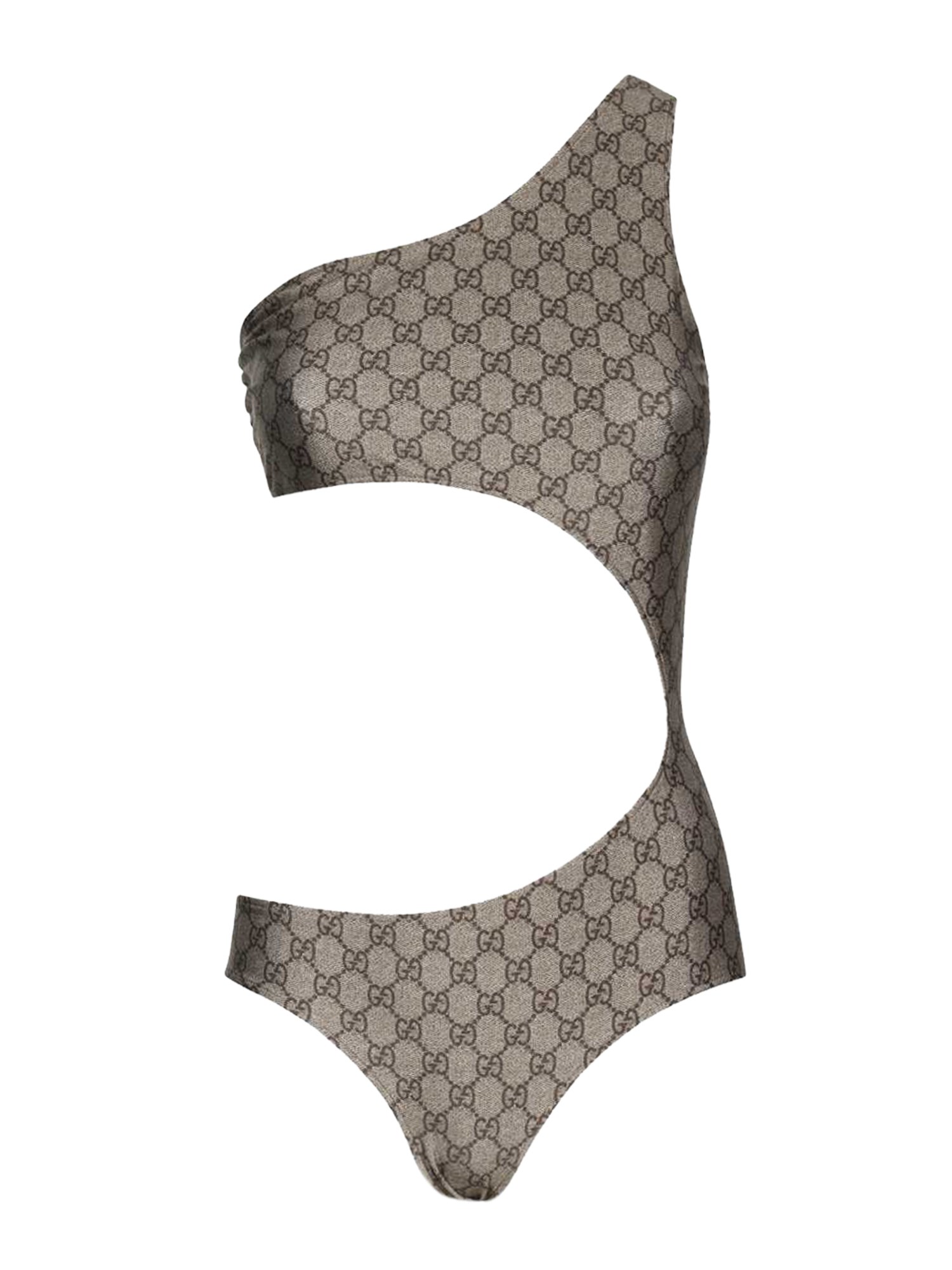 The feeling of escapism experienced in the last House's collection finds its peak through Gucci Love Parade. Embodying the theme, garments inspired by warm-weather destinations animates the collection, like this GG stretch jersey swimsuit.