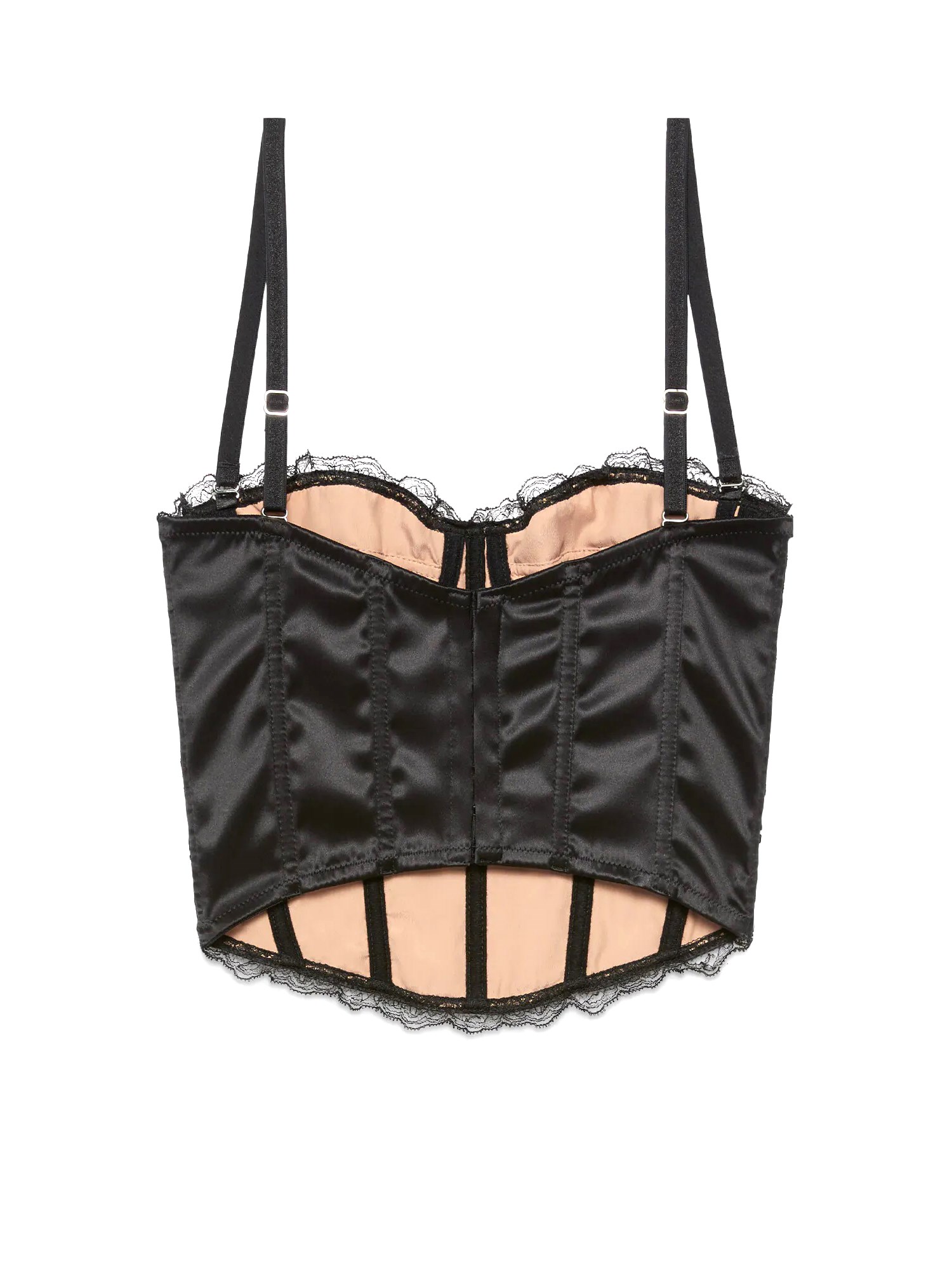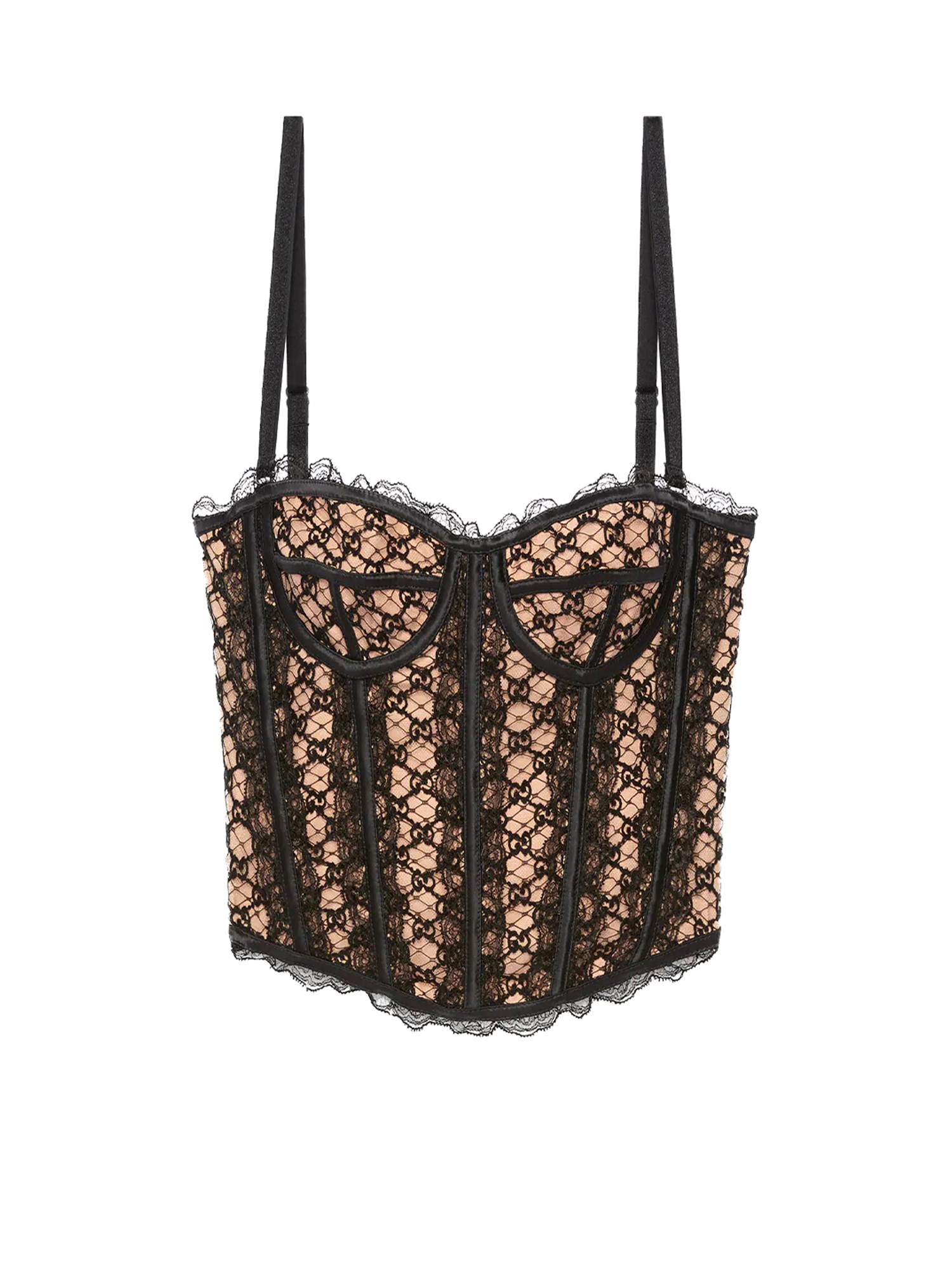 A black GG net corset with lace trims and adjustable straps. For the Gucci Aria collection, typical lingerie silhouettes are re-imagined as unconventional ready-to-wear pieces, exploring the concept of fashion as a means of self-expression.