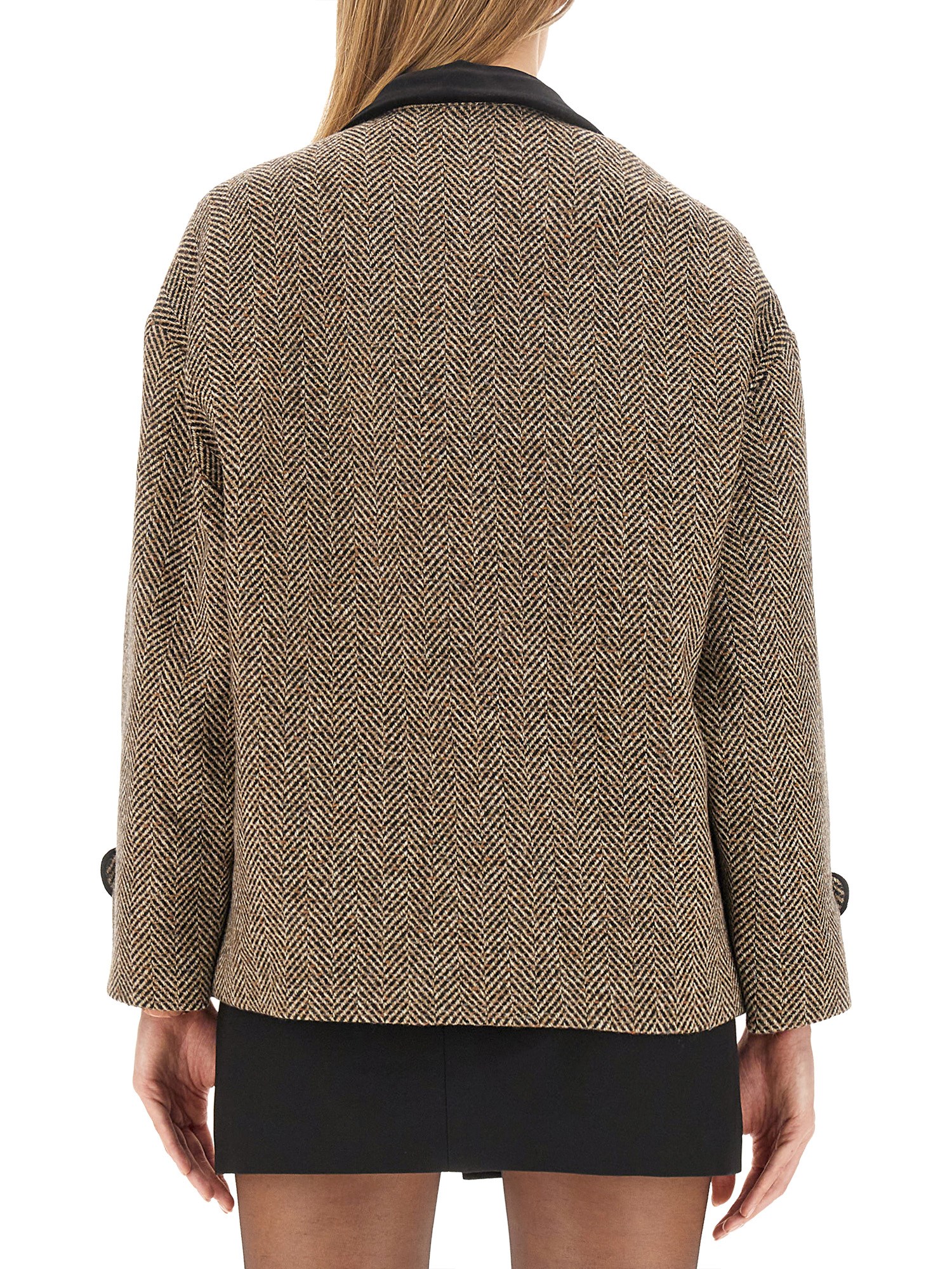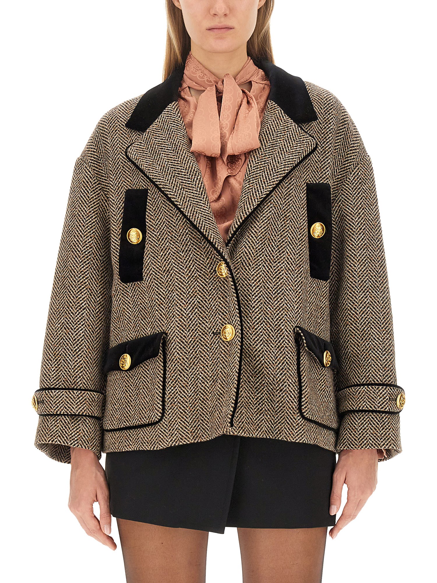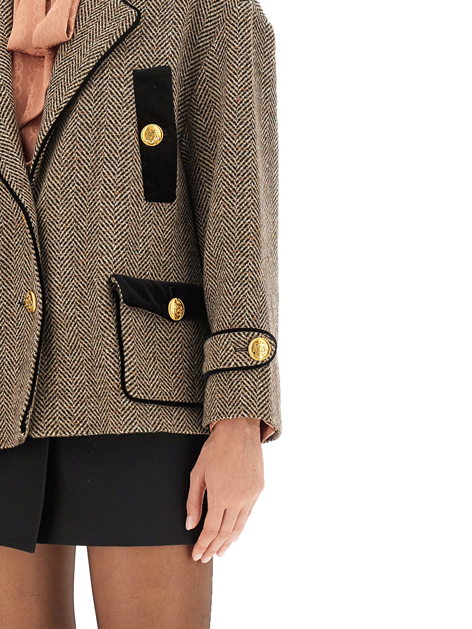 Essential pieces in the Pre-Fall 2023 collection are embellished with signature Gucci motifs for the wardrobe. This structured coat is crafted from a grey and brown wool herringbone and enhanced with a contrasting velvet trim. Interlocking G anchor gold-toned buttons illuminate the silhouette, paying homage to the House's rich heritage.