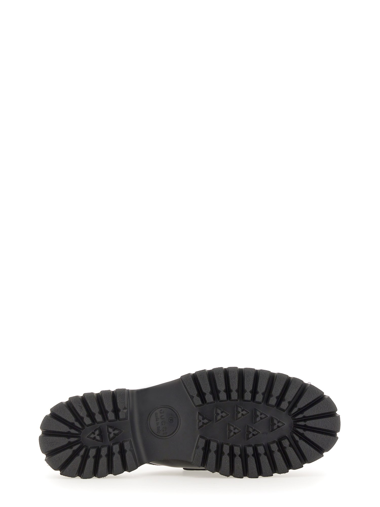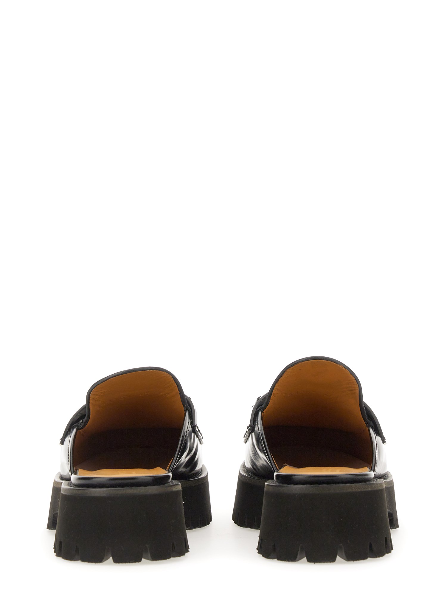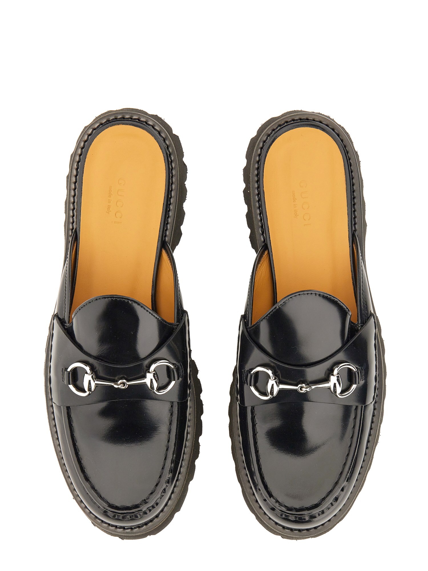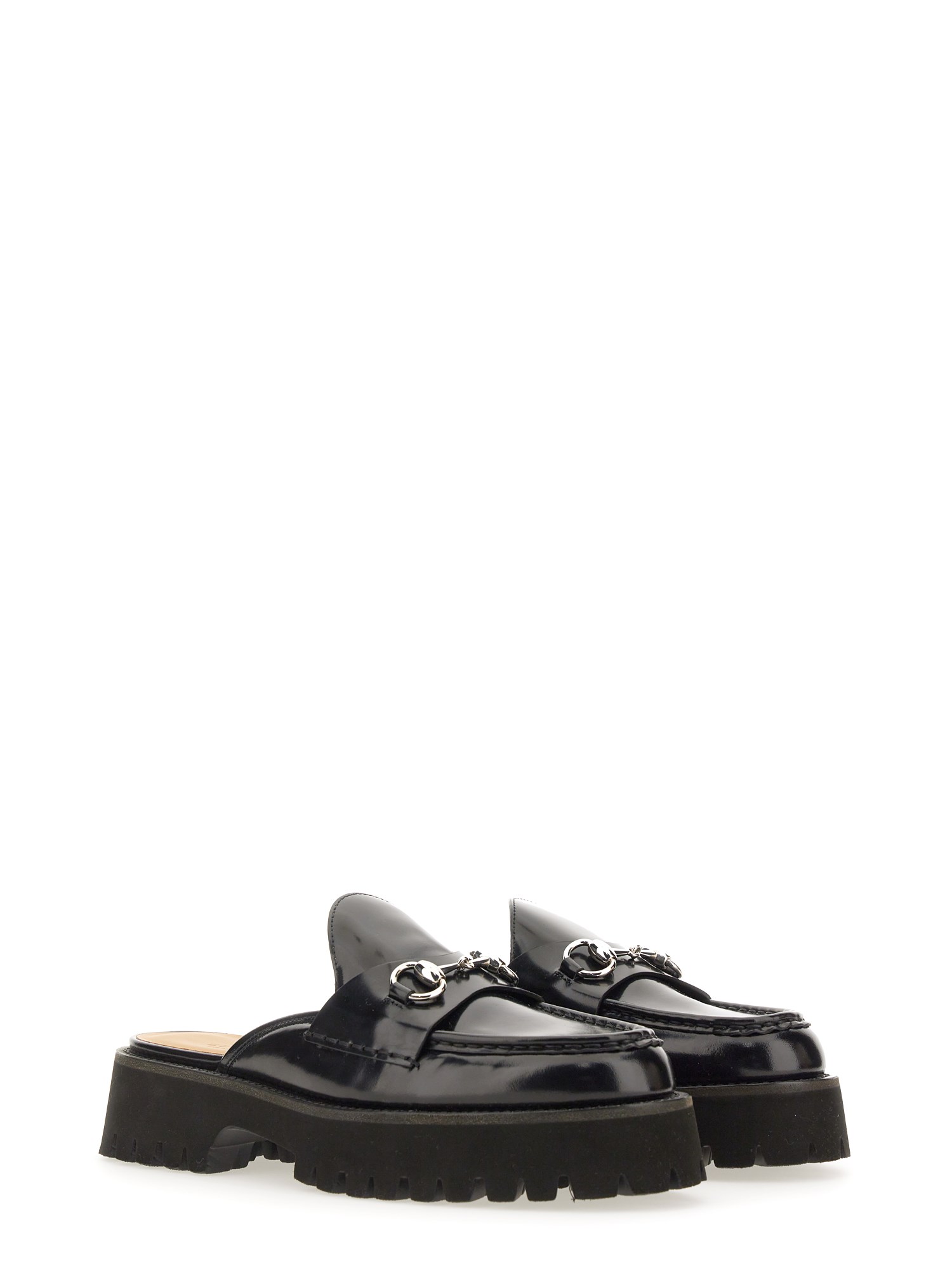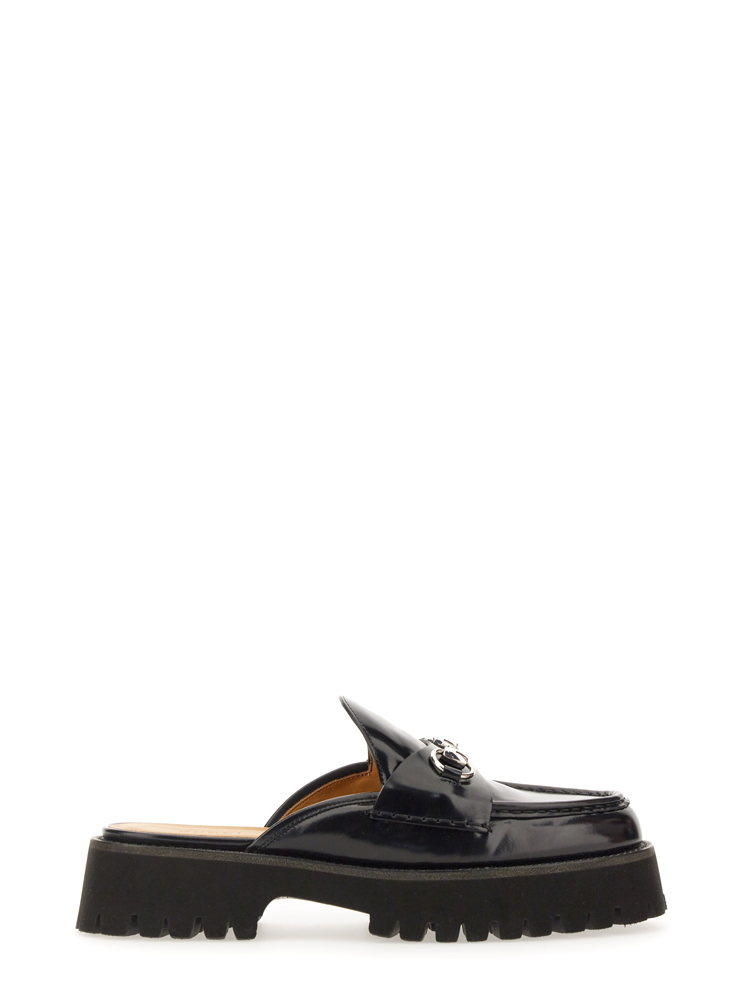 Combining the stylistic elements of boots and moccasins, this black leather mule features a lightweight rubber lug sole paired with an elegant silhouette. The signature Horsebit hardware elevates the style, adding a sophisticated element to an everyday design.
