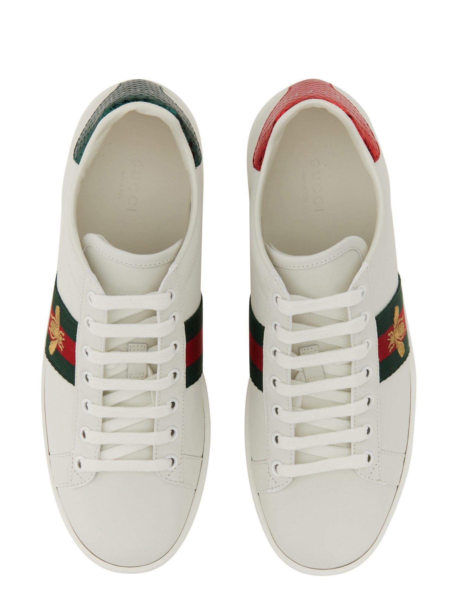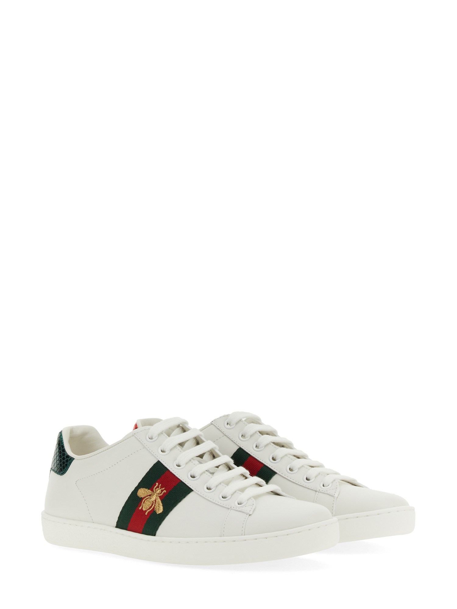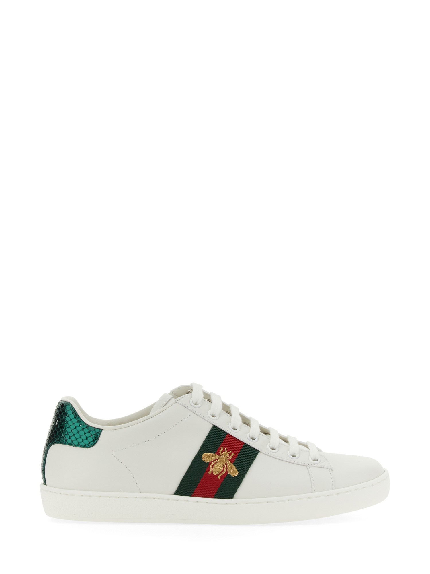 La classica sneaker low-top della Maison è impreziosita dall'ape ricamata in oro sul web verde e rosso. L'ape è un codice d'archivio introdotto per la prima volta nel prêt-à-porter di Gucci negli anni Settanta.