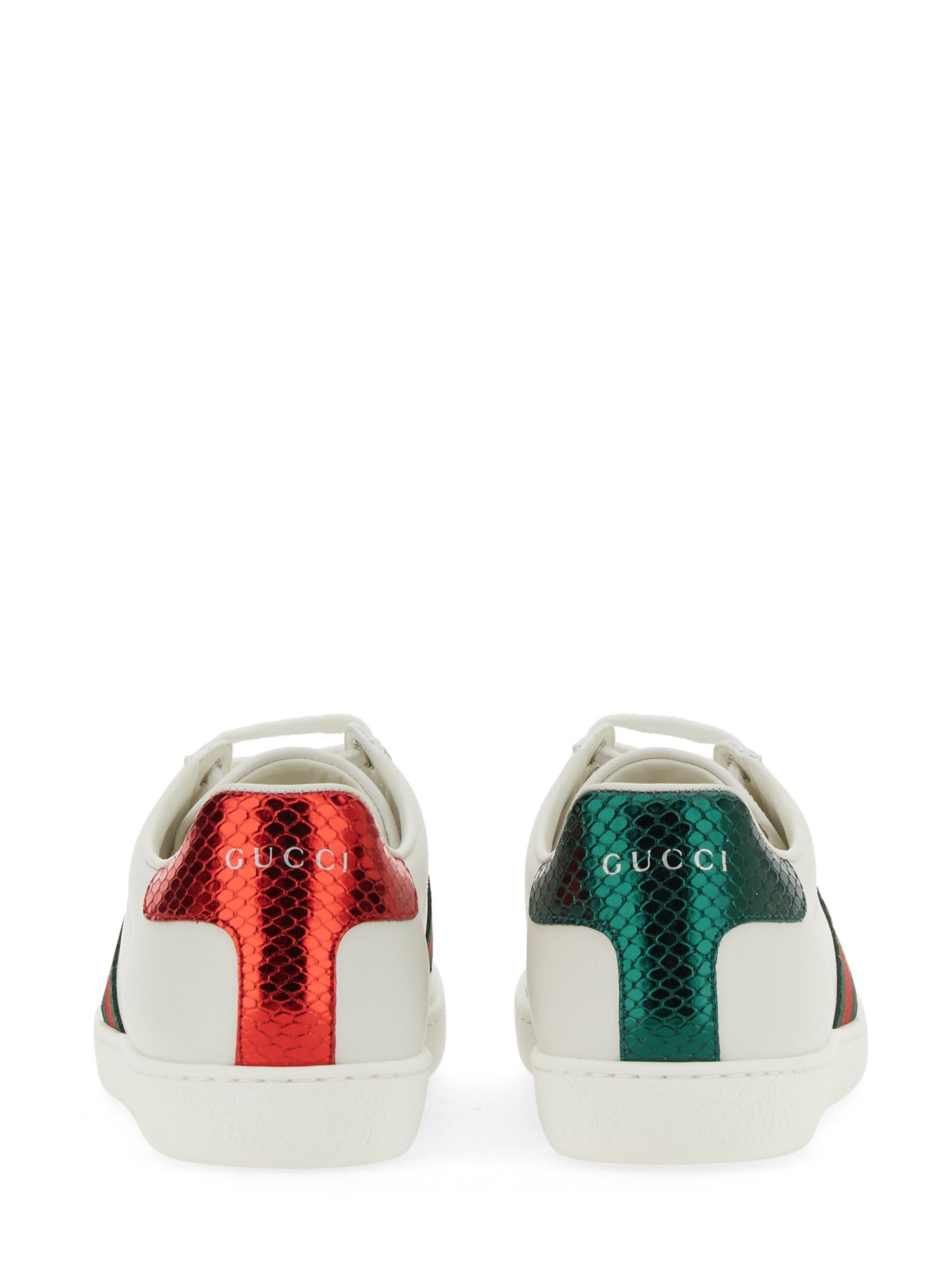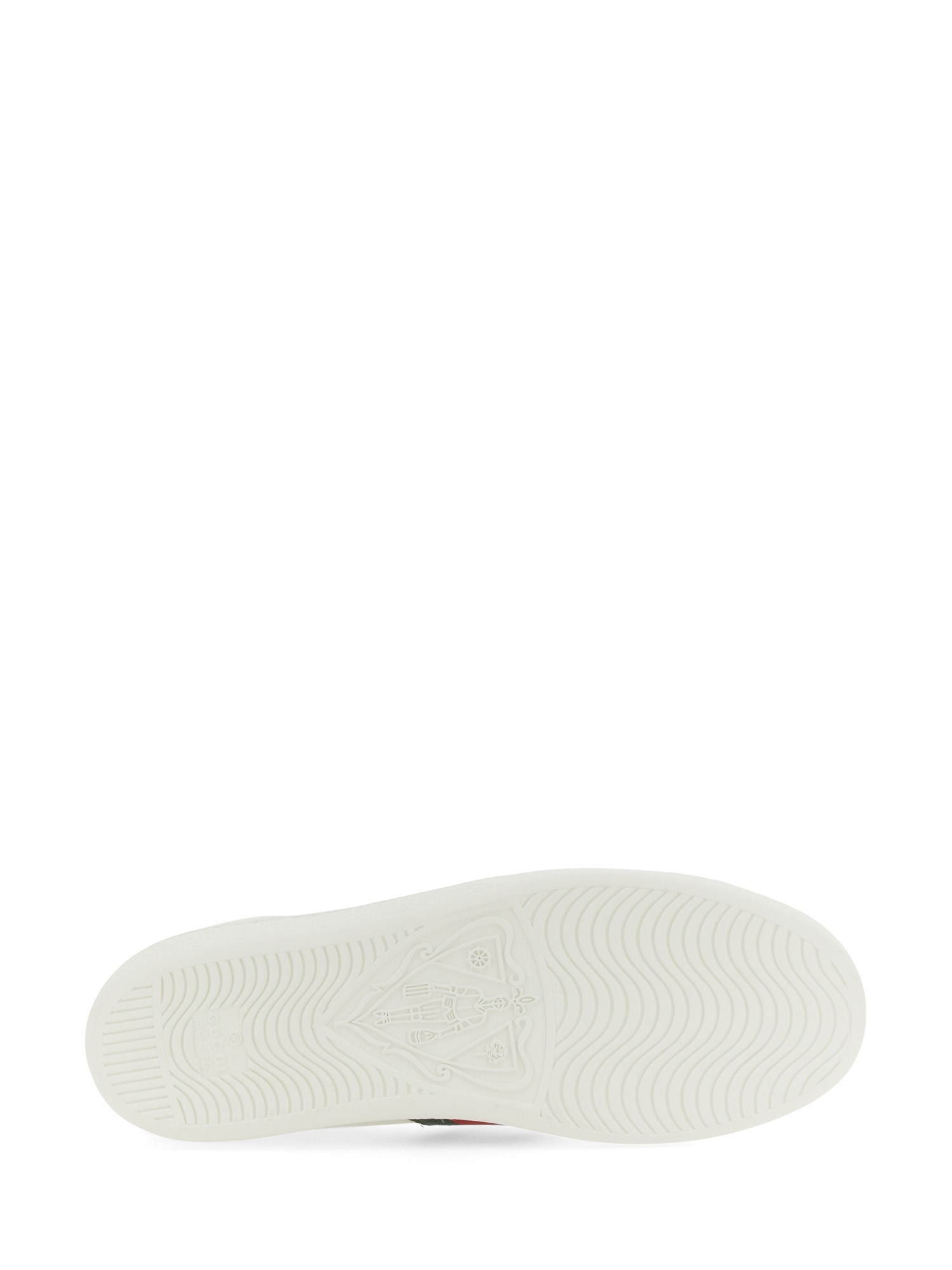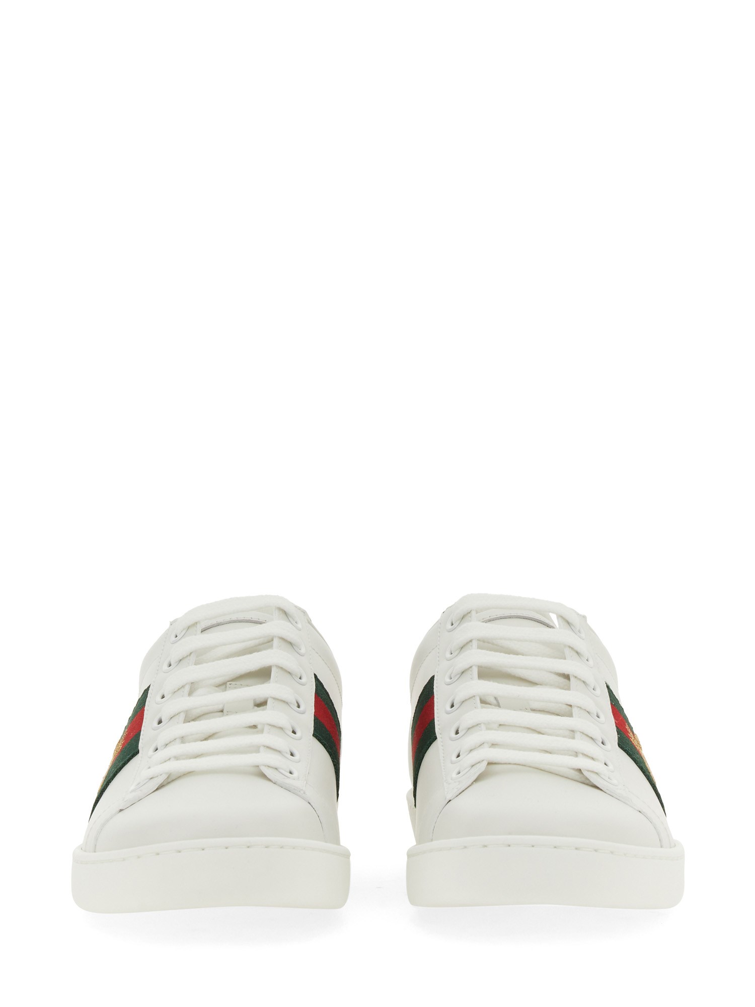 La classica sneaker low-top della Maison è impreziosita dall'ape ricamata in oro sul web verde e rosso. L'ape è un codice d'archivio introdotto per la prima volta nel prêt-à-porter di Gucci negli anni Settanta.