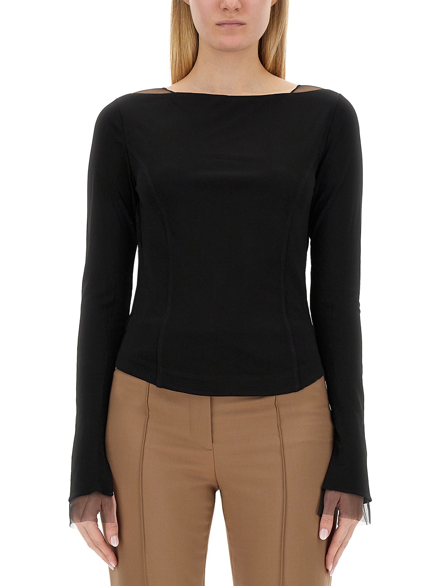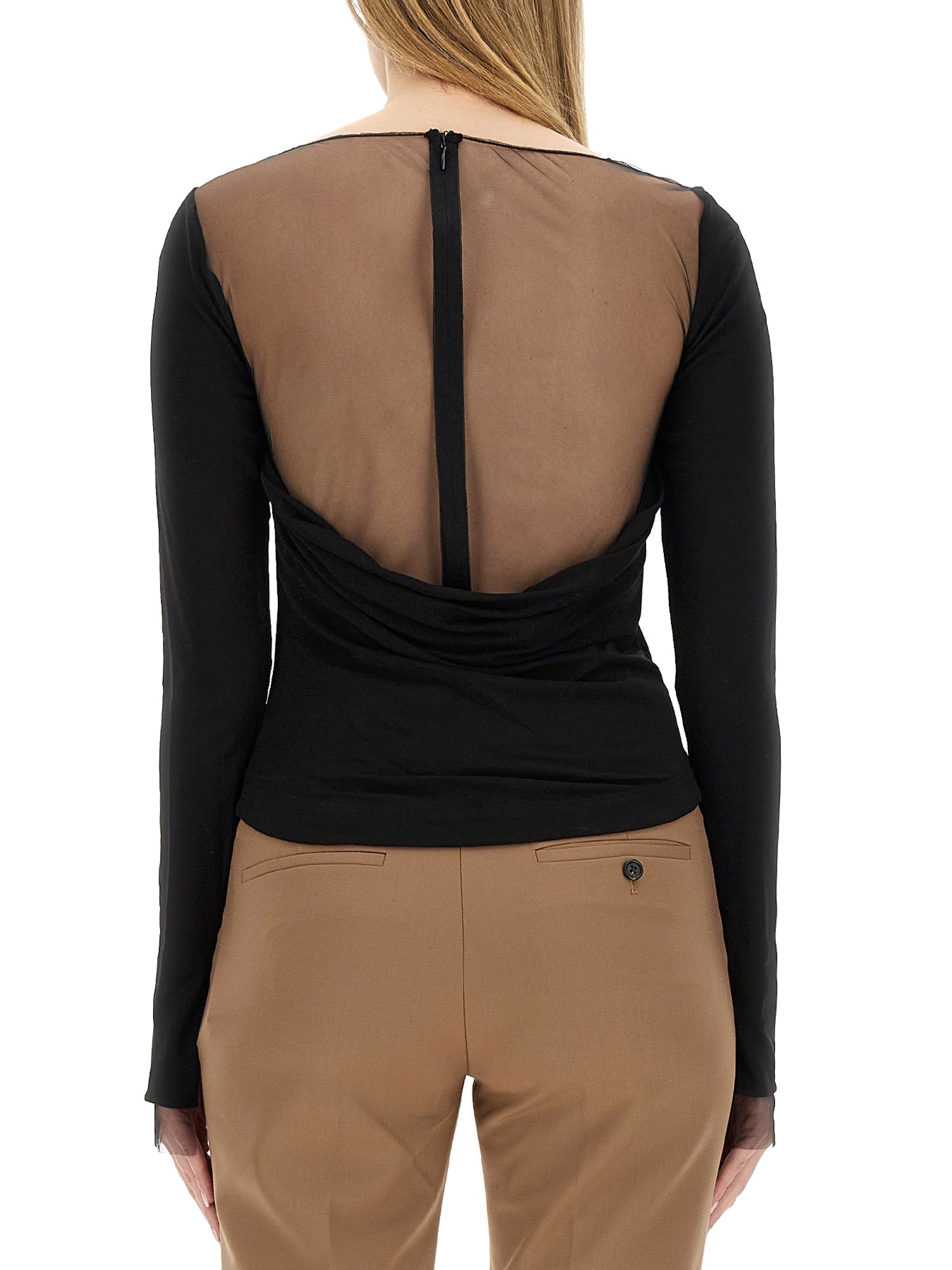 Elevate your wardrobe with the Helmut Lang Black Top, featuring an exquisite design that will surely turn heads. Crafted from lightweight fabric, this top exudes effortless elegance. The transparent panel on the back adds a touch of allure, while the long sleeves provide comfortable coverage. Whether you're dressing up for a special occasion or adding a statement piece to your everyday look, this top is a must-have addition to your collection.