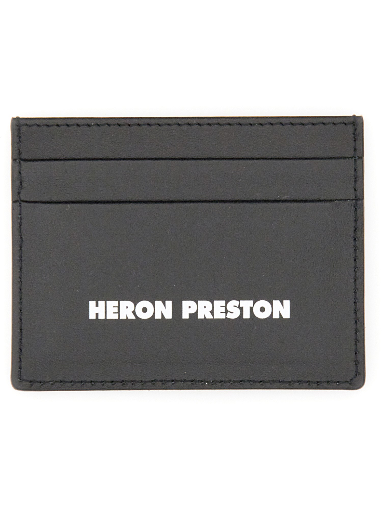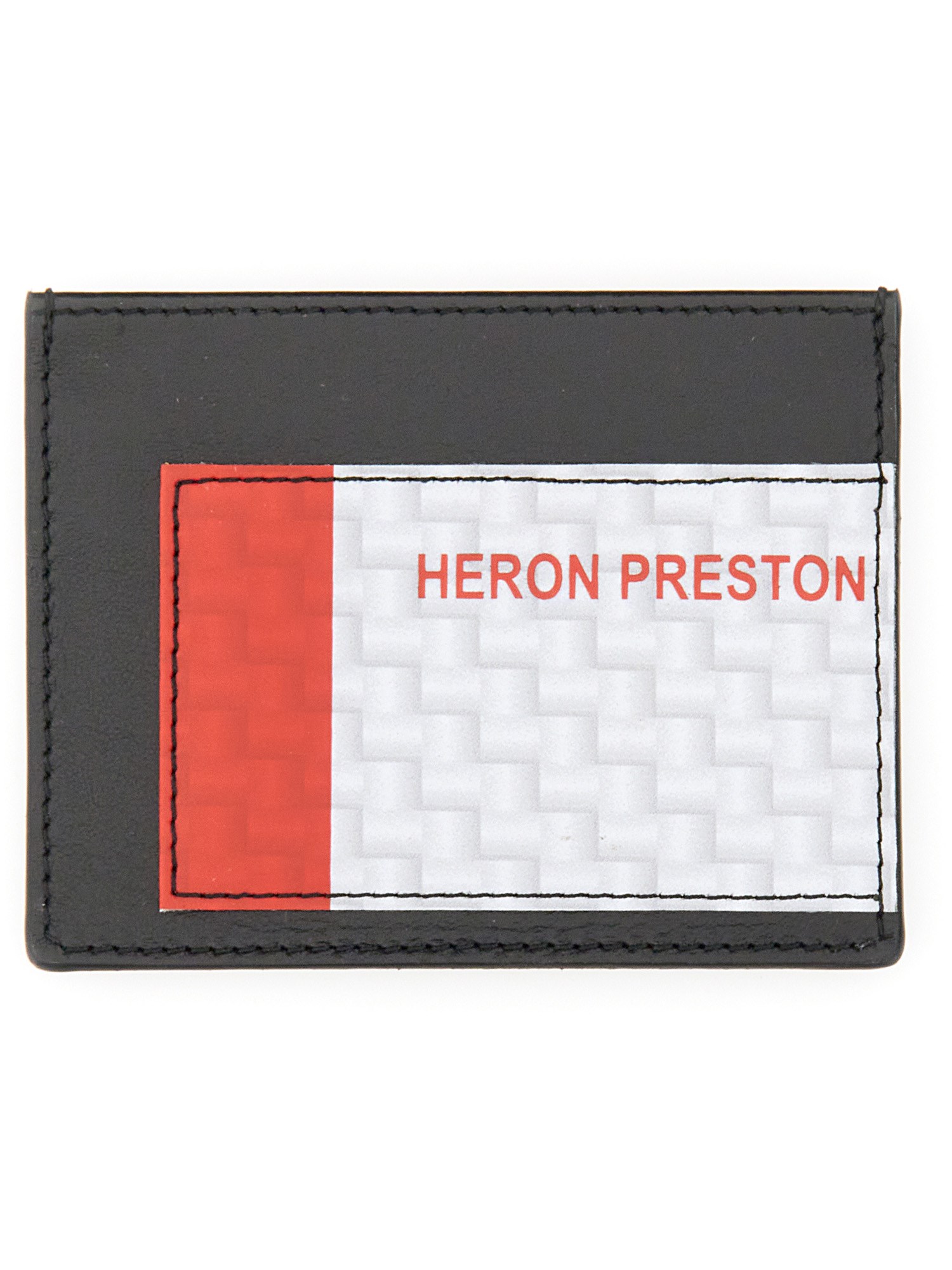 This is a slim leather card case from the house of Heron Preston, designed to hold a lot of cards in a slim, elegant case. This wallet is small enough to carry in a pocket or purse, and features back logo patch and front logo print. The leather card holder has two card slots.