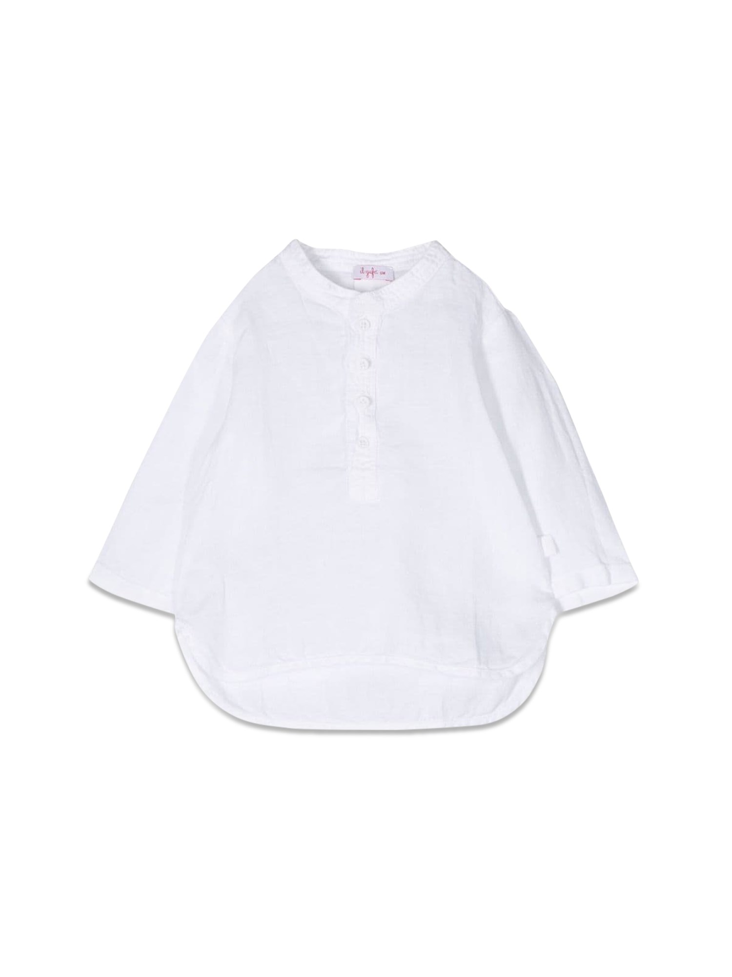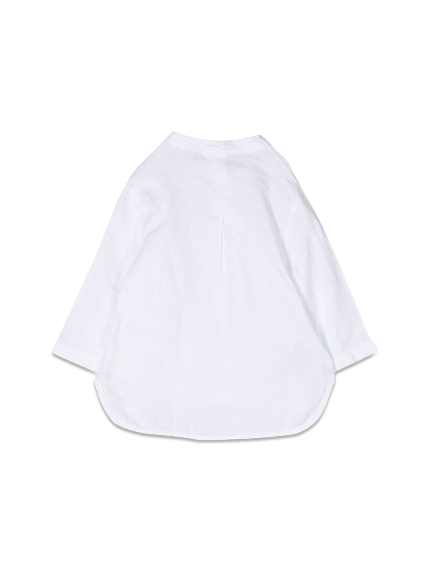 This is a soft, smooth, sheer, and beautiful long-sleeve shirt from Il Gufo. The shirt is made of an incredibly soft and smooth fabric that is perfect for the summer. It is made of a sheer fabric that is perfect for the summertime. The shirt has a round neckline and a front button closure.