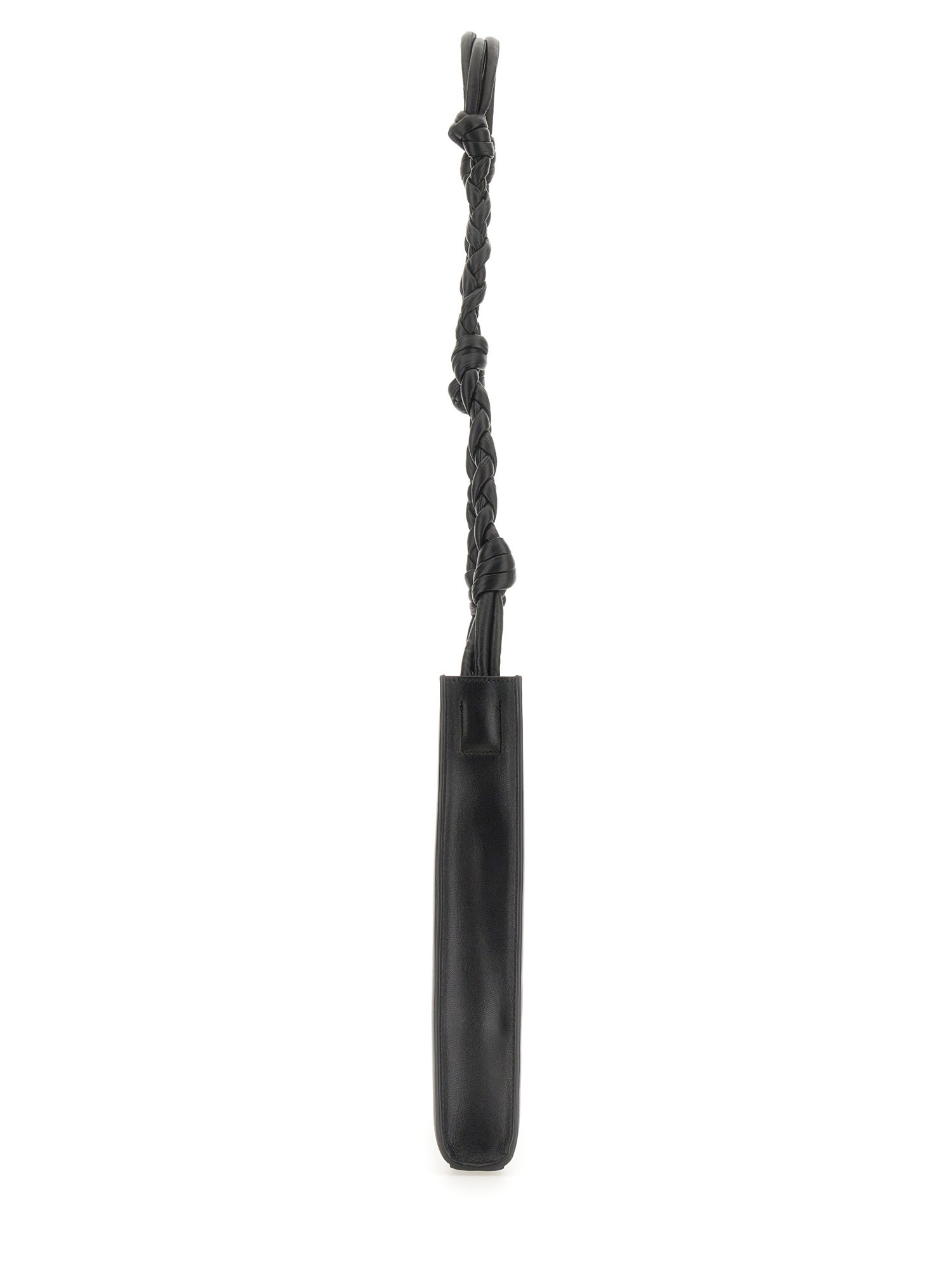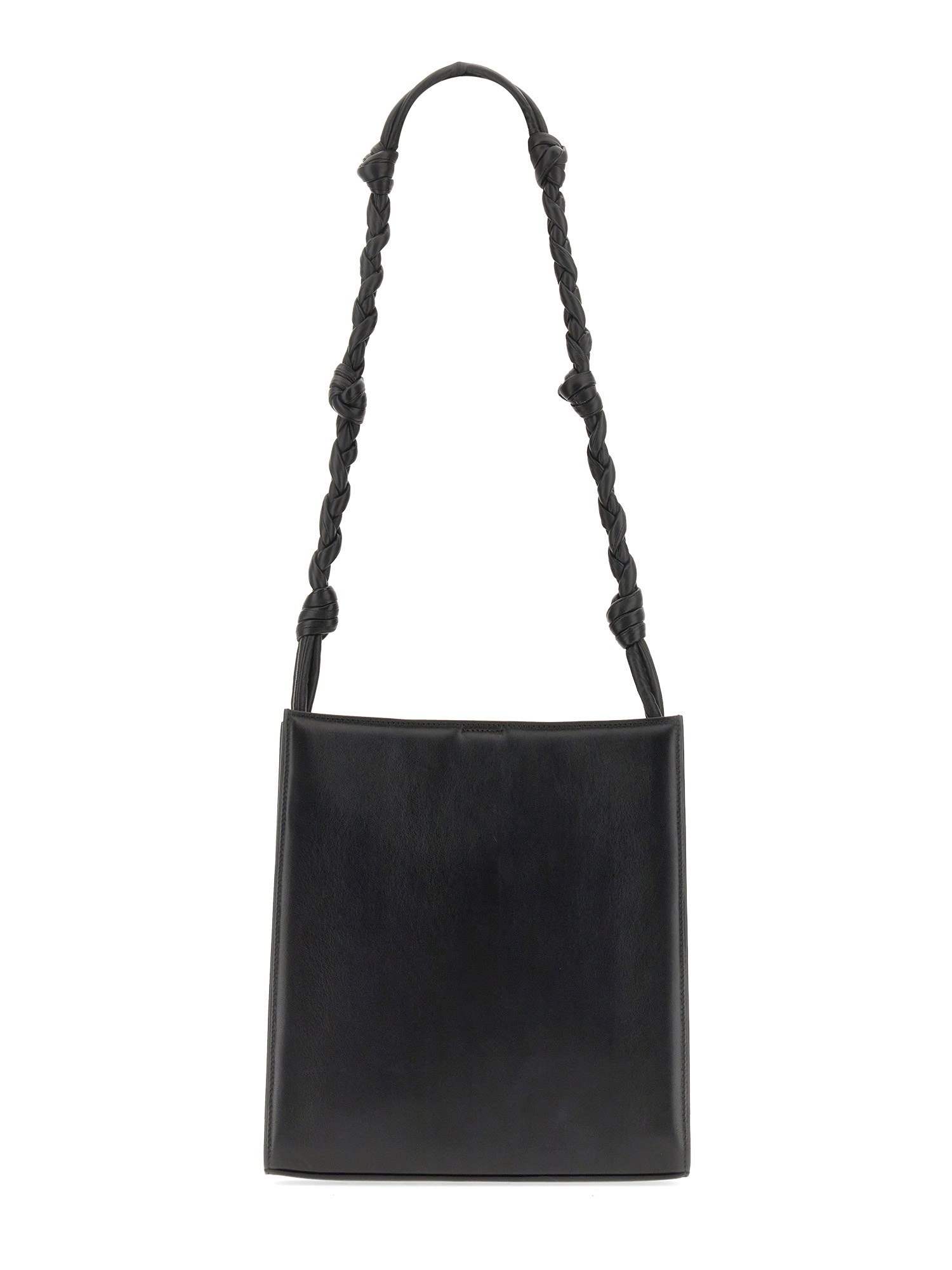 The medium padded tangle bag from Jil Sander is perfect for travel, shopping, or a weekend getaway. It is a sleek and modern bag with a black colour and classic silhouette. The bag is made of soft and durable leather and has a large main compartment and shoulder strap with knots. It also has interior pockets for easy organization.