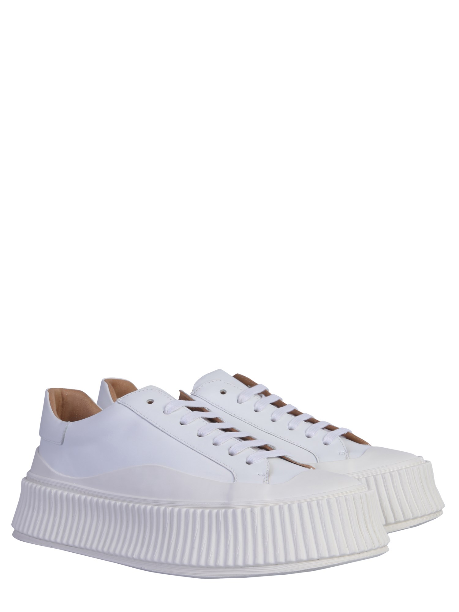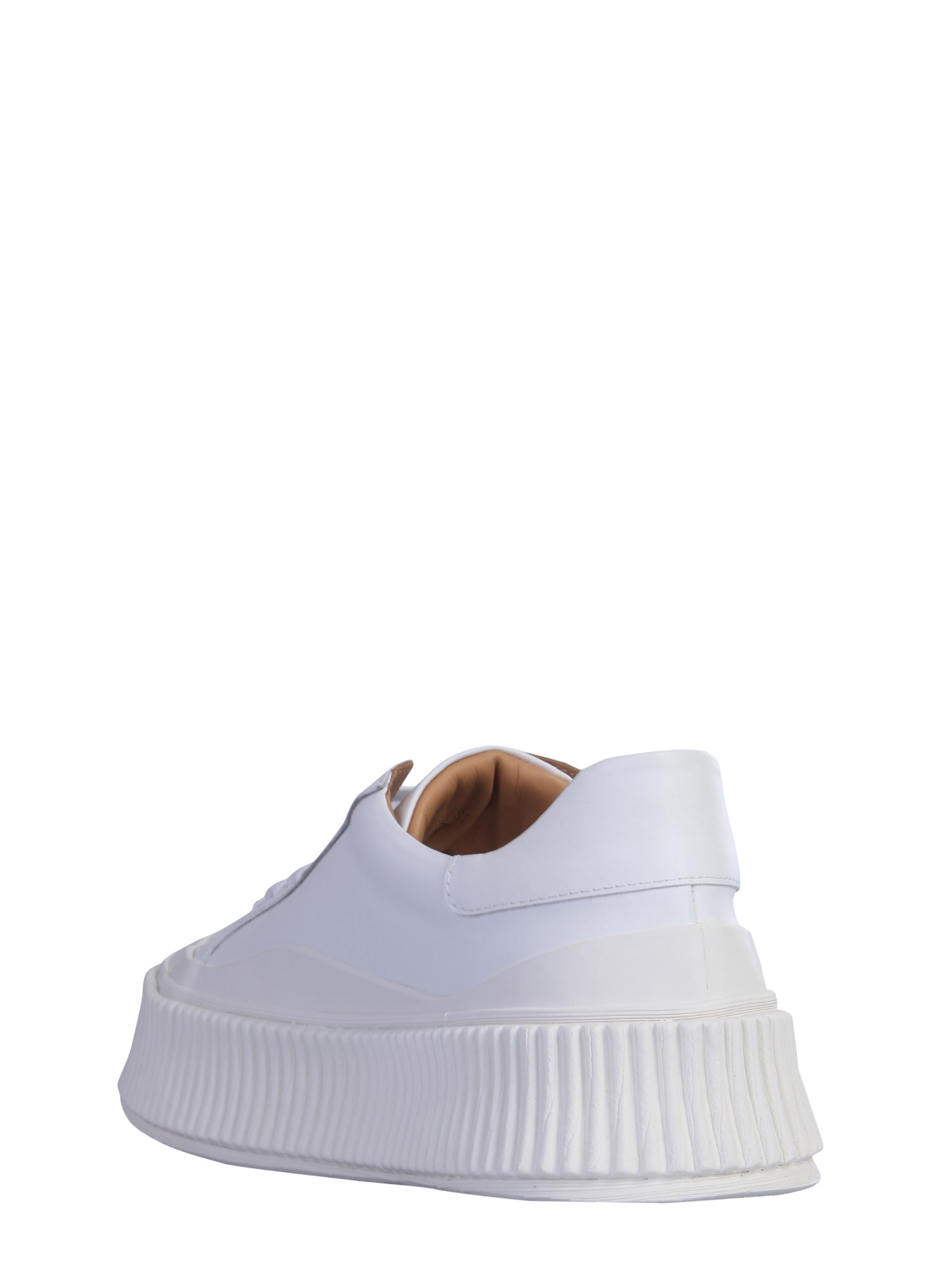 When stylish looks meet enduring quality, it looks like these leather sneakers from Jil Sander. Made of calf leather, the shoes have a sleek body. The vulcanized rubber sole is textured and have a height of 4cm. They are finished with leather lining for added durability. Match them with jeans and a tee to look cool.