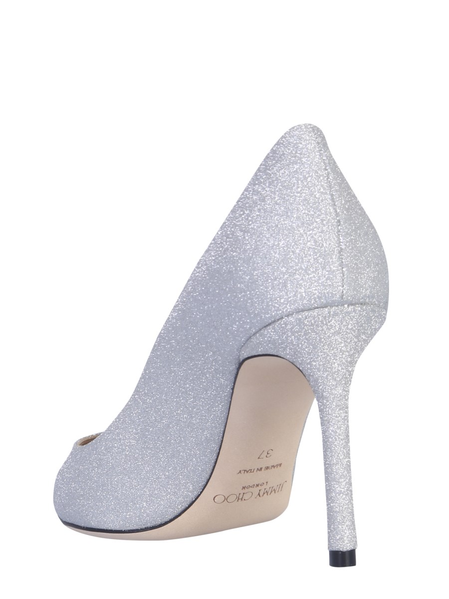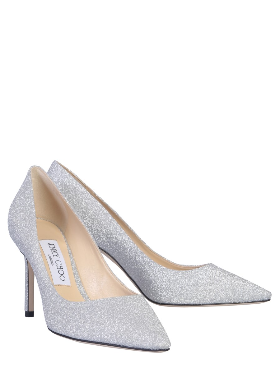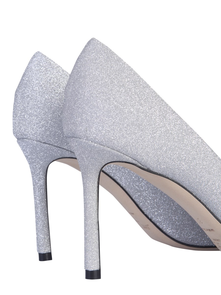 The Romy 85 pumps offered by Jimmy Choo are a classic pair of shoes to upgrade your collection of accessories. They are made from 100% leather material that makes them strong and durable. With fine glitters spread all around their surface, these shoes are perfect to pair with a matching evening dress.