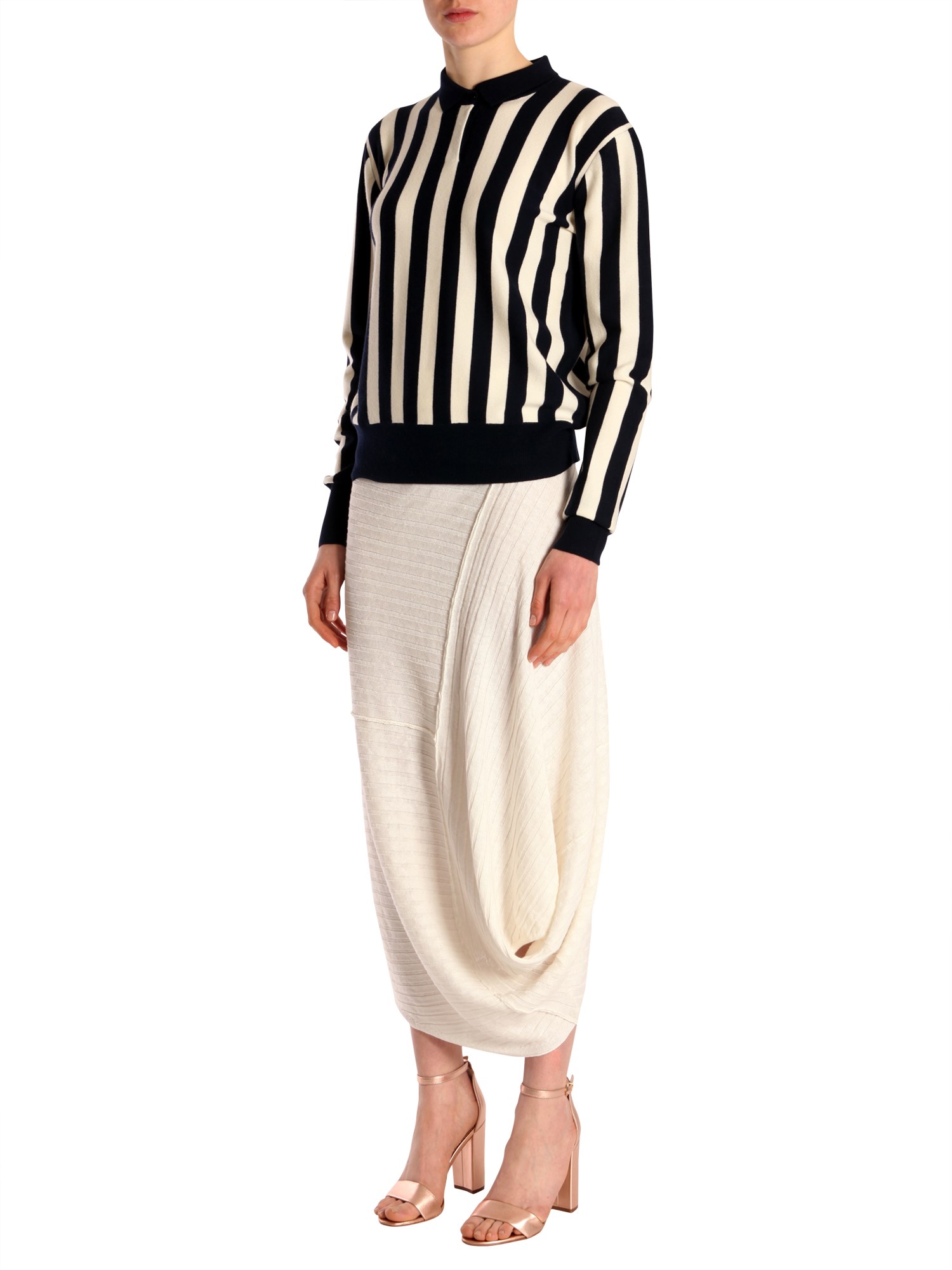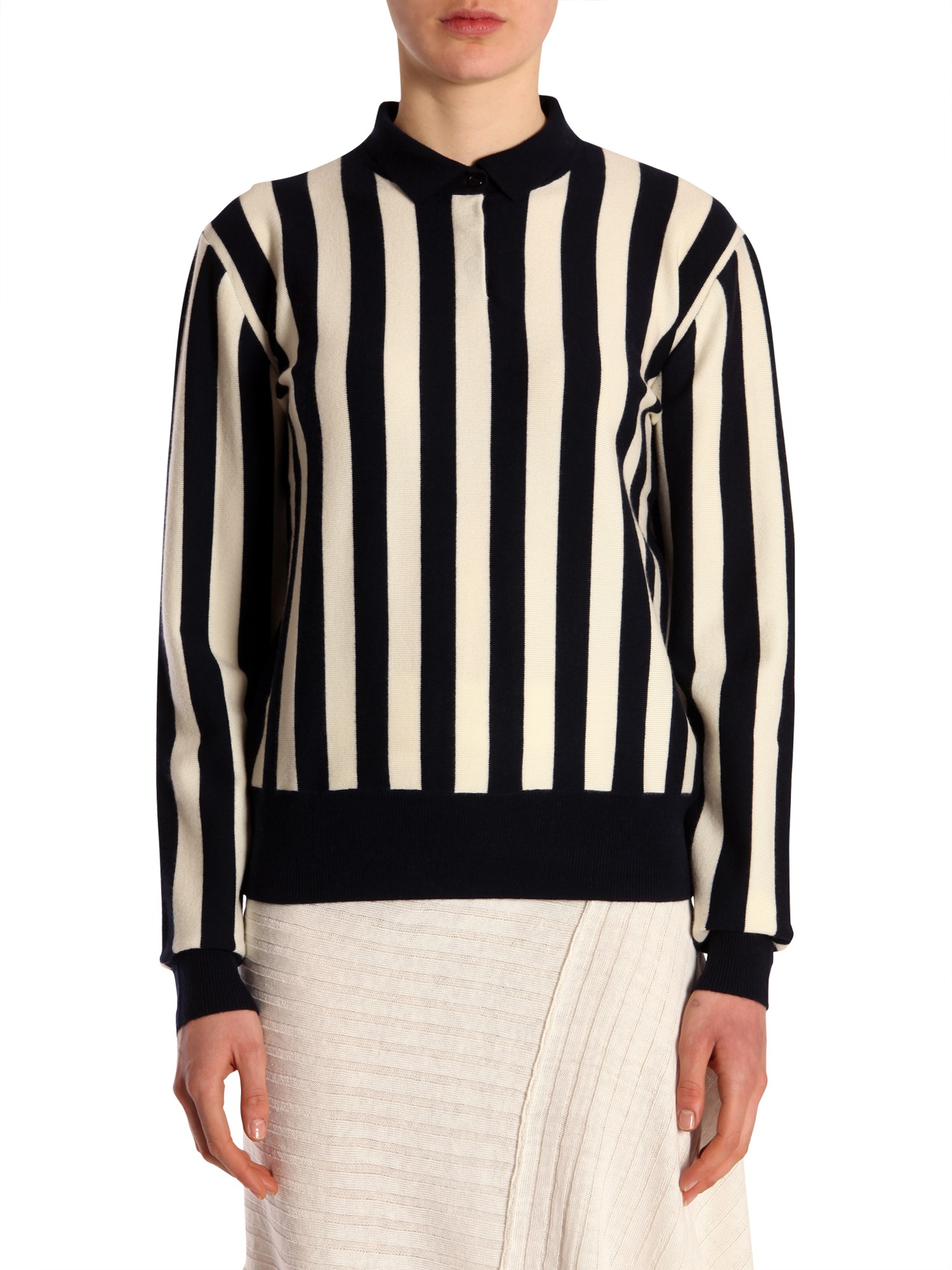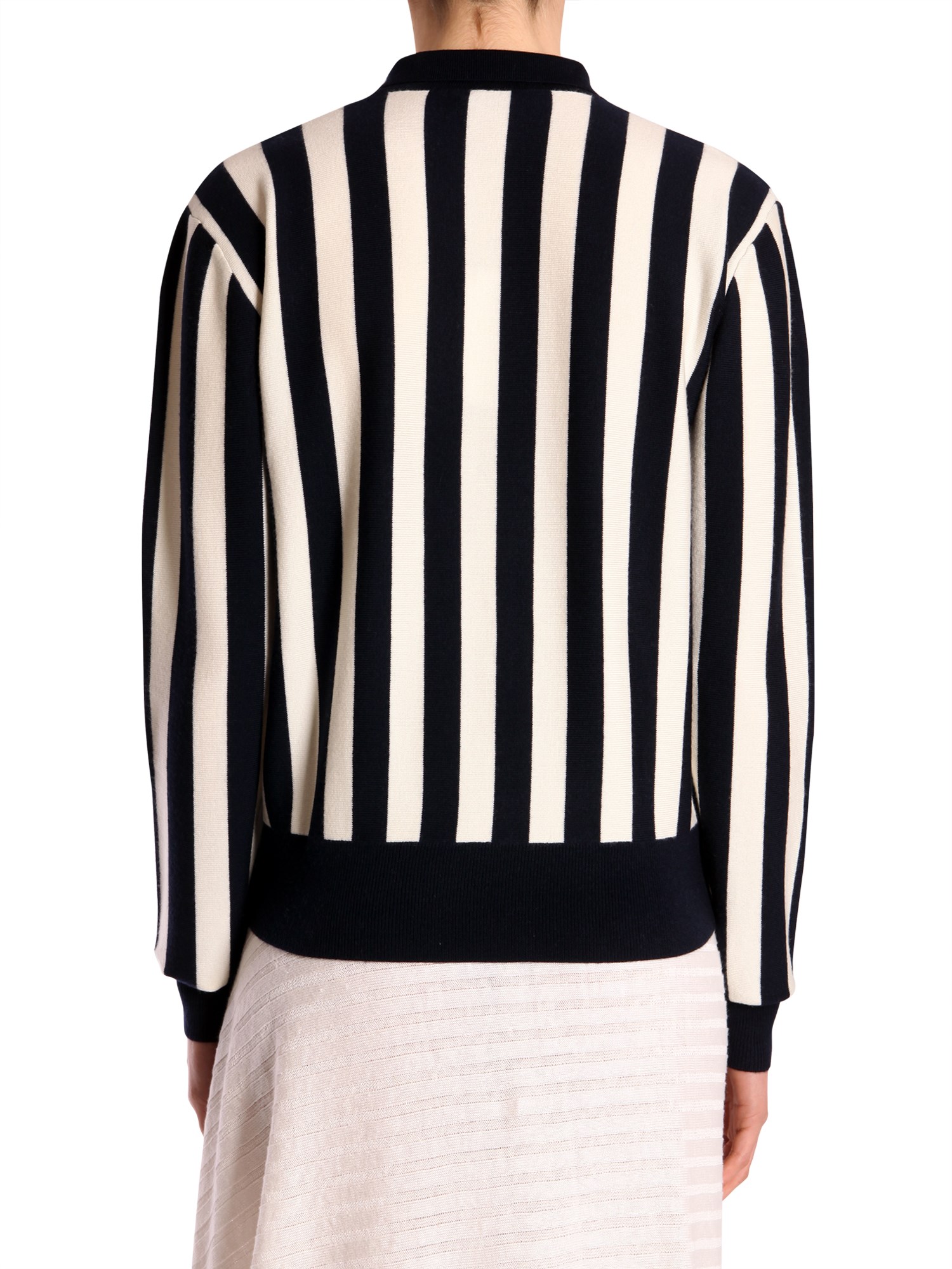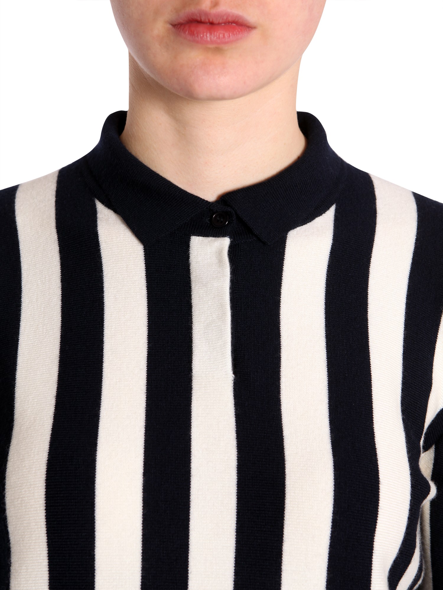 - SPREAD COLLAR- FRONT HALF BUTTON CLOSURE- LONG SLEEVE- RIBBED COLLAR, CUFFS AND HEM- ALL-OVER STRIPED FABRIC- 95% WOOL, 4% POLYAMIDE, 1% ELASTHANE- MODEL IS WEARING SIZE S