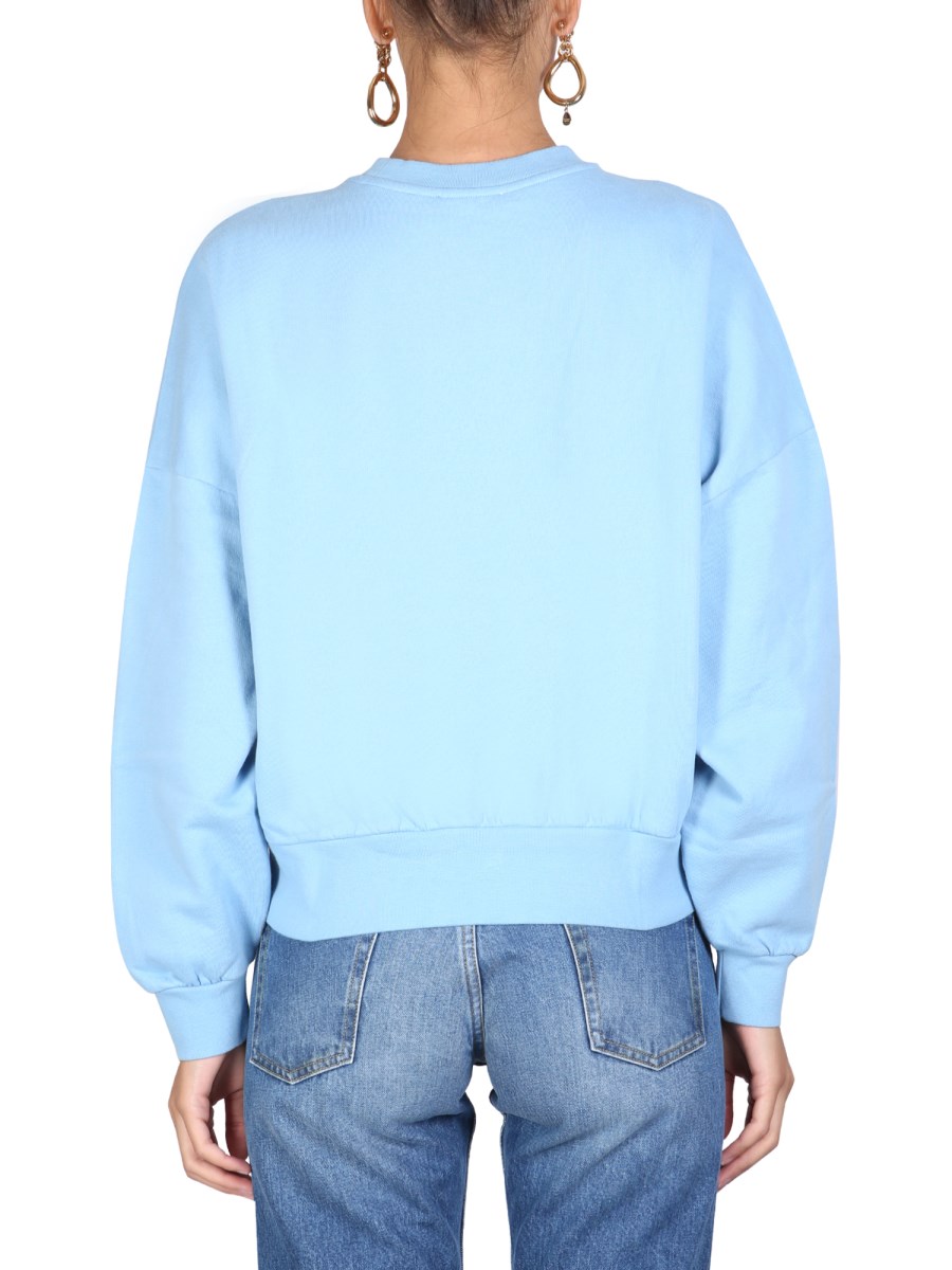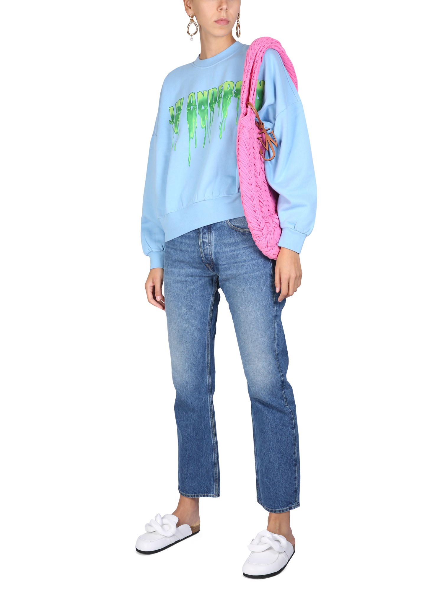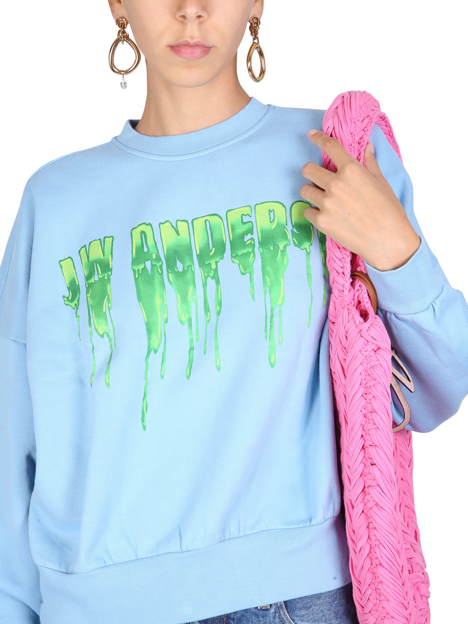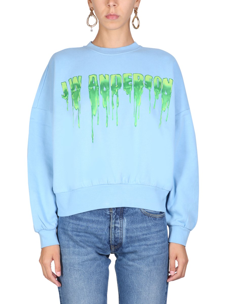 A cotton slime logo sweatshirt by JW Anderson is a top made of cotton. It is soft and comfy, and will keep you warm. It has a blue sweatshirt with a green logo on the front. It has a ribbed collar, cuffs and hem, and has a slime logo print on the front.