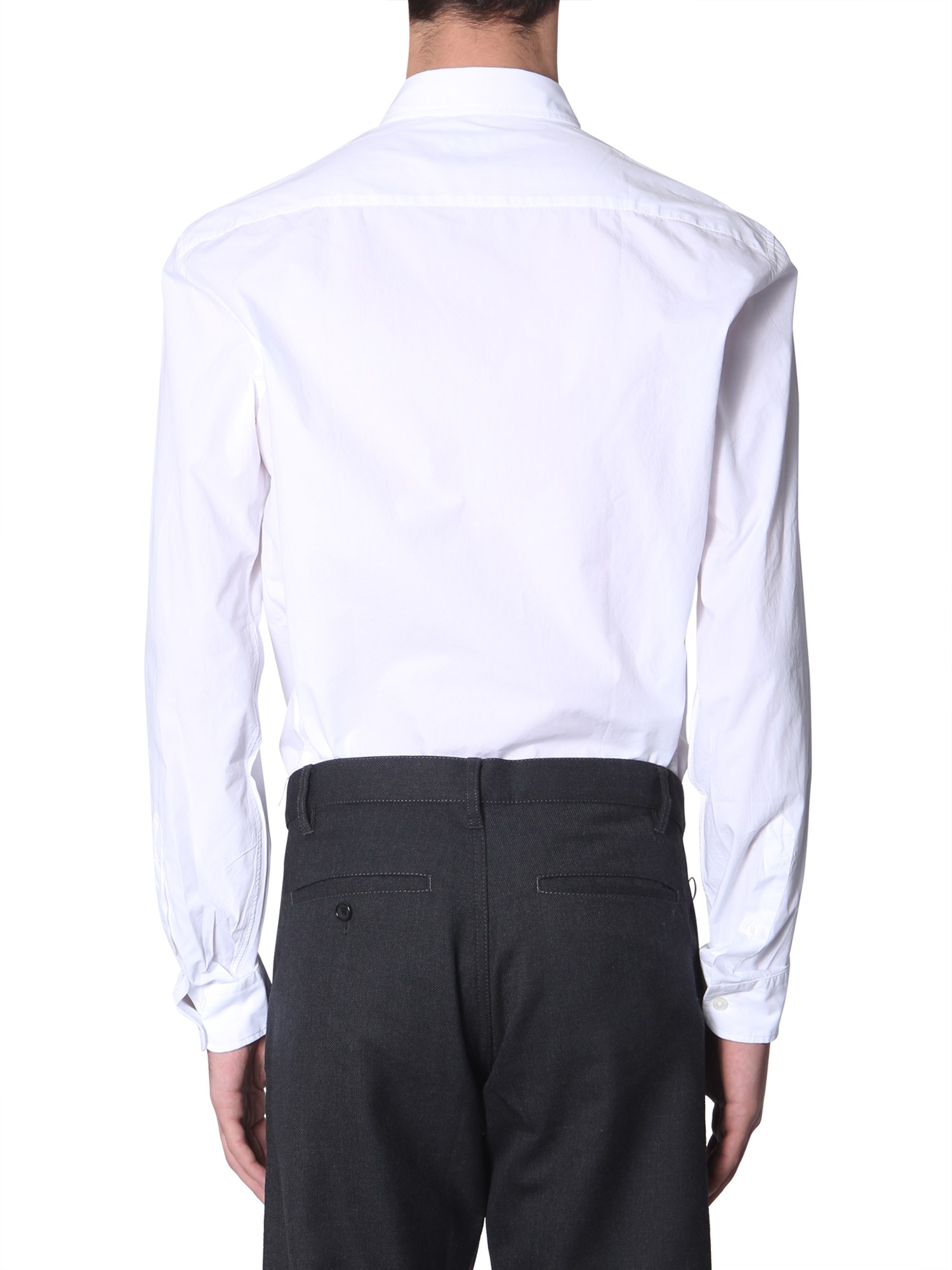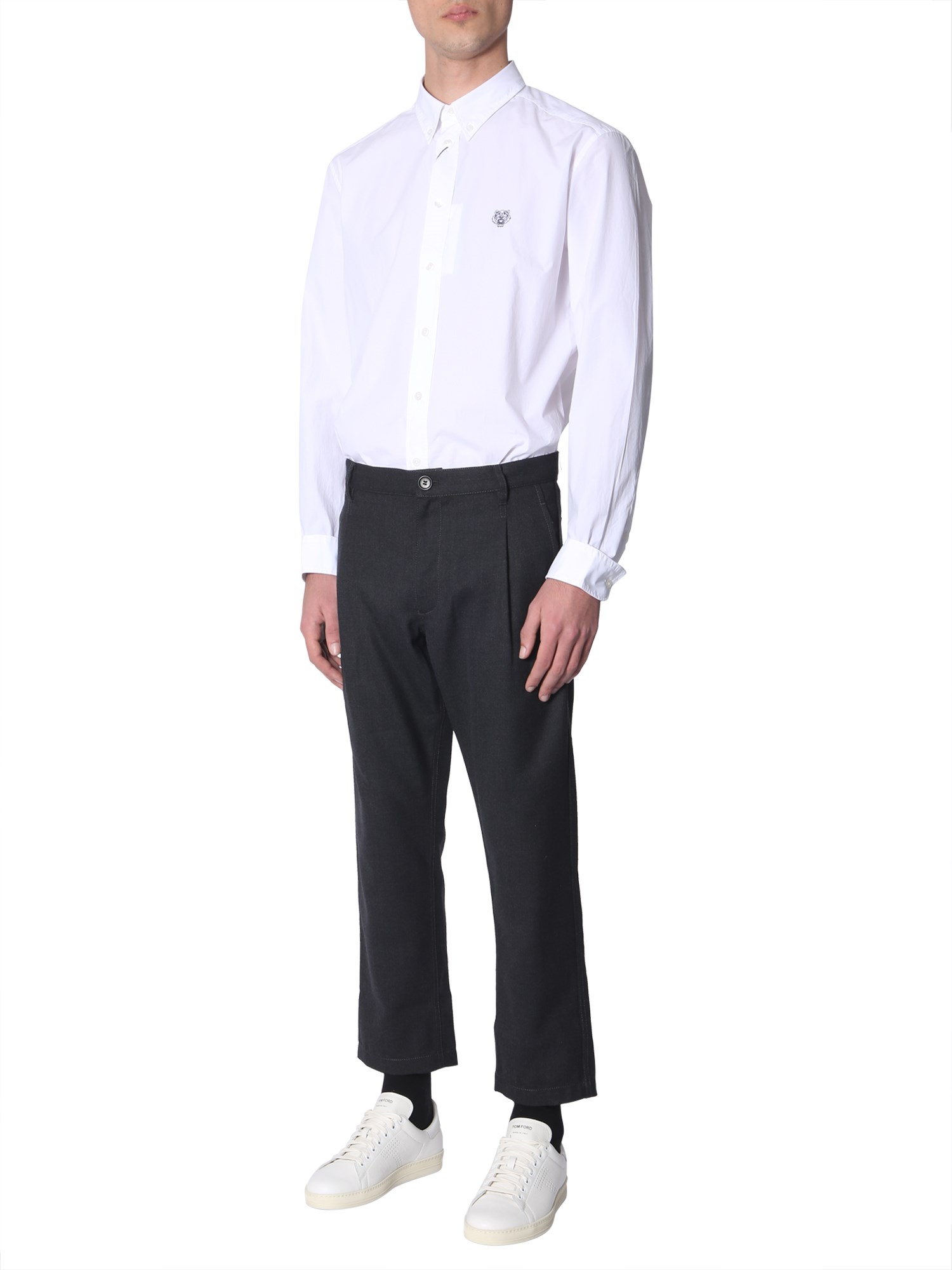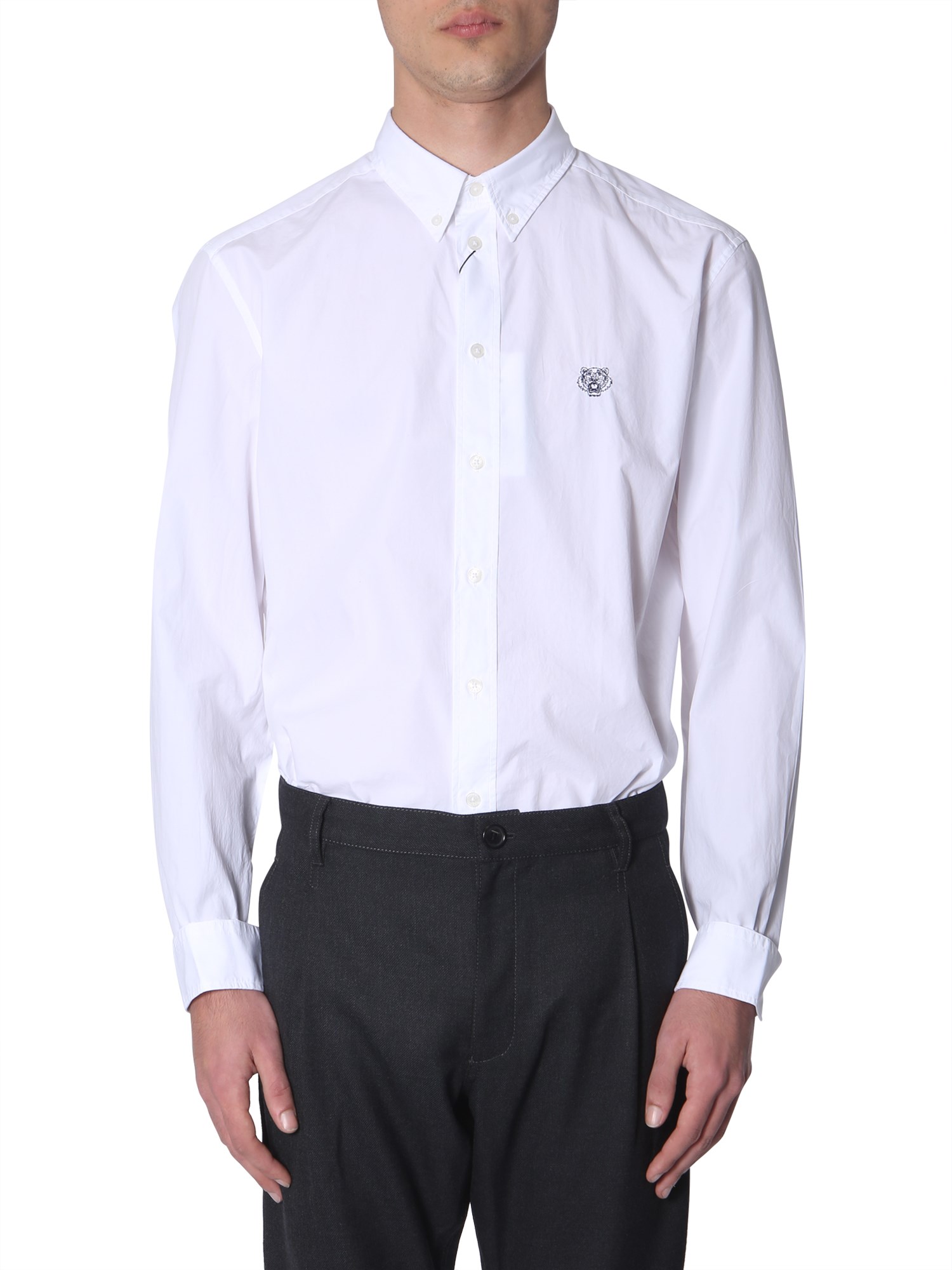 Dress elegantly in the button-down cotton shirt by Kenzo. The shirt has a formal feel to it but can be worn casually as well. This shirt can be worn under a coat for that formal appeal but can be paired with a jeans as well. There is an embroidered tiger on the front that adds a nice edge to it.