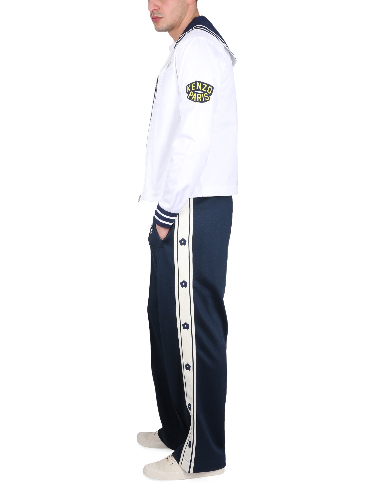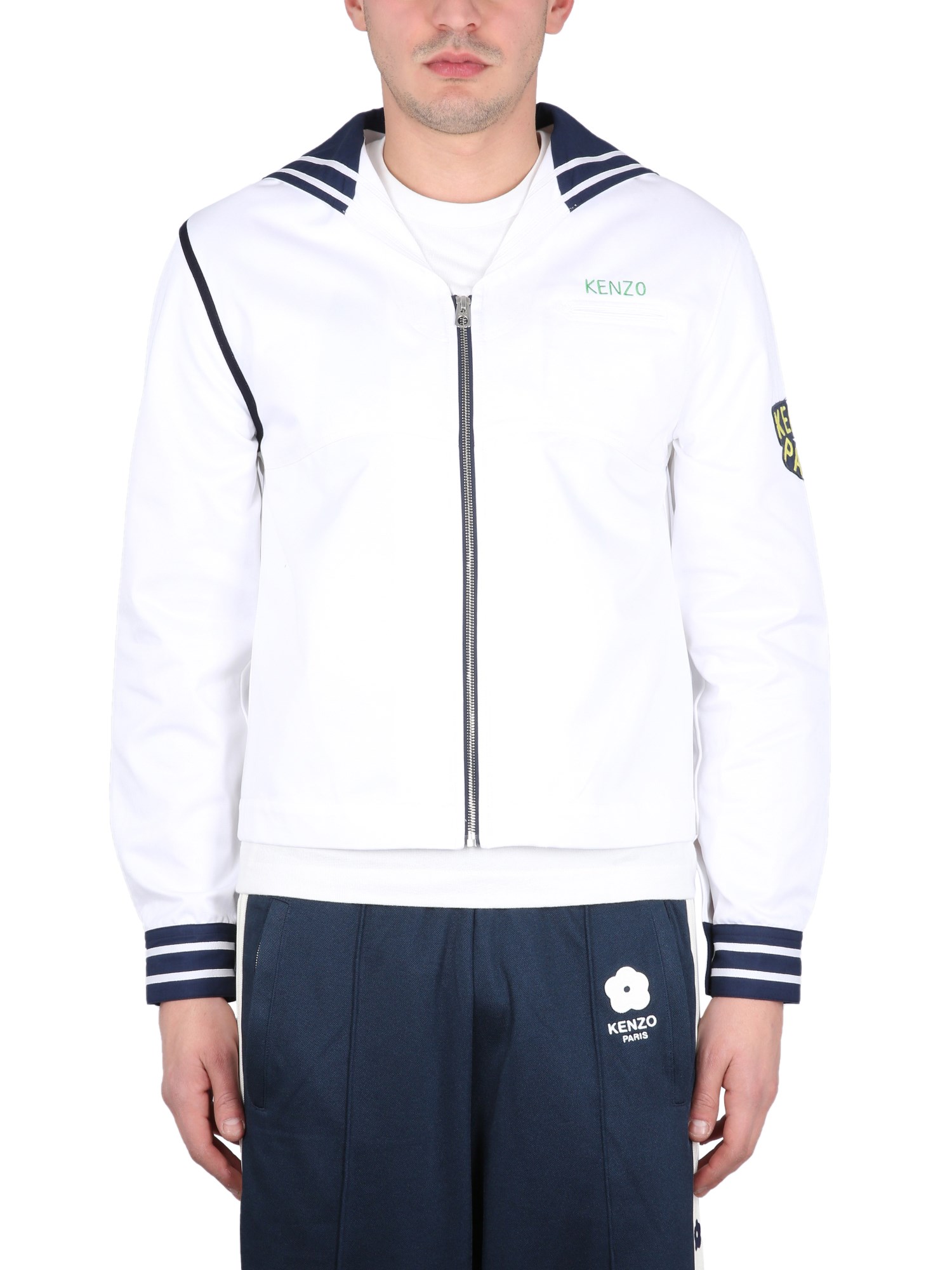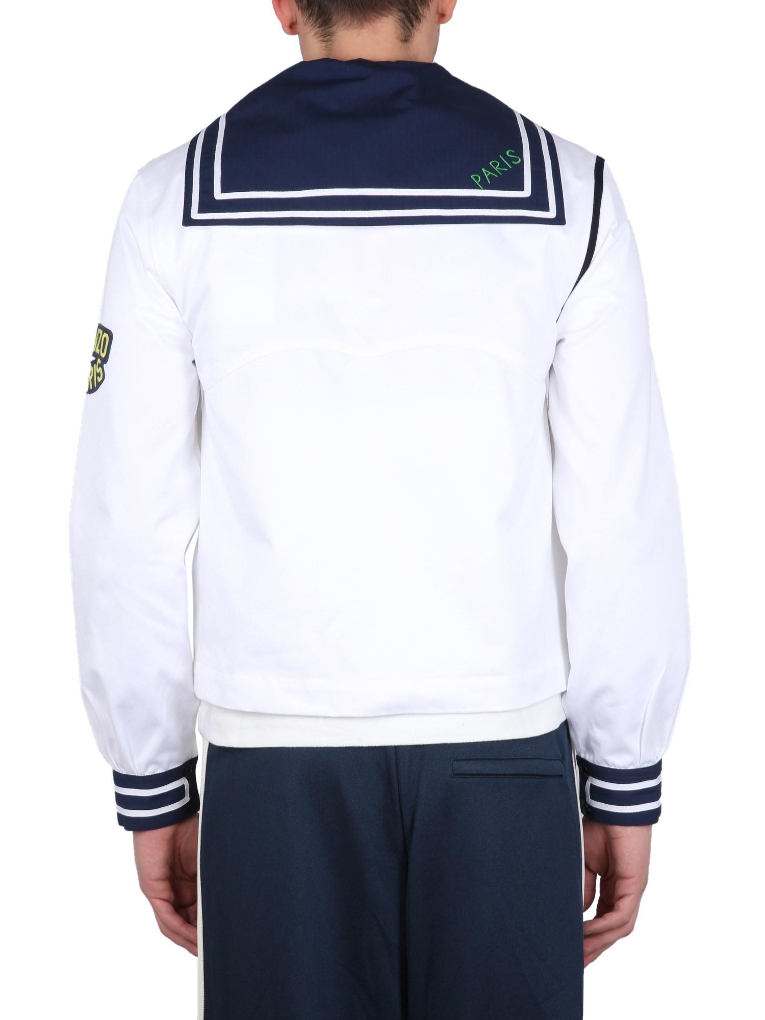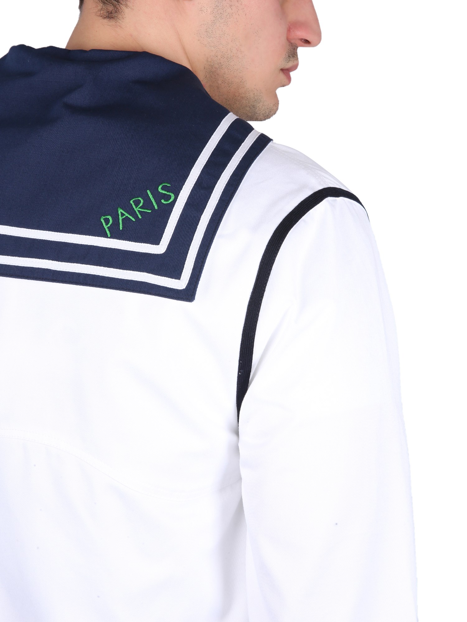 This shirt jacket is inspired by the 1980s Parisian fashion scene's fascination with the sailor uniform. This influence is embodied by the smock-style collar and stripes. Pair this top with loose-fitting jeans and oversized loafers for a workwear look.