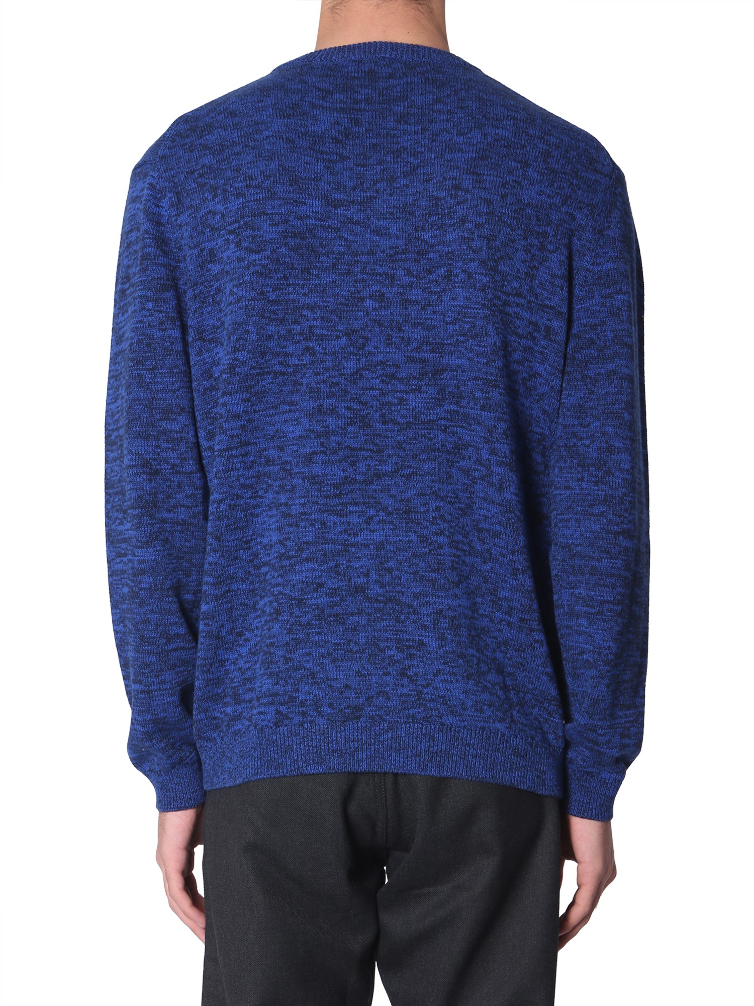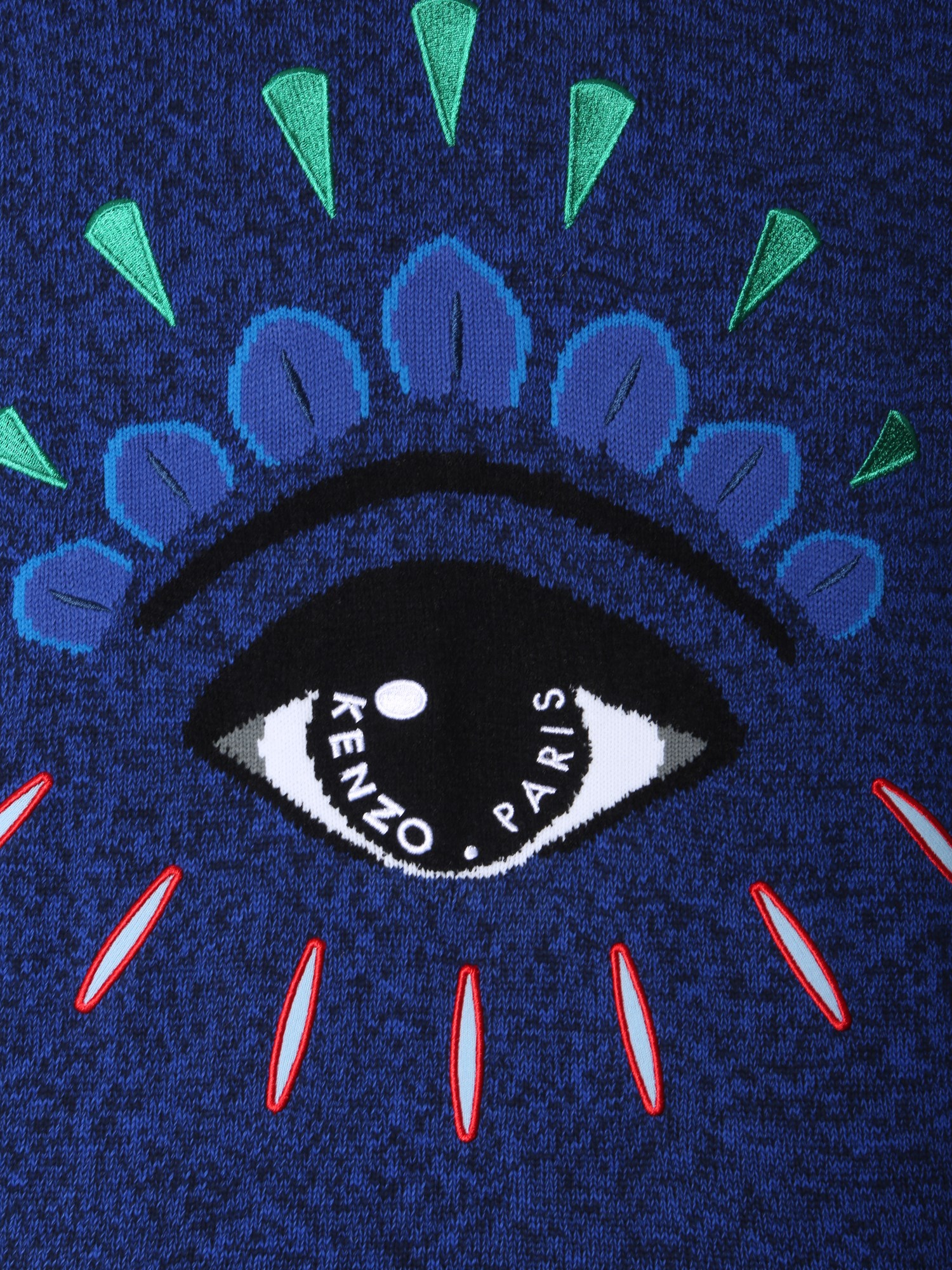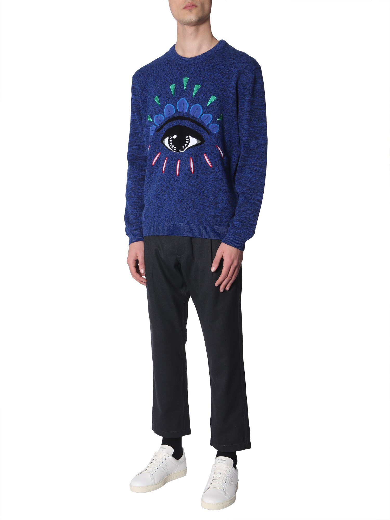 Layer up this blue coloured, crew neck sweater by Kenzo and get compliments for your choice. It has long sleeves and has ribbed wrist, neck and hem. It is made up of 100% wool to keep you warm in winters and has an eye jacquard print on its front that adds to its iconic appeal.
