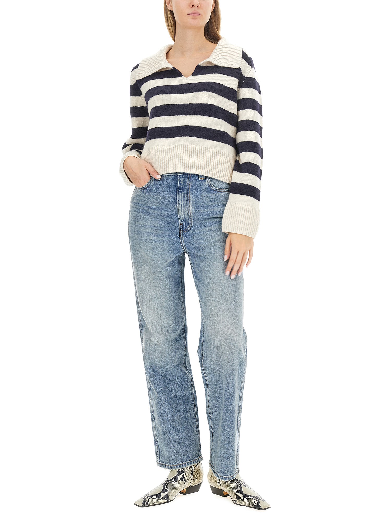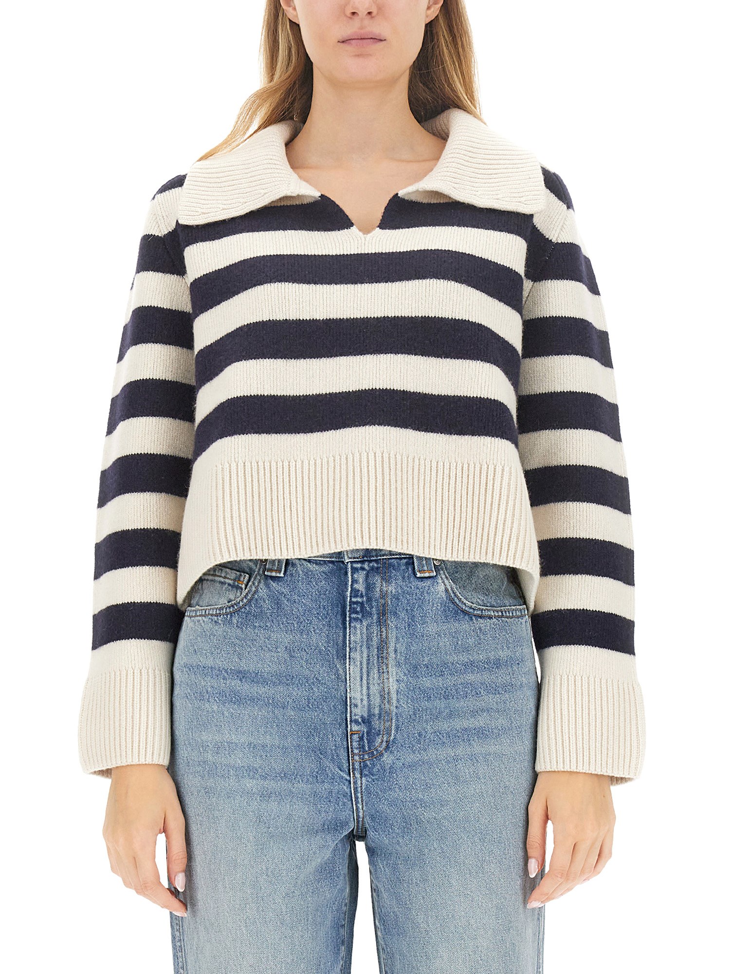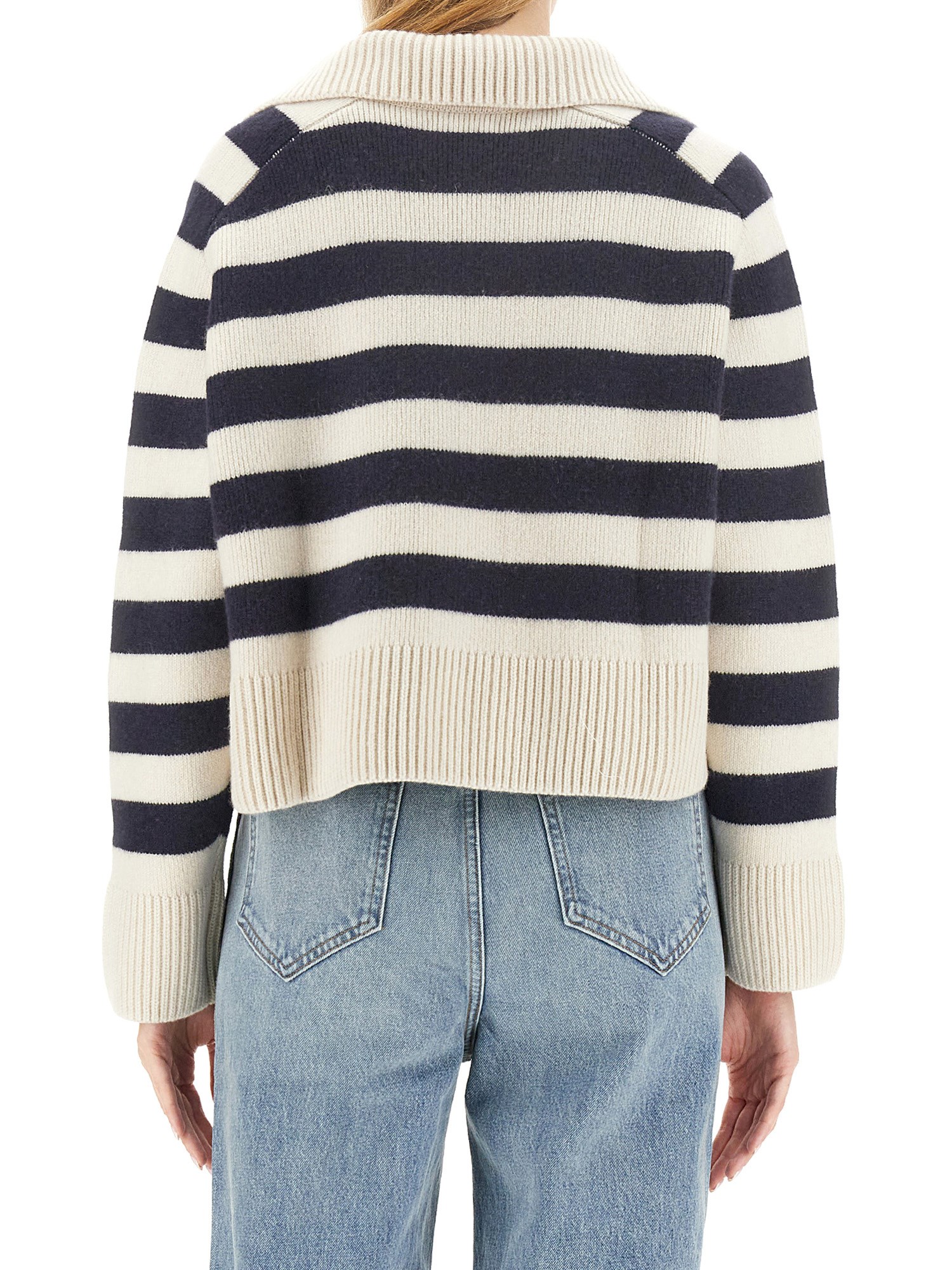 Pre-Fall's intensified silhouettes, heightened tactility, and decisive yet playful details come together in this boldly striped pullover, which reimagines the classic polo silhouette in luscious cashmere. Made memorable by a boldly scaled collar, notched neckline, a swingy silhouette, and dropped shoulder seams, it is finished with fisherman's-rib knit trim at the collar, hem, and cuffs.