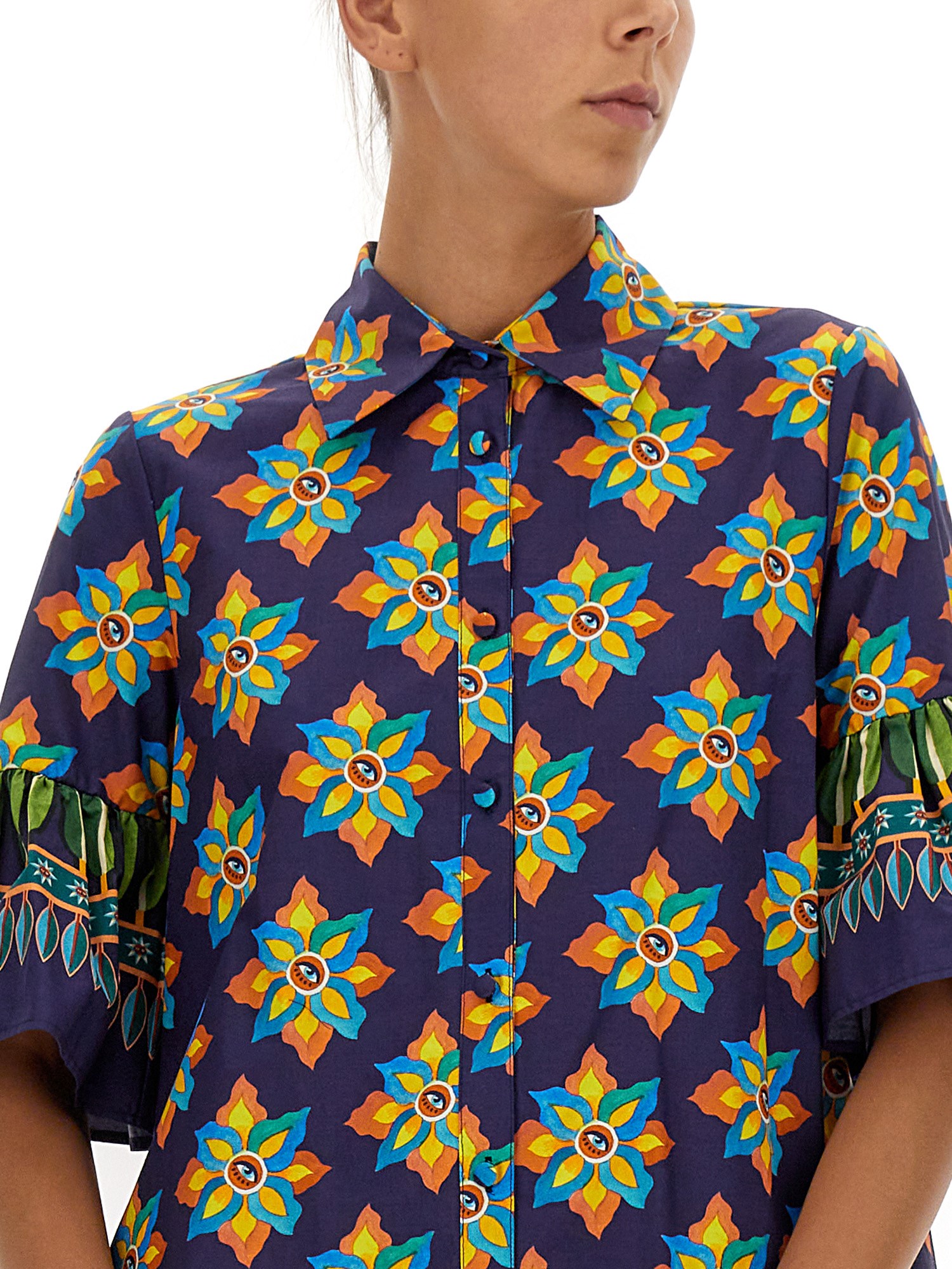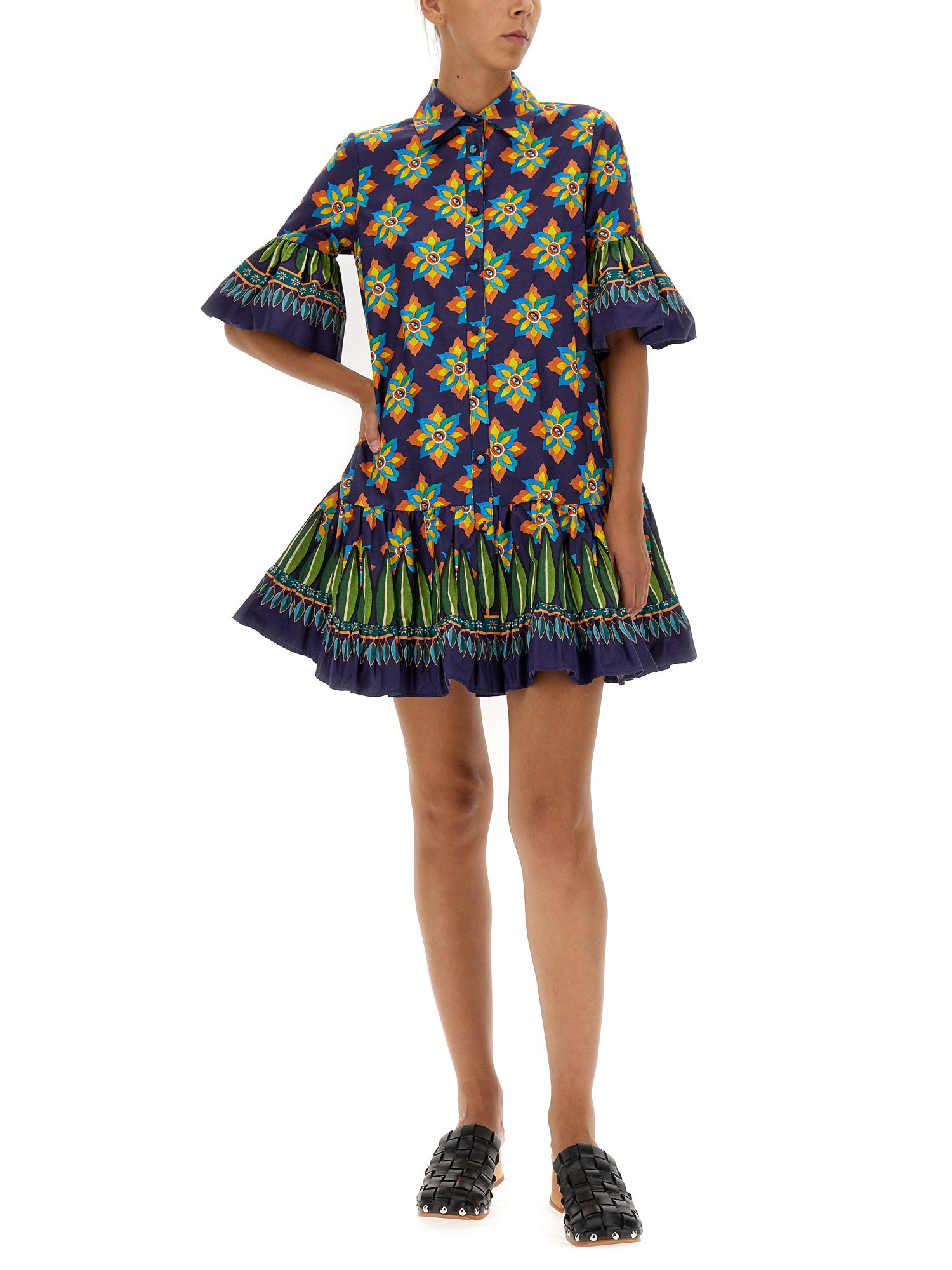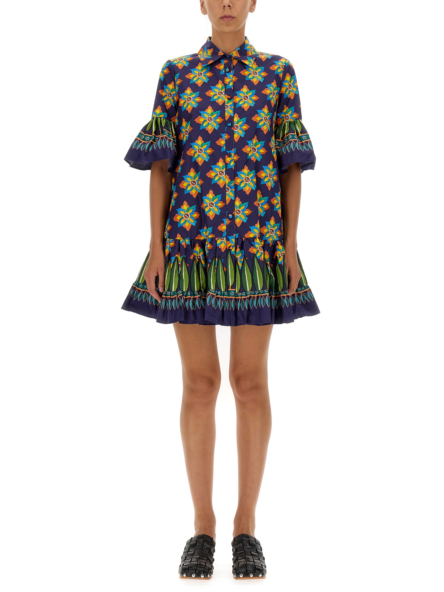 - SHIRT COLLAR- FRONT BUTTON CLOSURE- SLEEVES AND BOTTOM WITH FLOUNCE- 100% COTTON- MODEL IS 180 CM TALL AND WEARS SIZE S