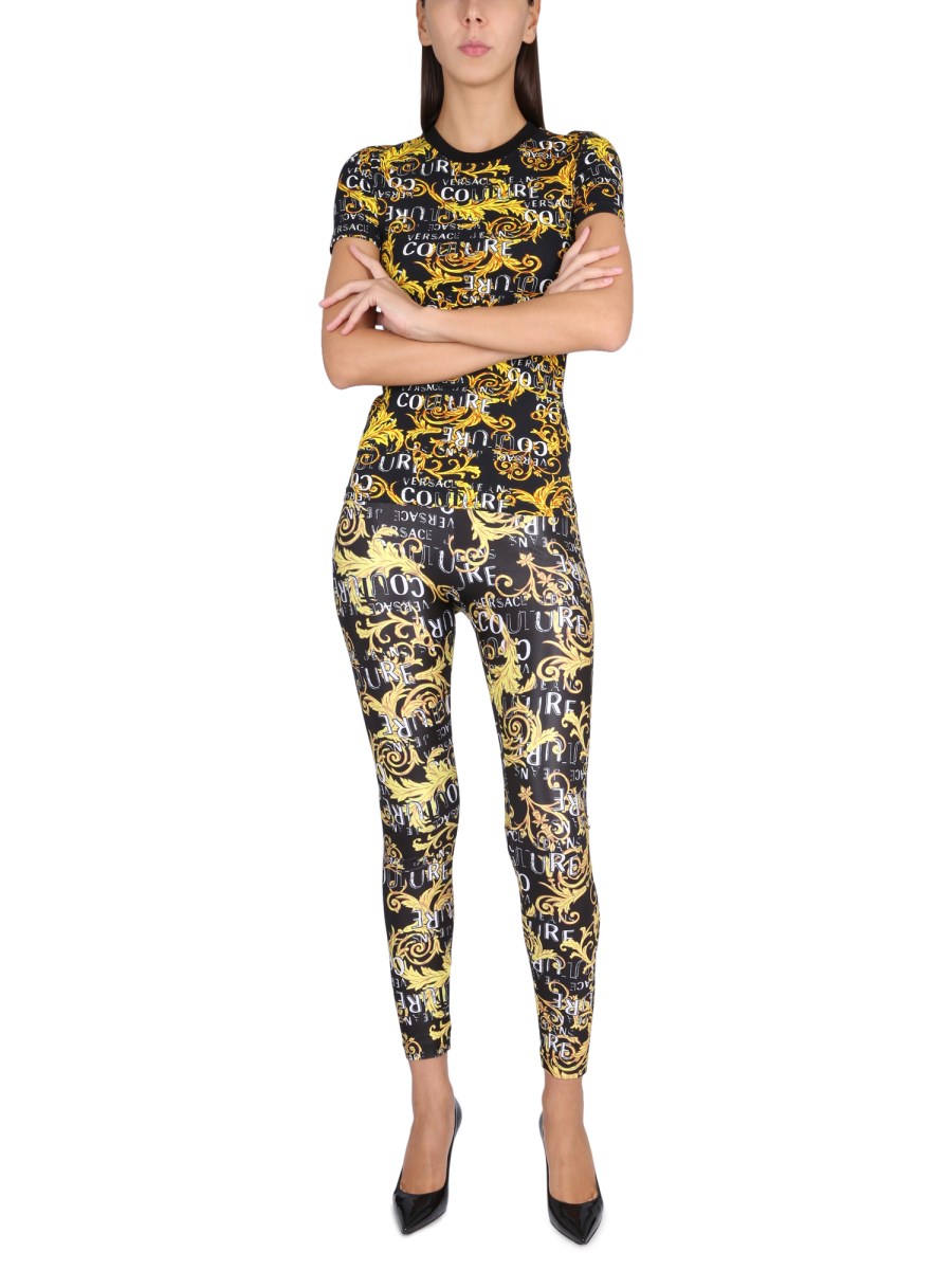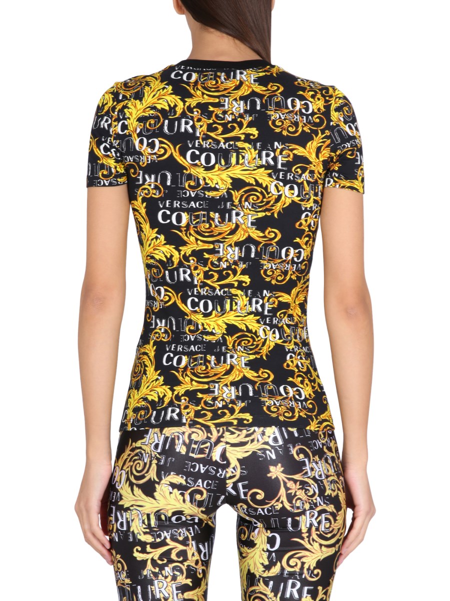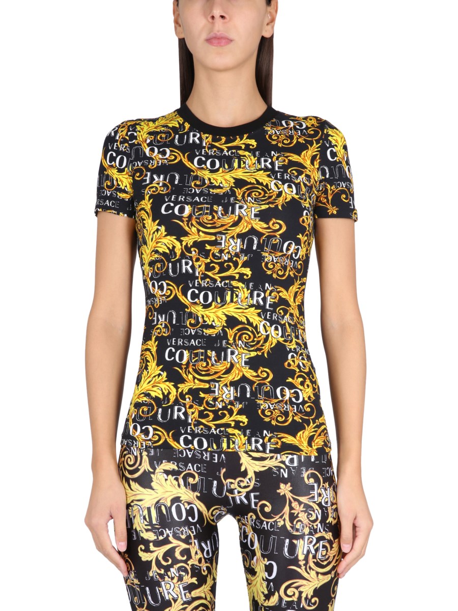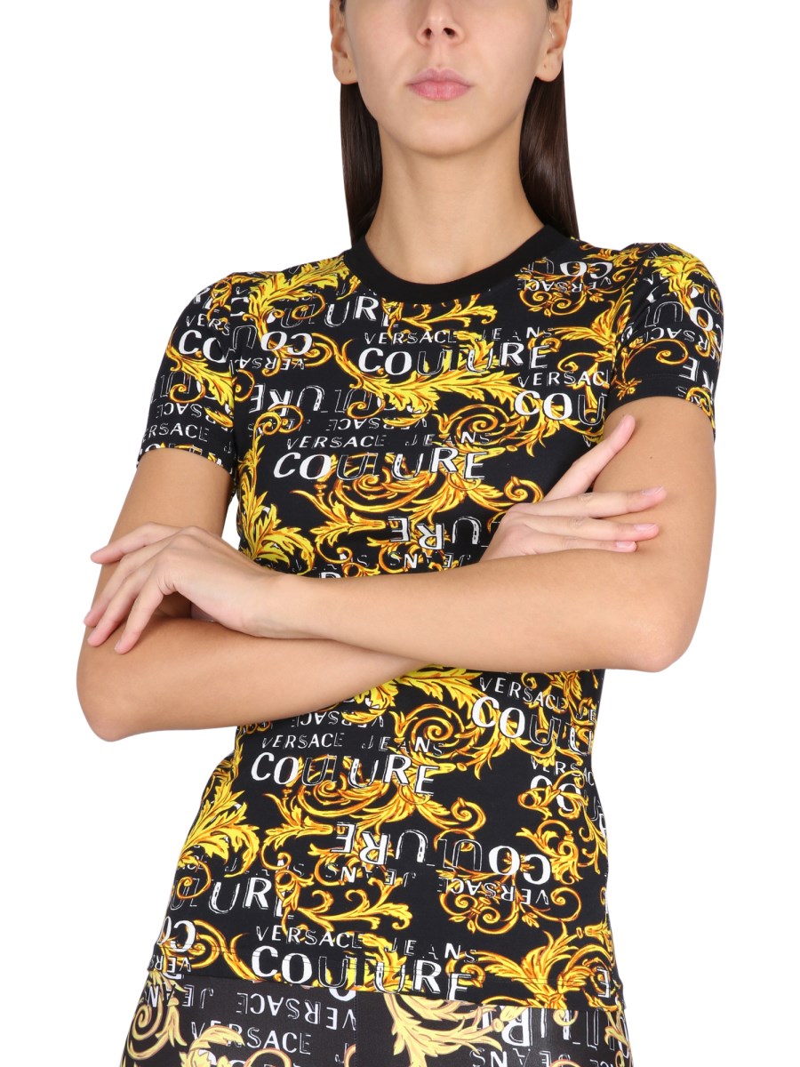 Stay comfortable all day long in the cotton jersey T-shirt from Versace Jeans Couture with the logo print on the front. The pull-on style tee has a crew neckline with short sleeves and a straight hem. It has a regular fit that allows you to move around freely.
