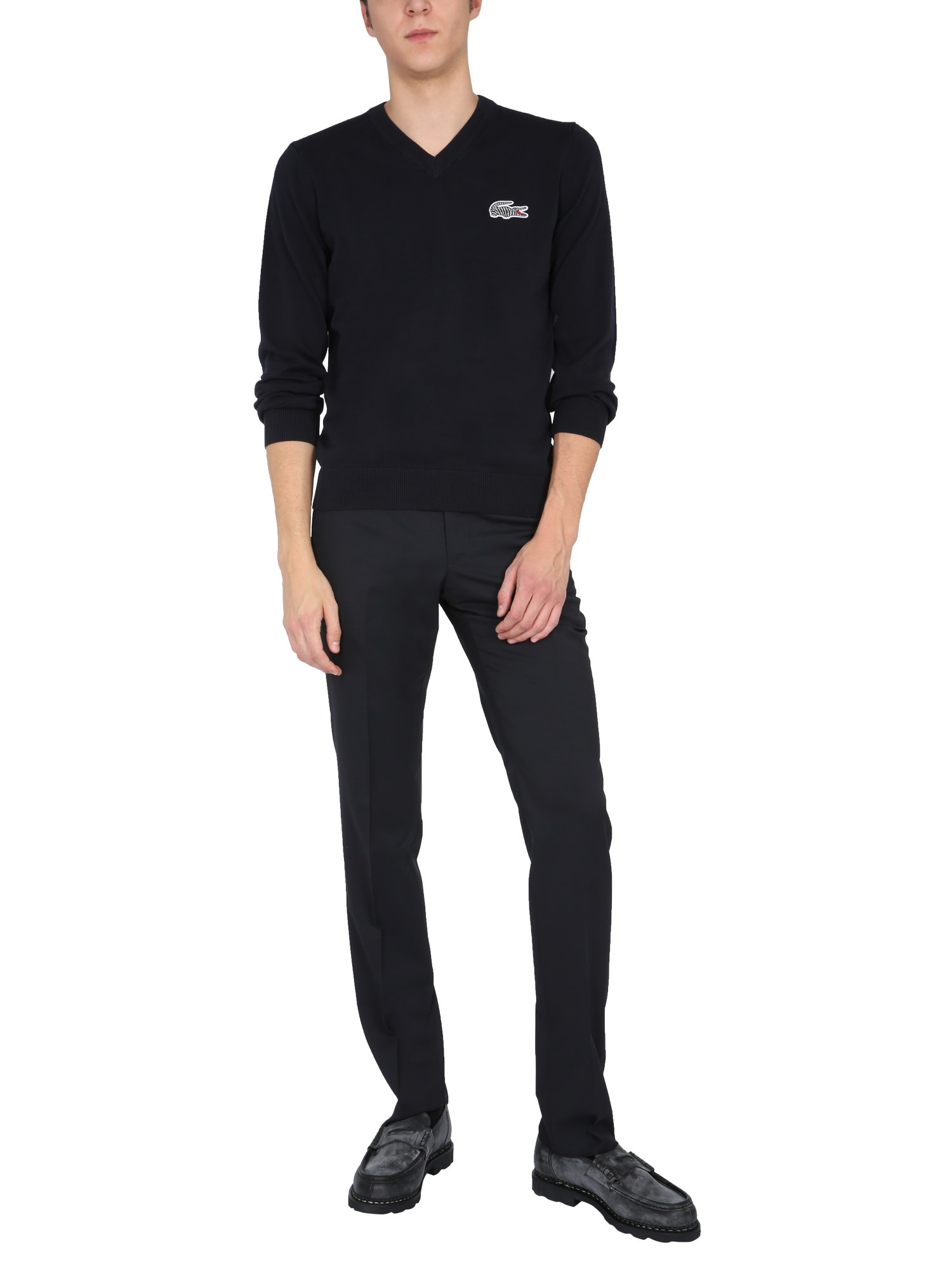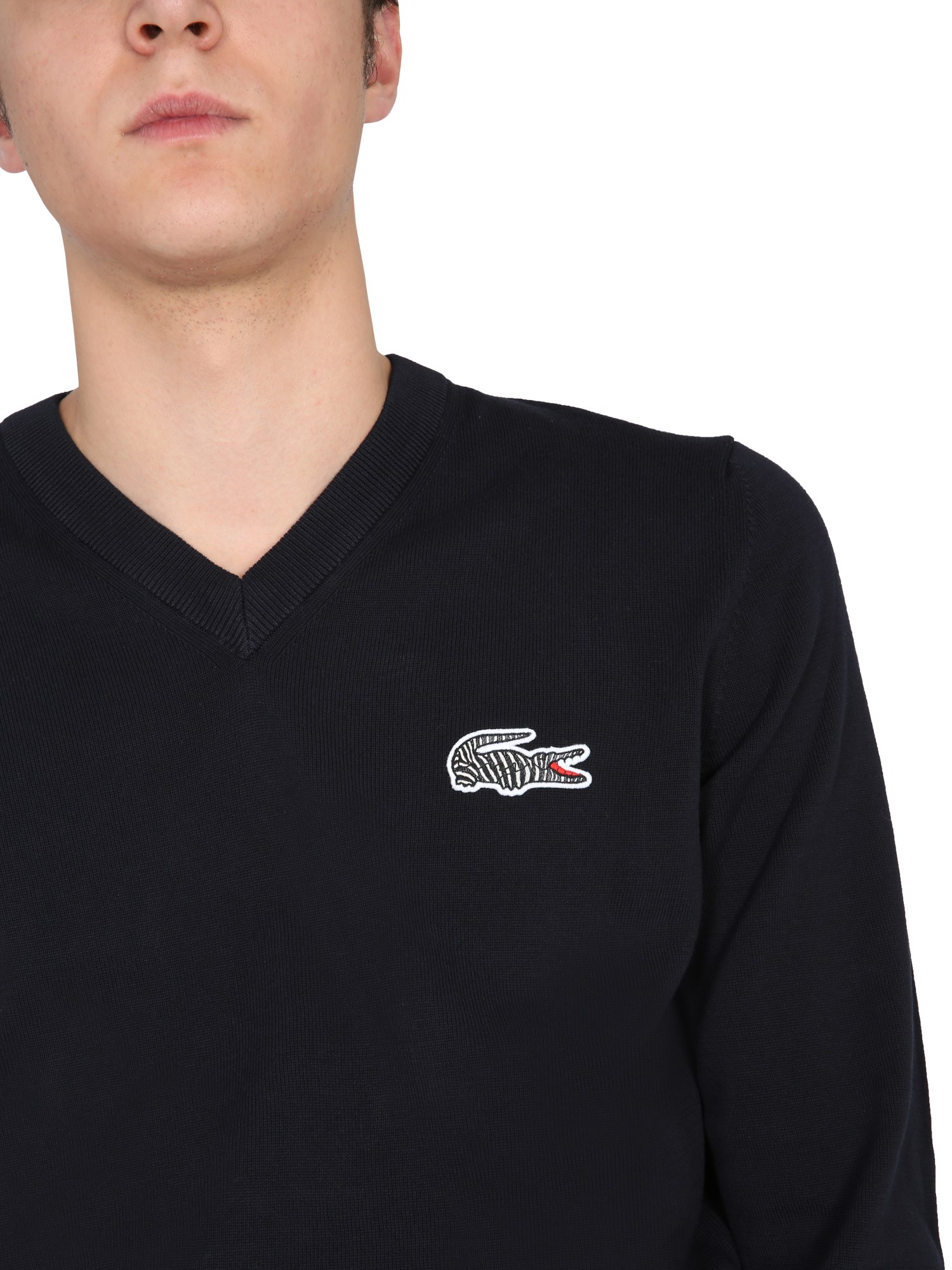 This lovely Lacoste X National Geographic V-neck Sweater will keep you warm throughout the day. With its V-neck, this sweater is extremely fashionable. It has an oversize fit, a large logo patch on the chest, a ribbed cuff, and a bottom neck. Pair this pure cotton sweater with jeans, joggers, pants, shorts, and other bottoms for a stylish and trendy look.