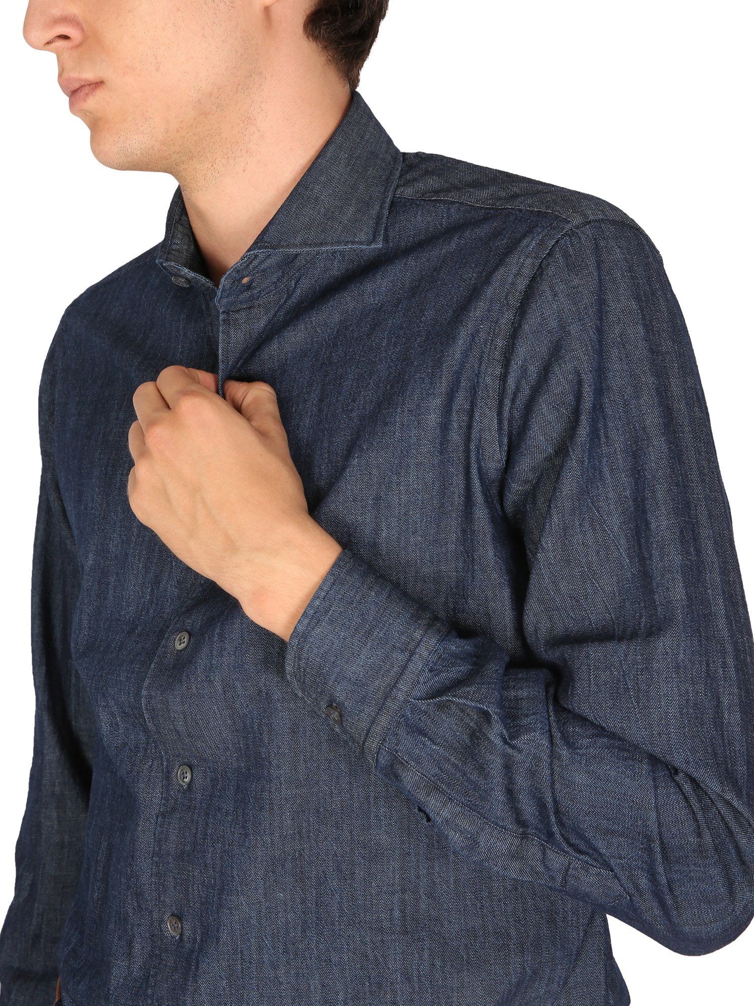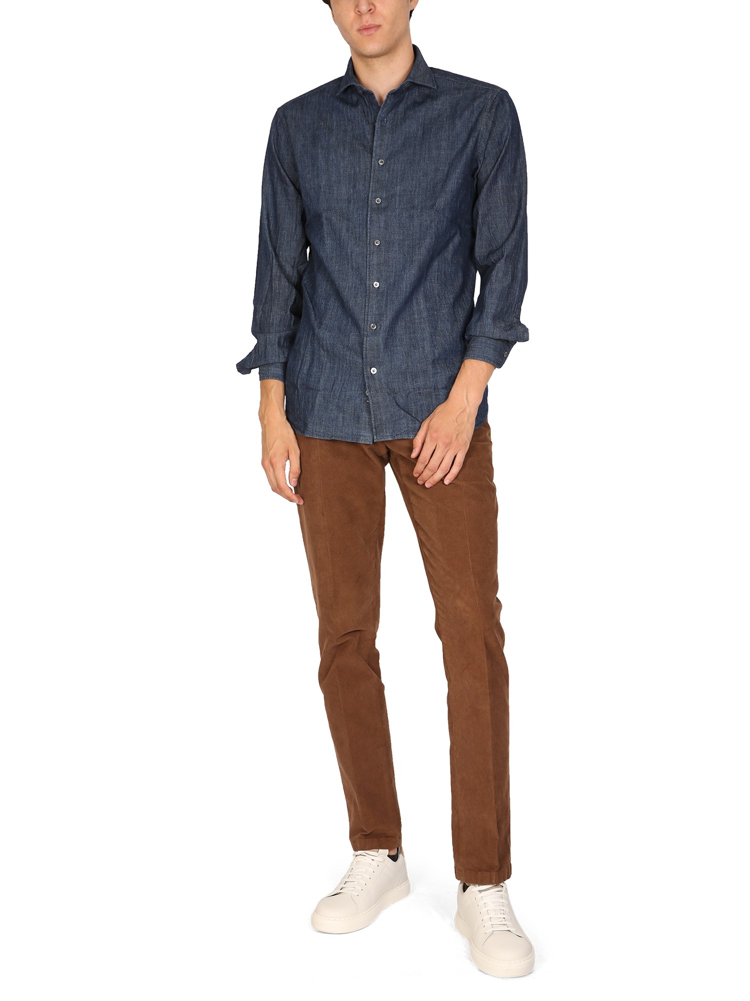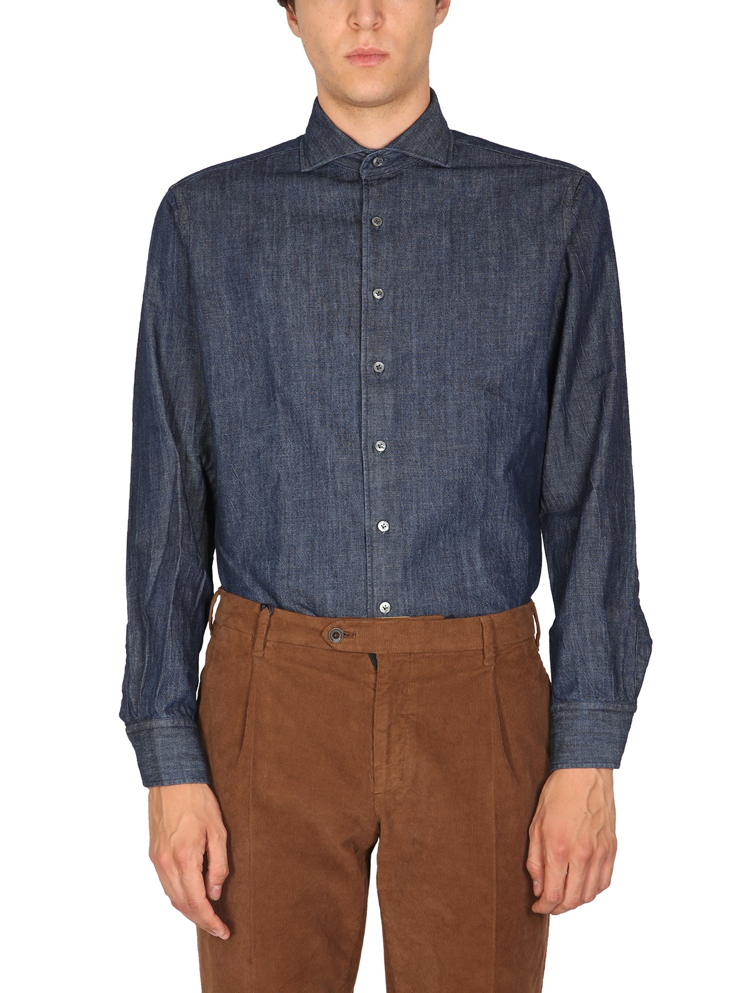 The best shirt by Lardini for your toughest days is this one! The French collar embroidered logo cotton denim shirt has an attractive, trendy look that will make you feel comfortable and confident. This shirt is a perfect choice for casual wear, office wear, and more.