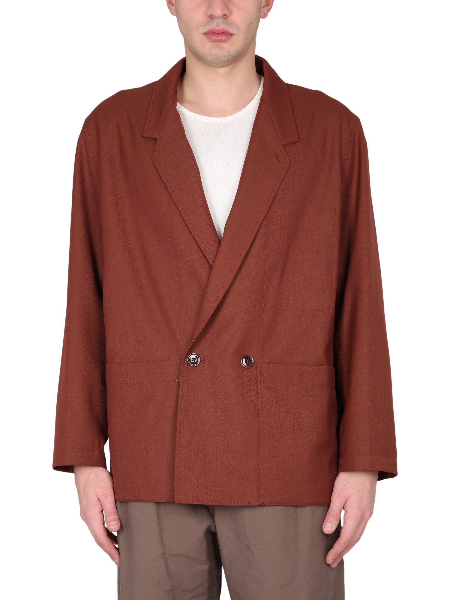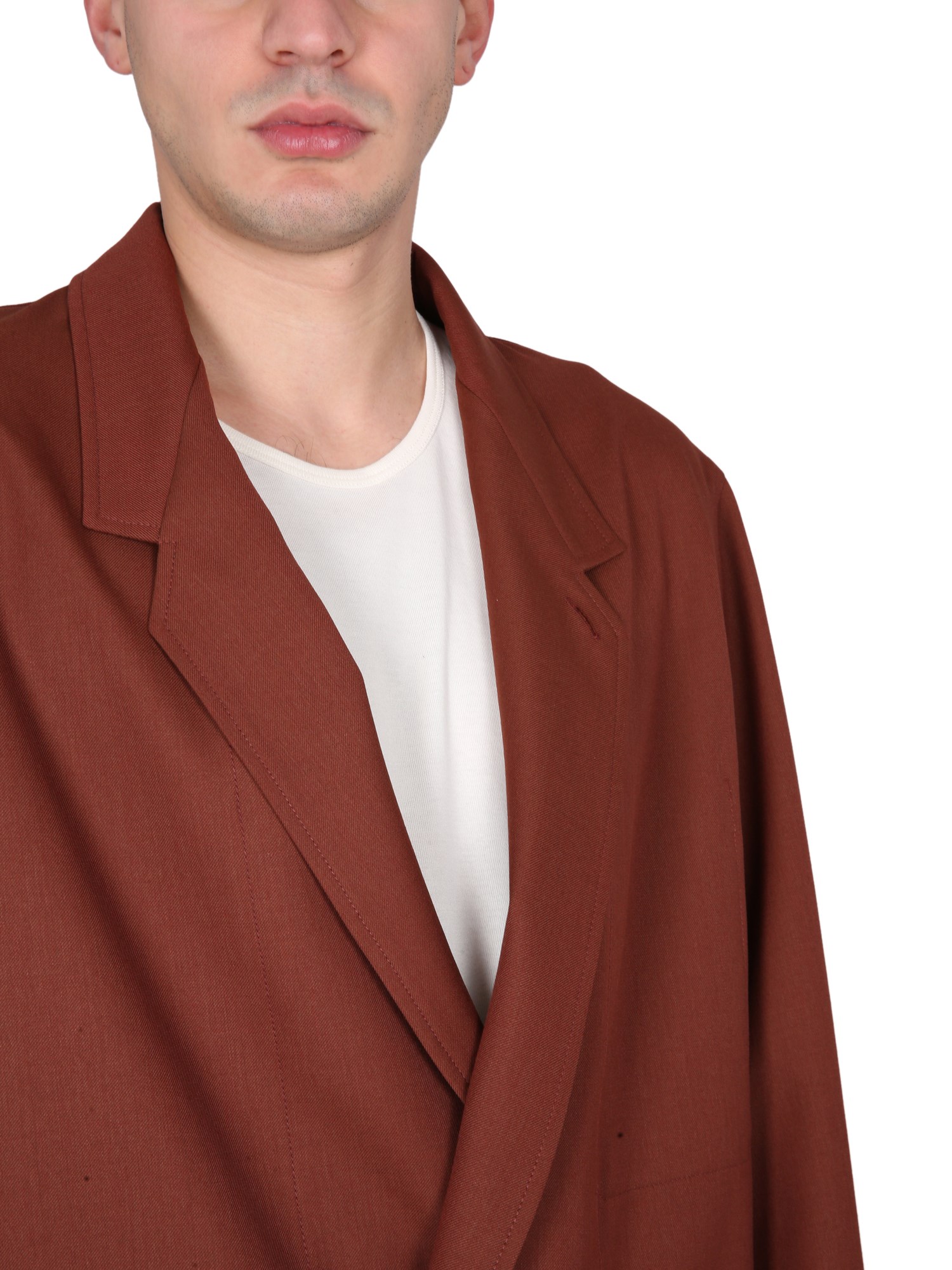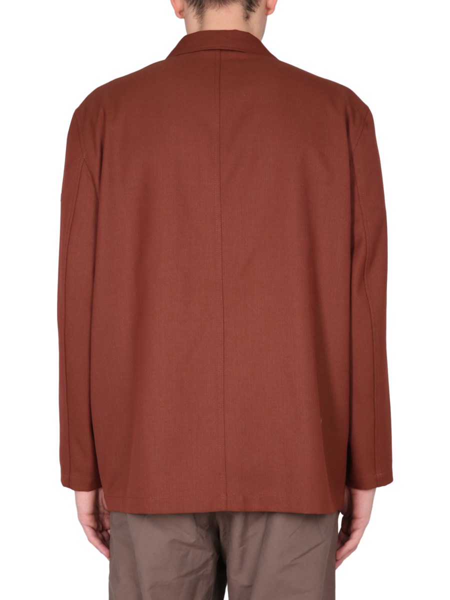 This jacket made of a midweight polywool with a twill weave, that has been yarndyed to enrich its tone. This deconstructed lightweight blazer has a boxy silhouette that is accentuated by a convertible notched lapel. Its features are drawn downwards, with a low twobutton closure and two patch pockets, emphasizing its elongated silhouette. Details include a stitched through interior patch pocket and a long buttoned tab in the interior that can be fastened close or left open for a more draped effect.