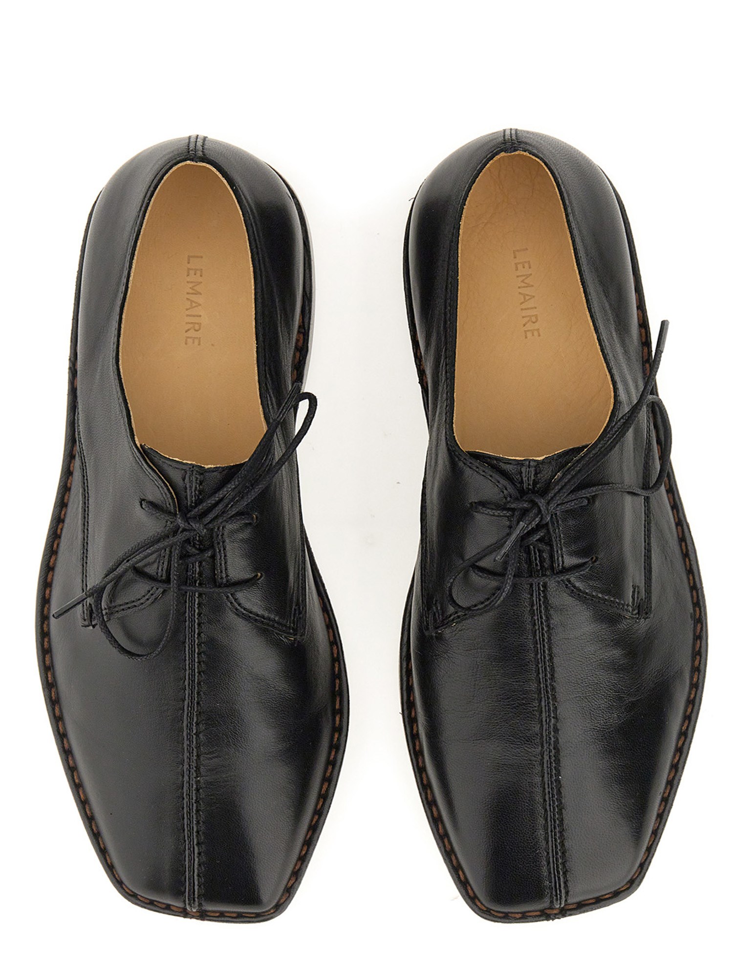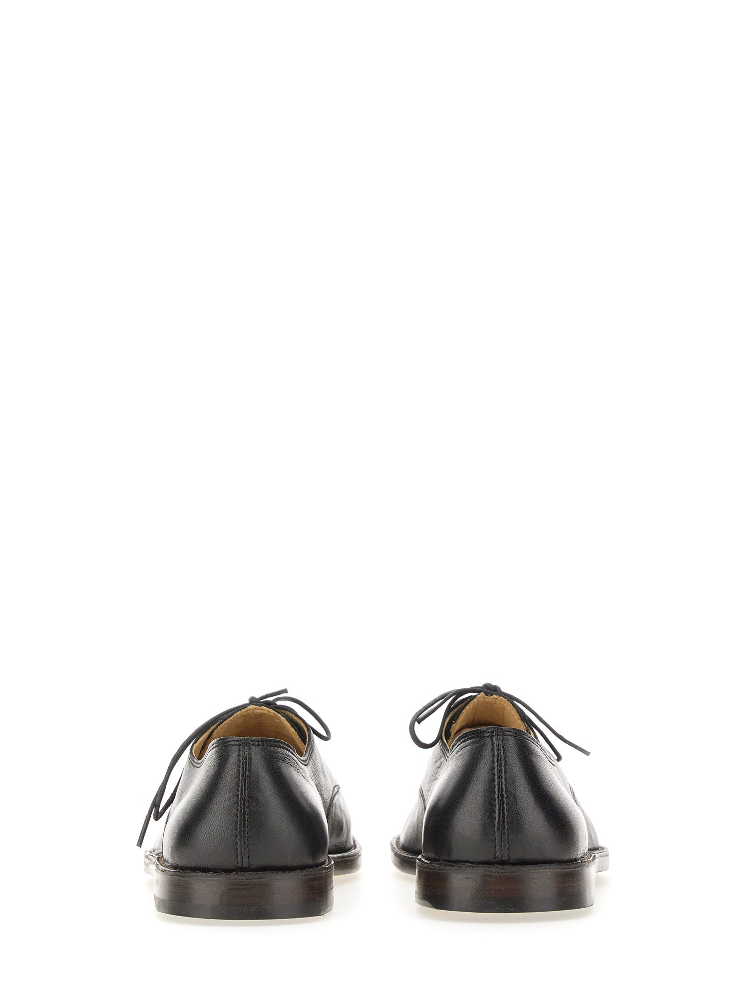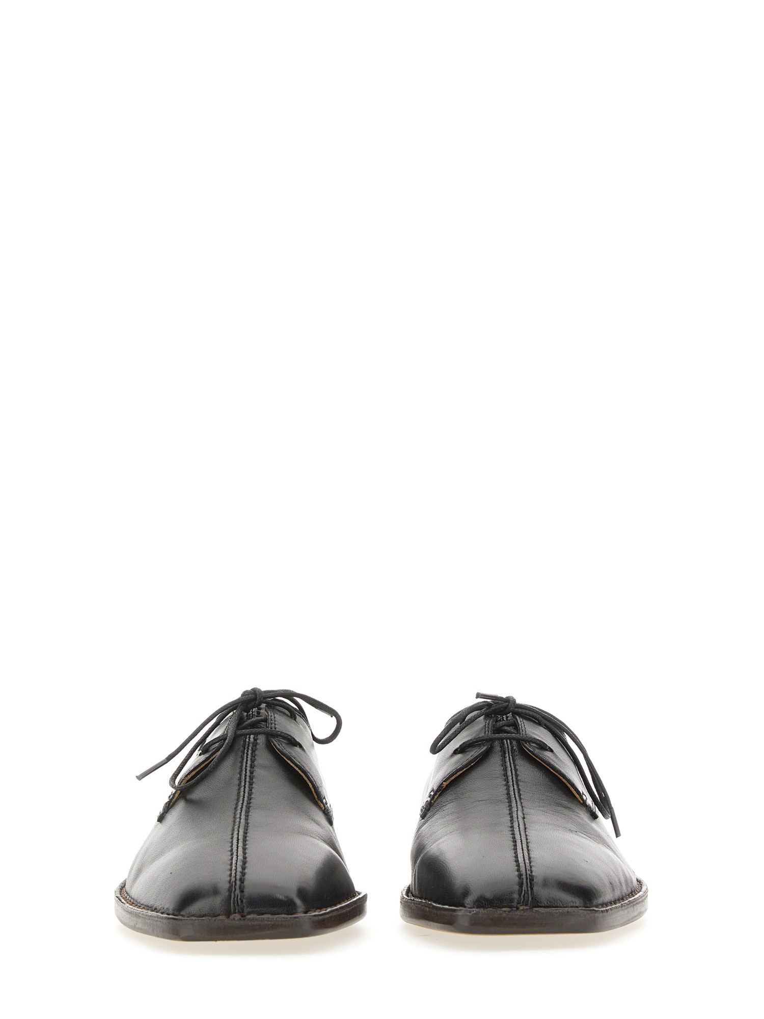 These shoes are made of lamb nappa leather with a shiny finish. An adaptation of the classic Piped Slippers, this new style features laces and curved stitching details along the midupper. They are constructed from two pieces of leather that are sewn together on the front and sealed with leather piping. A square toe and crepe sole add to their flexibility.