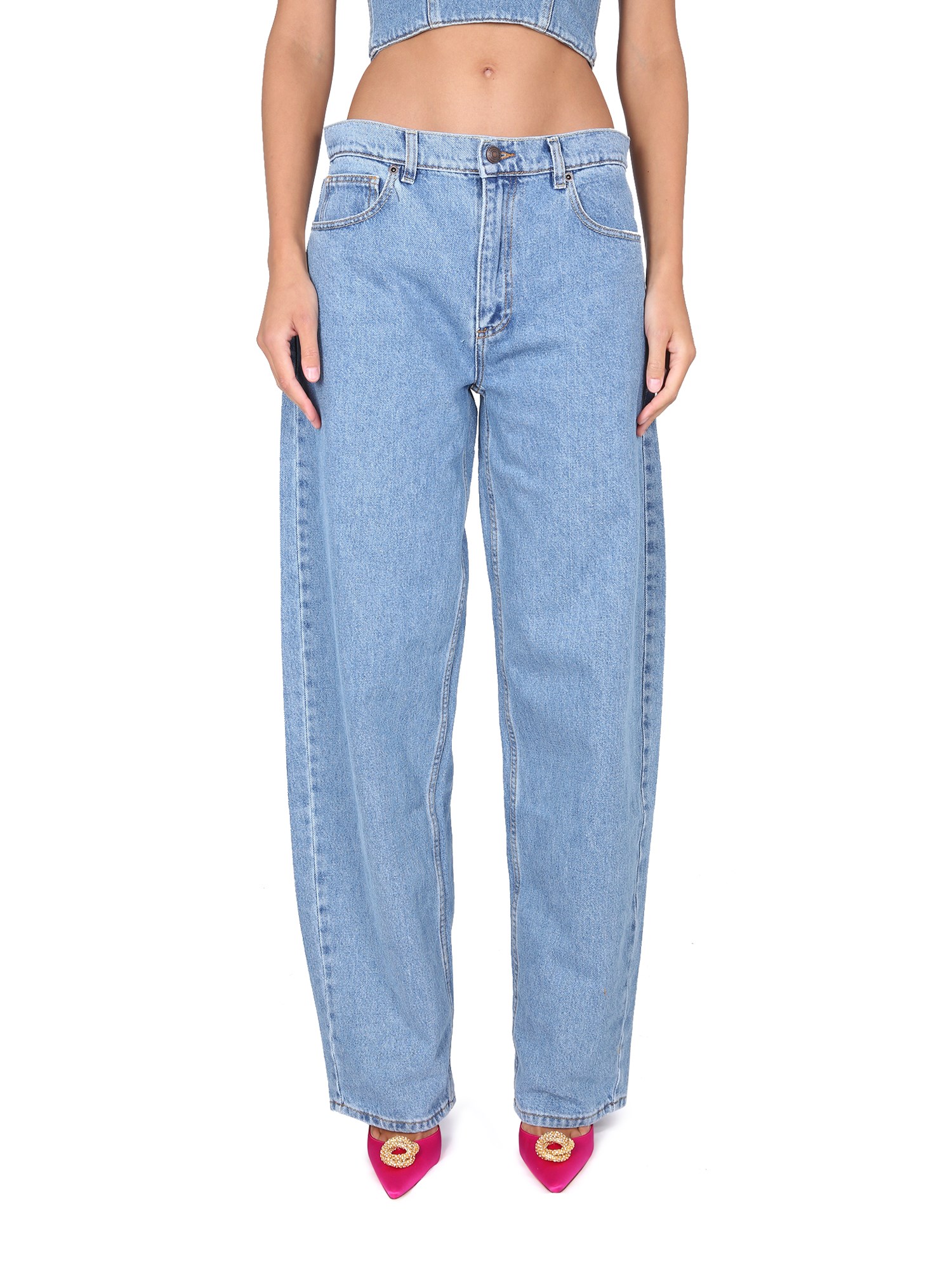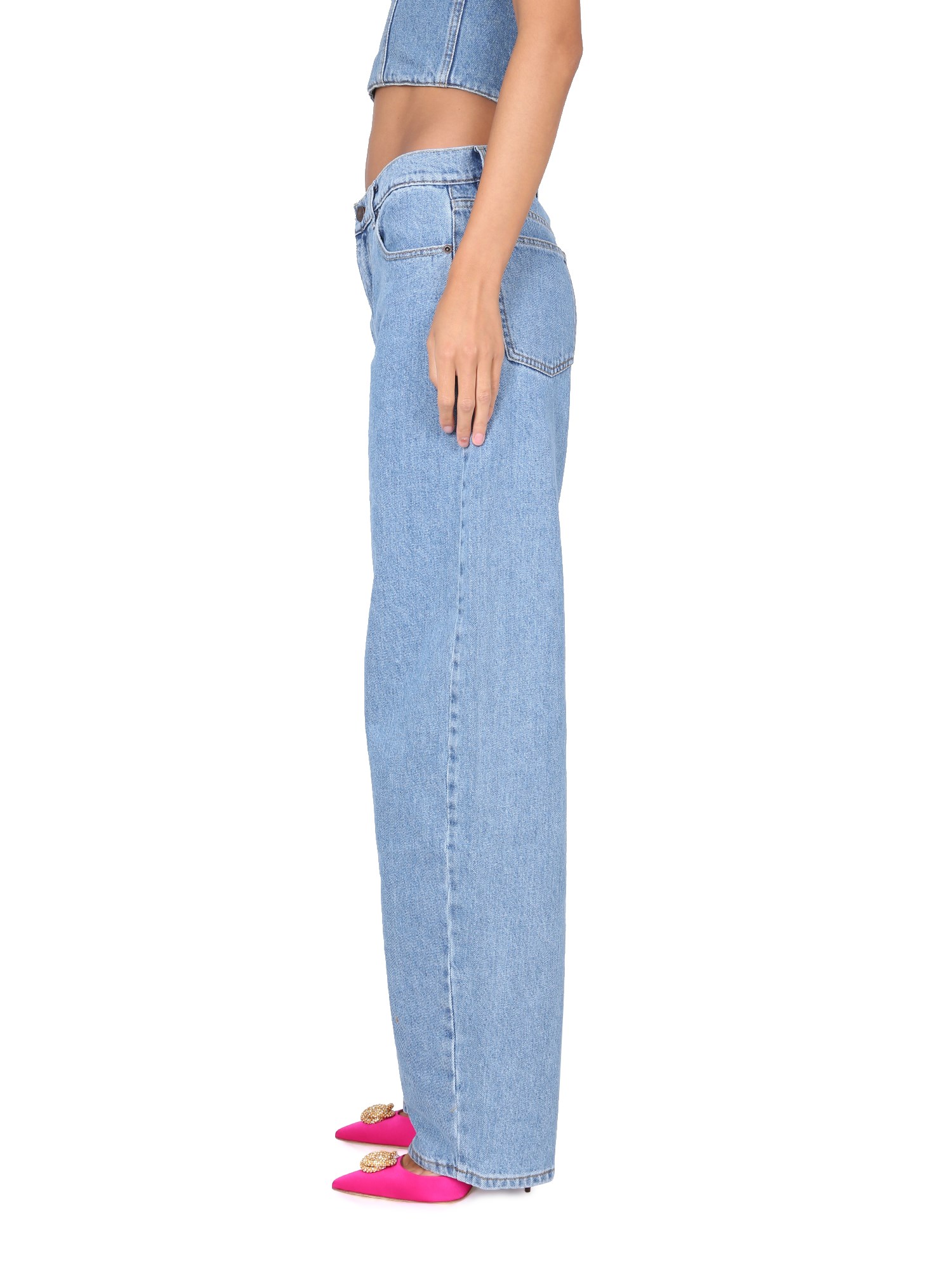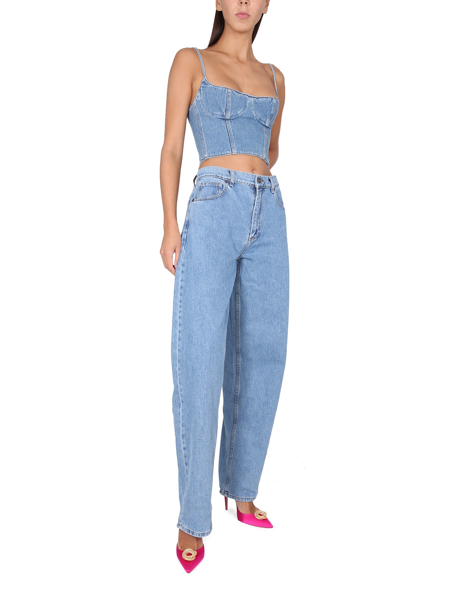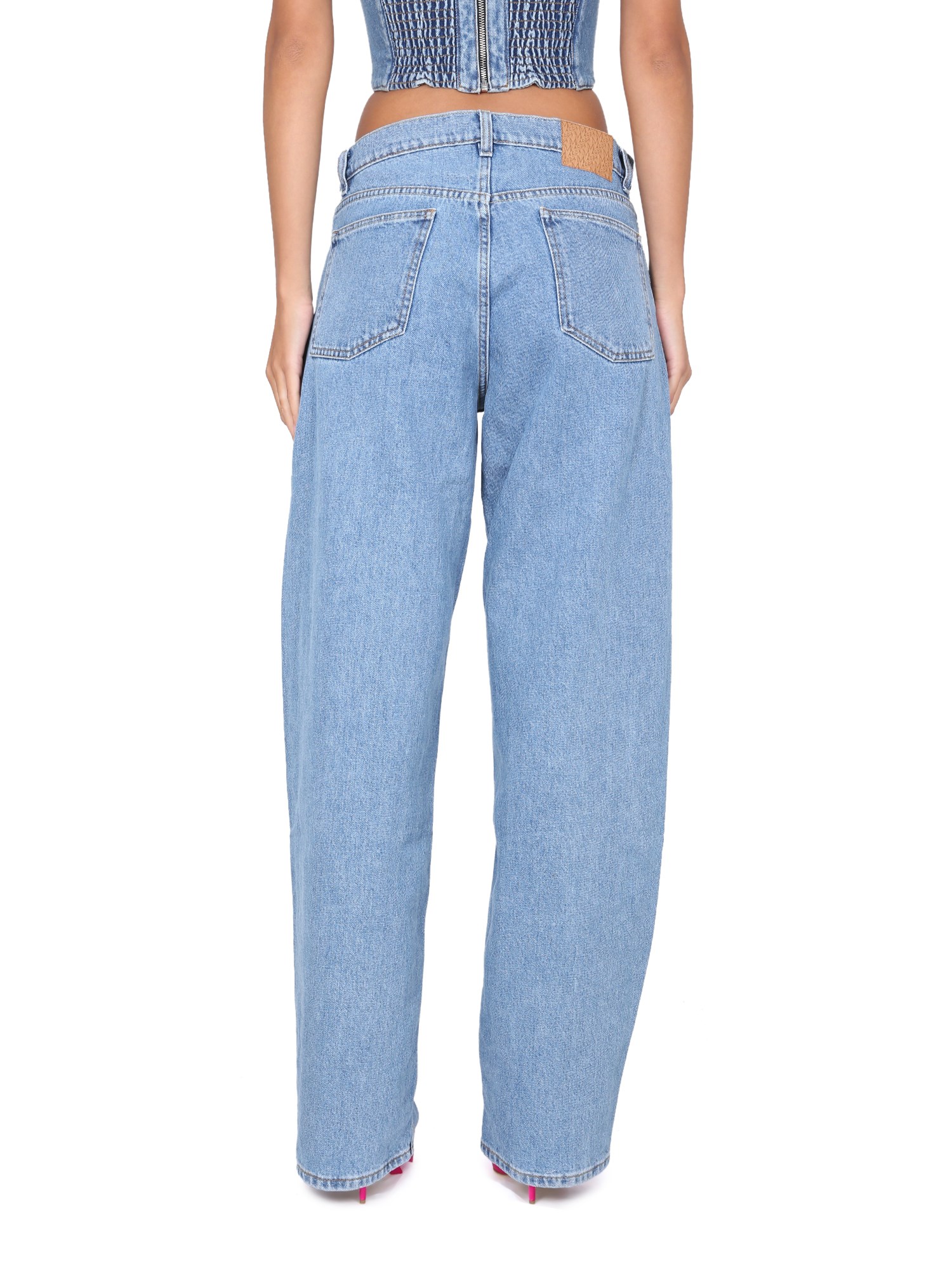 Button closure denim jeans from Magda Butrym are an affordable, classic staple that's easy to wear and care for. A light wash pair is perfect for an on-the-go lifestyle and a light wash pair is perfect for a laid-back, summer day. The denim jeans have a stretch fit and are made from a sturdy, yet comfortable, cotton fabric.