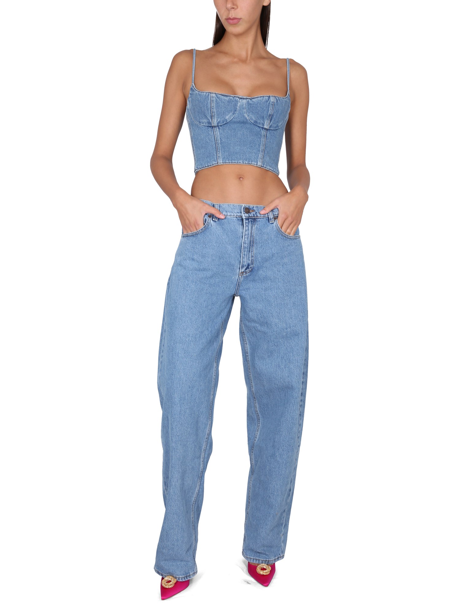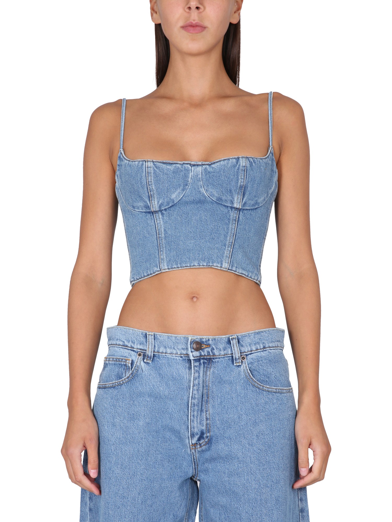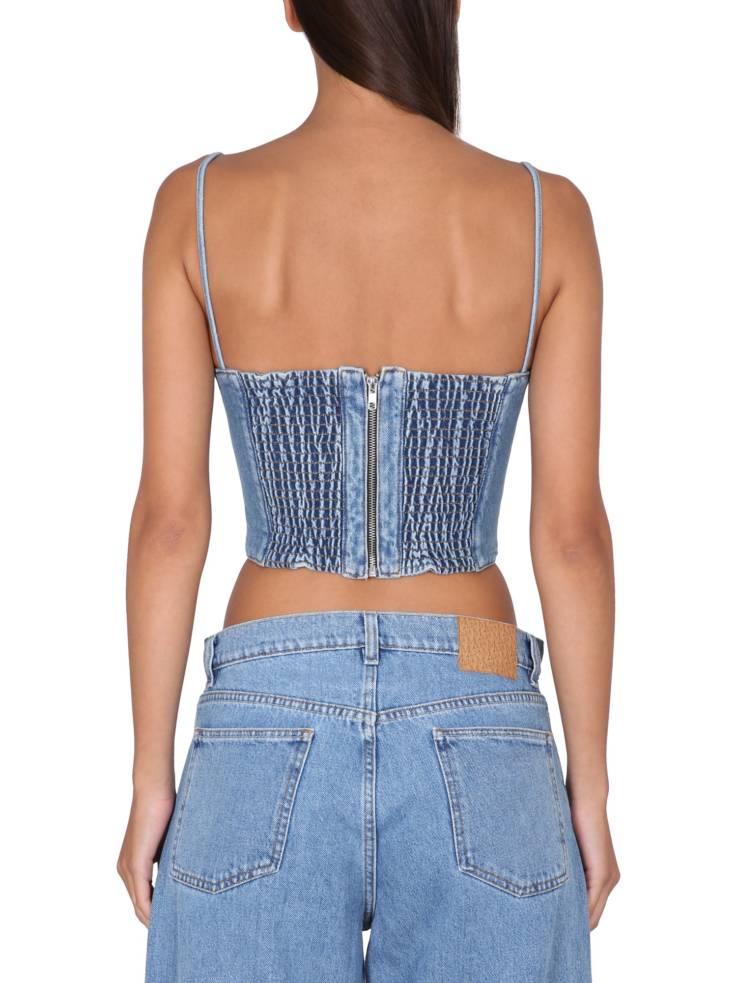 This women's denim shirt from Magda Butrym is a fashionable, durable, and comfortable addition to any wardrobe. The waistband and neckline are made of stretch cotton denim, giving it a perfect fit and feel. The thin shoulder strap is perfect for carrying over the shoulder or on the arm, and the zipper closure ensures that you'll be able to dress and undress quickly.