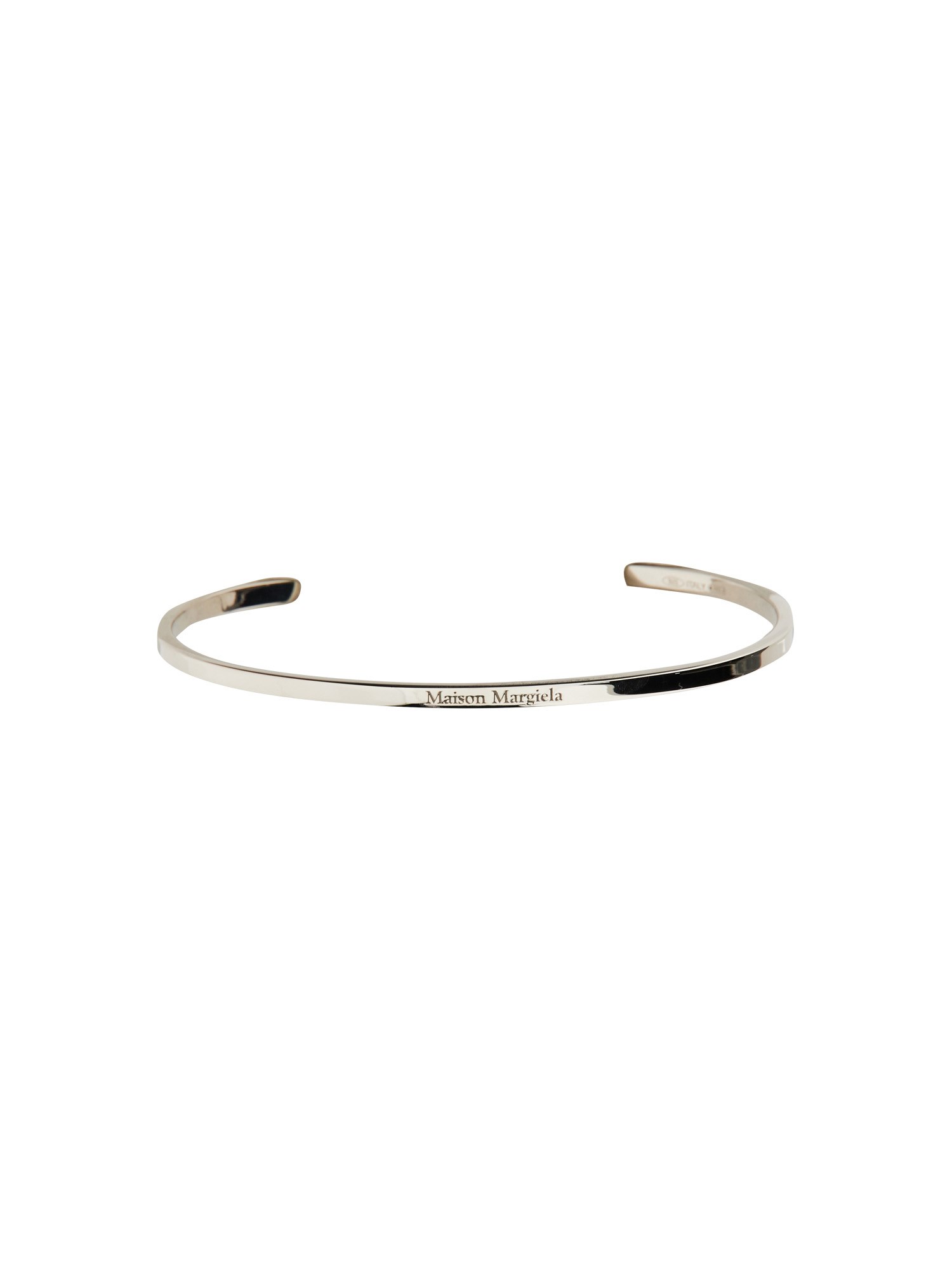 This is a gorgeous silver bracelet from Maison Margiela that has an engraved logo on it. It is made of high-quality materials and is really beautiful. It is perfect for any occasion. The bracelet has a stretchy feel, so it will fit most people. For a bold and fashionable accessory, this bracelet is a must-have!