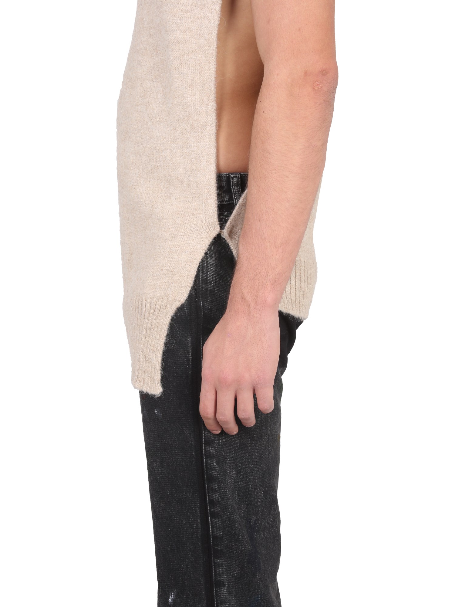 With its light, airy feel and durable construction, the alpaca wool tabard from the house of Maison Margiela is a versatile addition to any wardrobe. It has a V-neckline and sleeveless style with ribbed edges. The fabric is soft and warm and looks good worn alone or layered over other tops and sweaters.