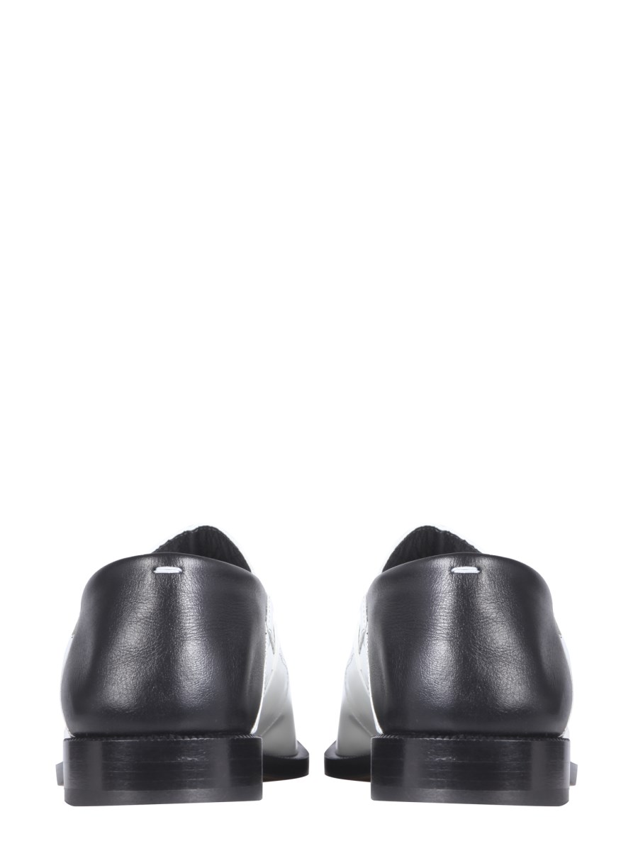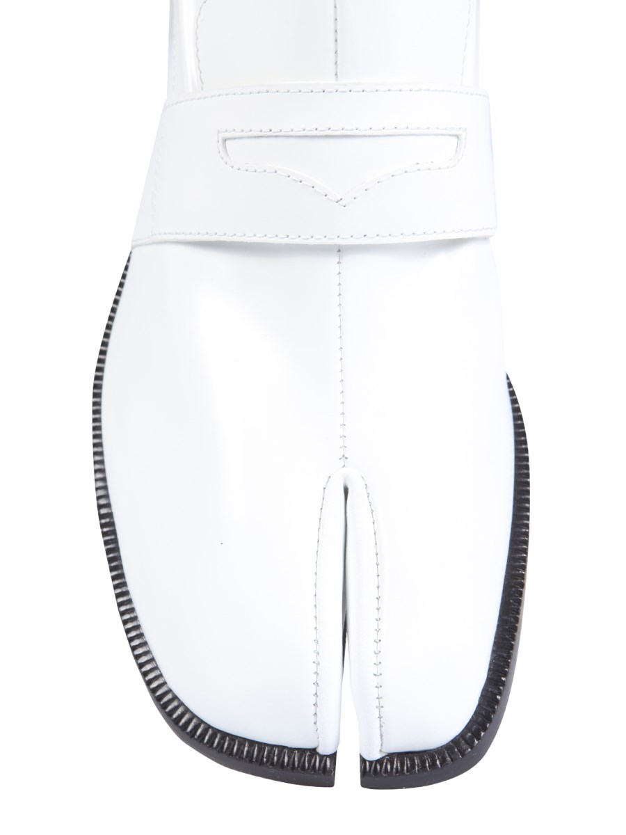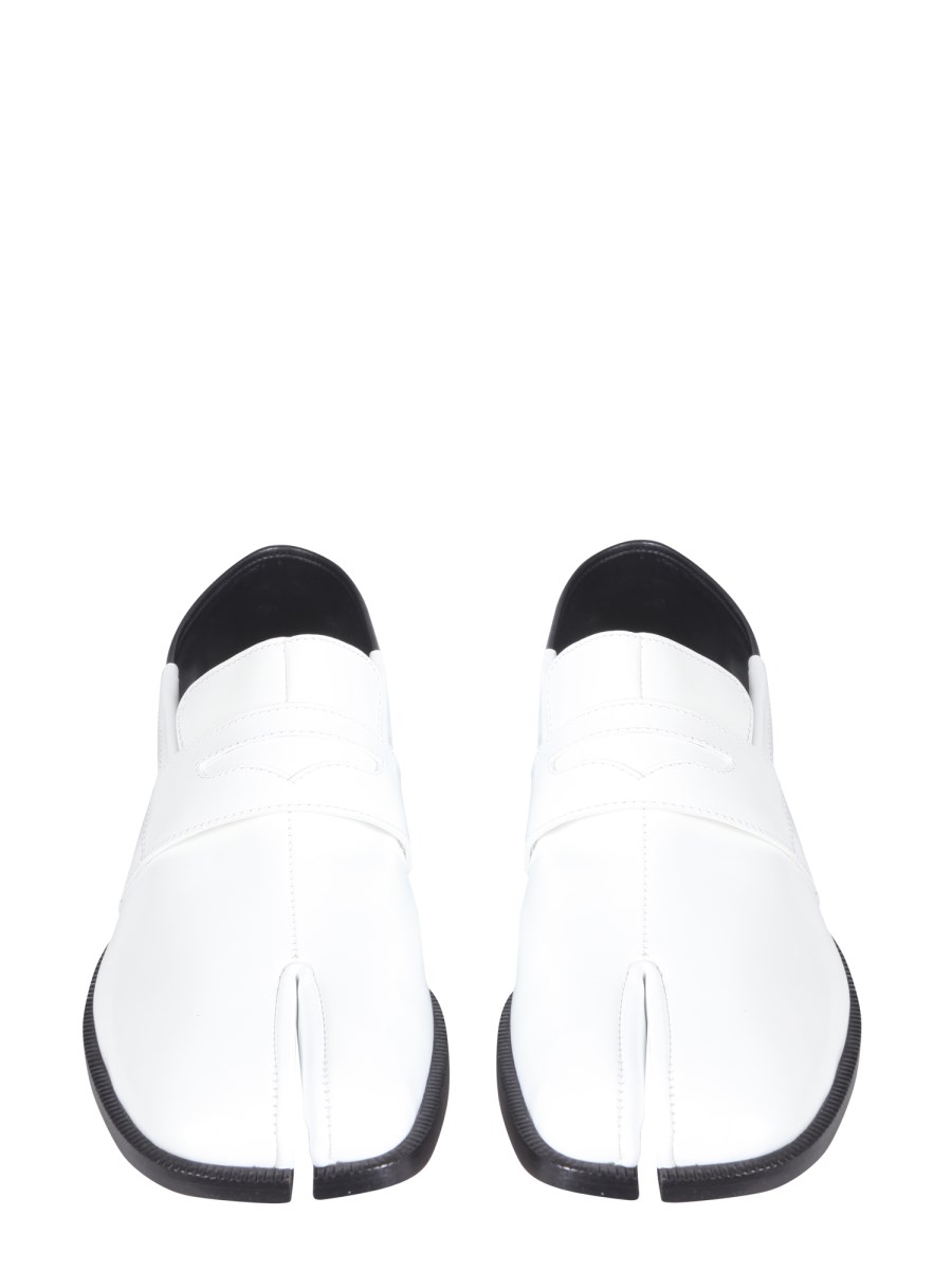 The classic look of these loafers by Maison Margiela is both timeless and chic. The leather tabi loafers are constructed with an iconic tip, and contrasting leather heel, and feature a leather insole. The simple, yet classic design of these shoes is perfect for any occasion.