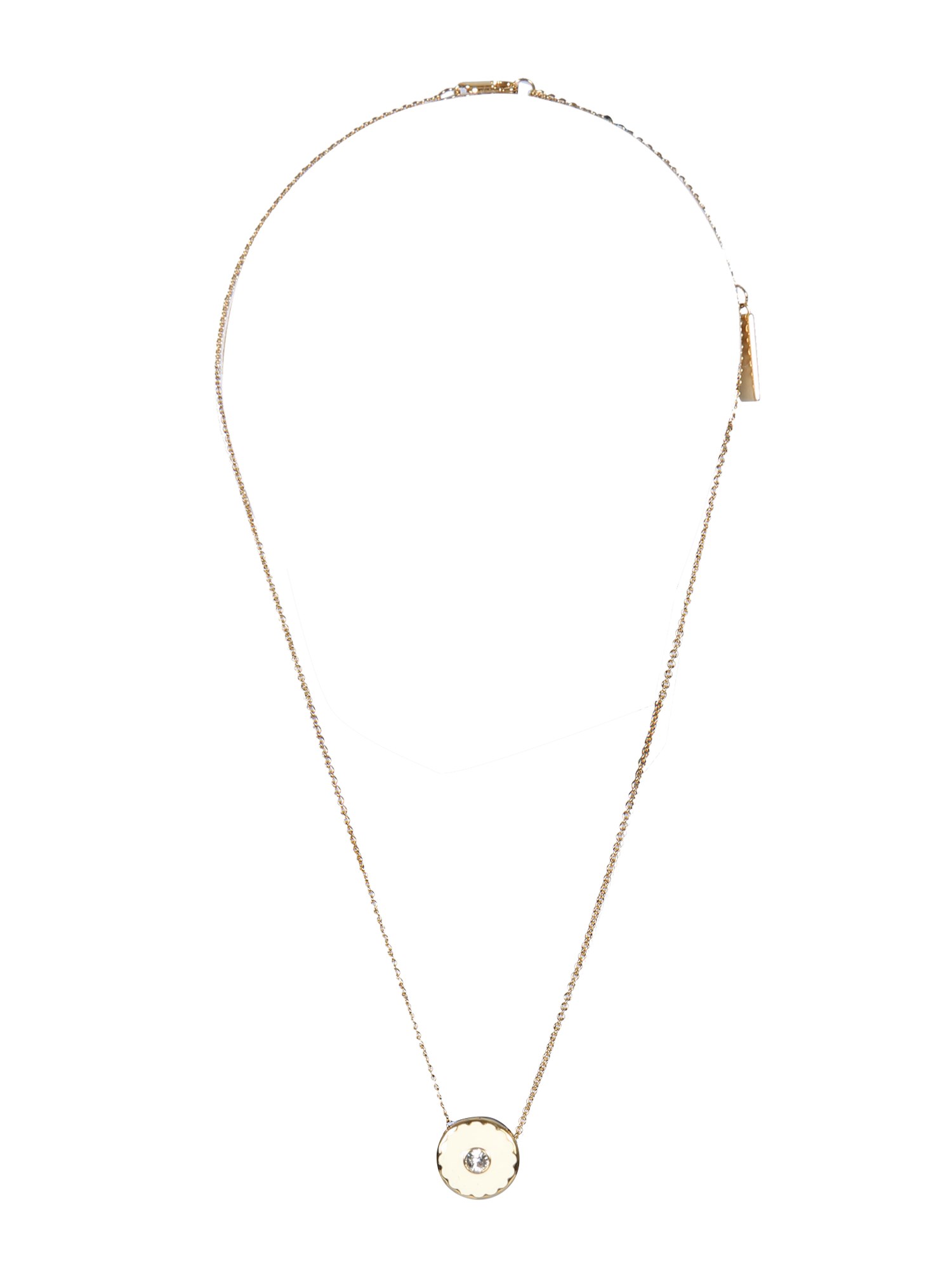 With its timeless and luxurious design, this pendant necklace from Marc Jacobs is the perfect way to express your personality. From its enamelled circle with logo and crystal, this pendant is a work of art. The necklace has a thin chain and an adjustable clasp closure.