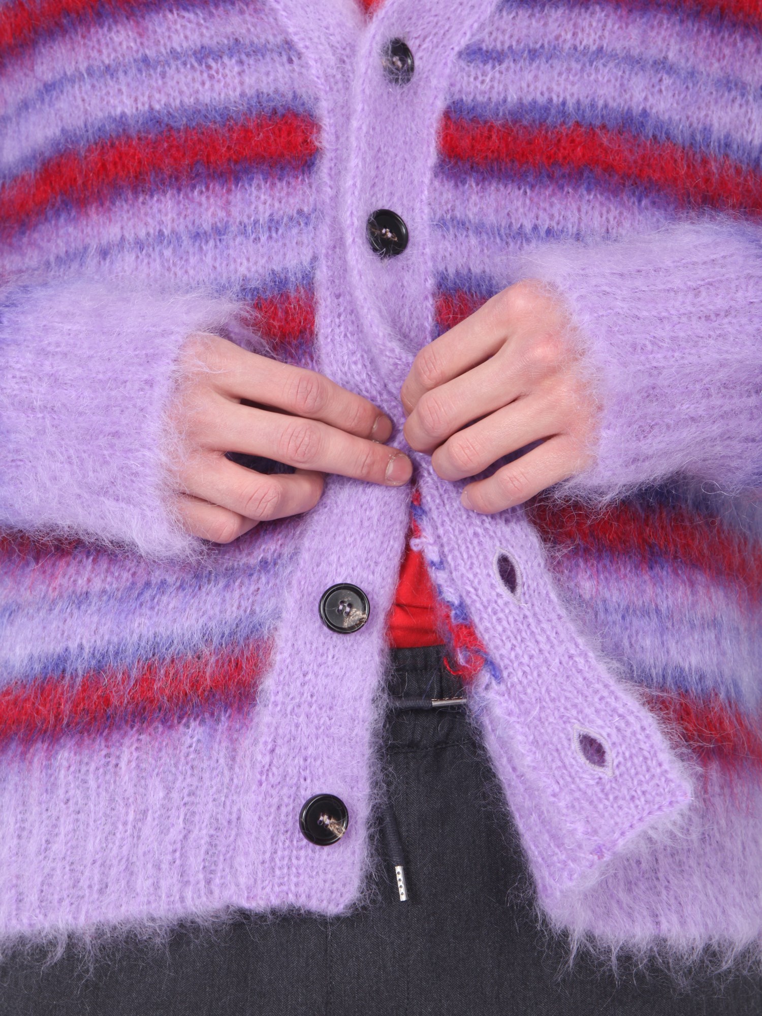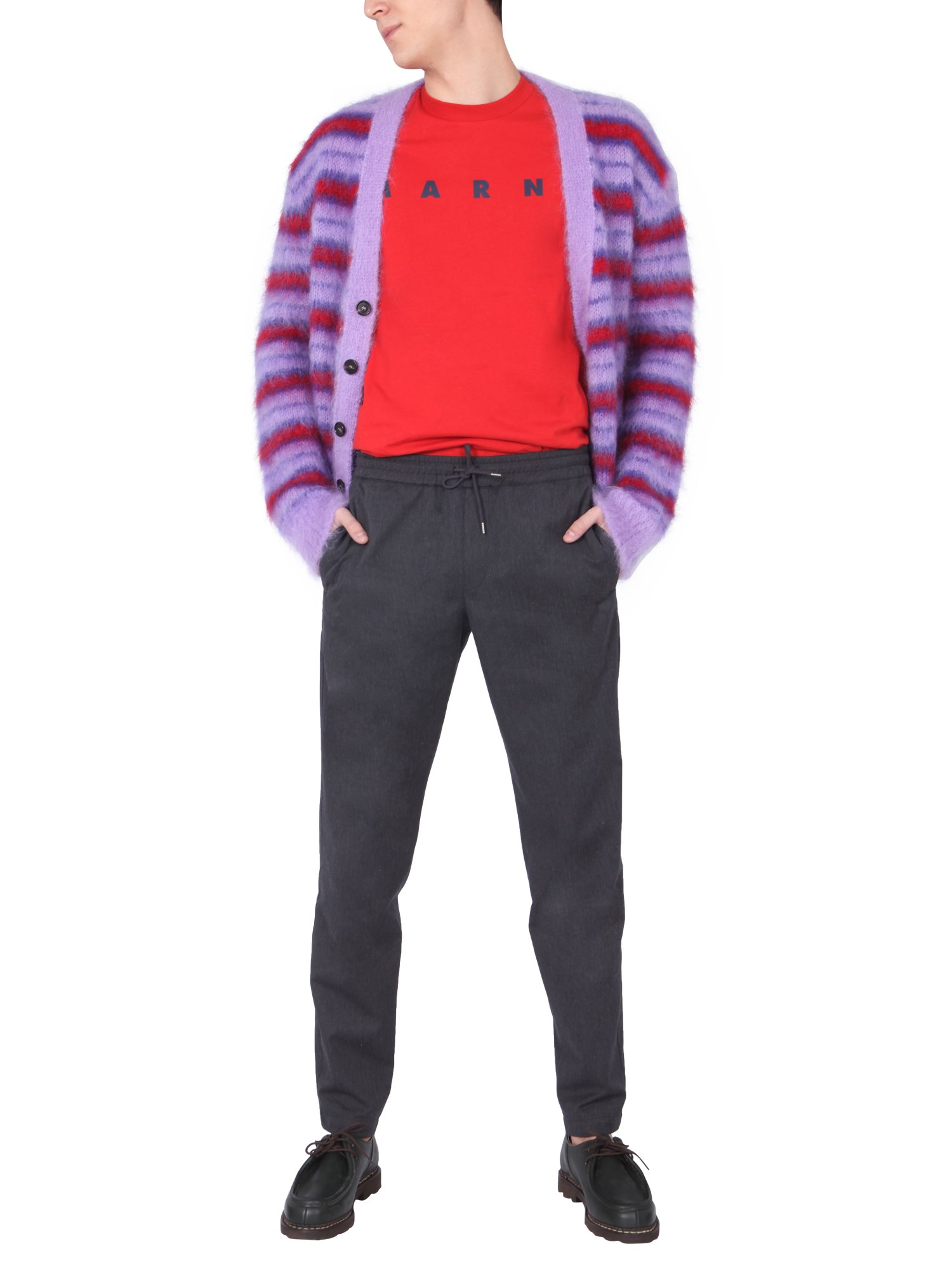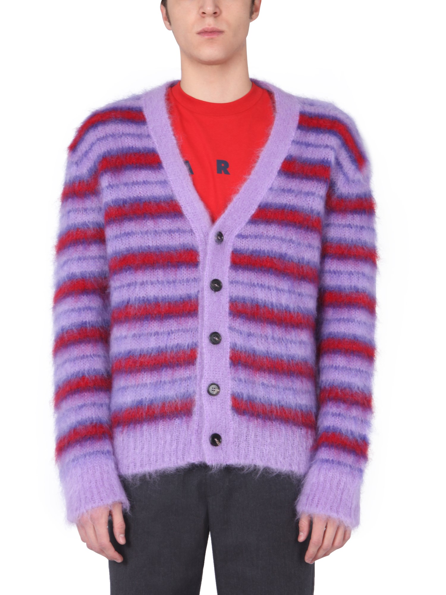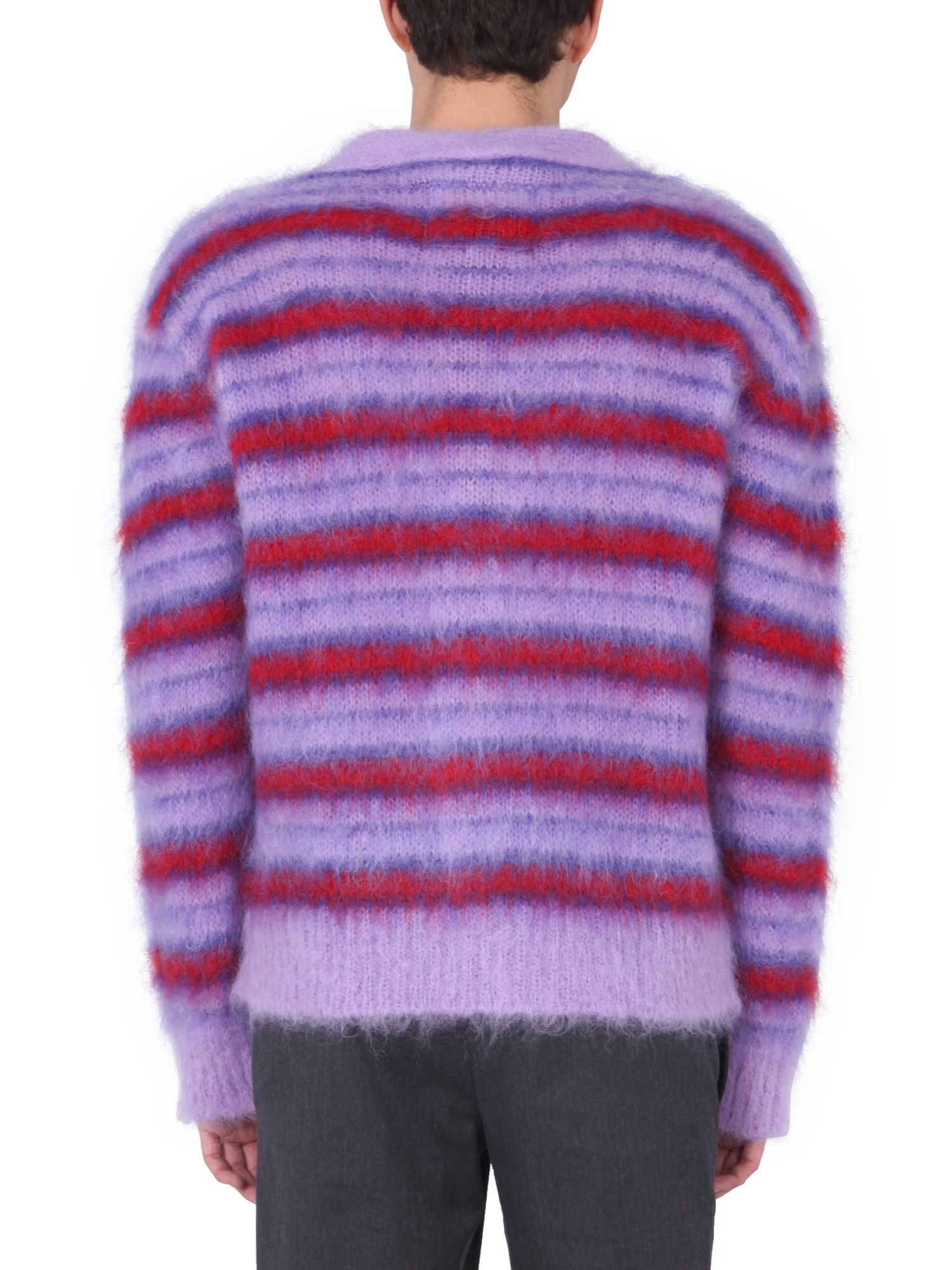Get playful with this Mohair Cardigan by Marni on a dull day. The cardigan has a striped pattern, making it different from an ordinary cardigan and is characterized with a V-neck and front buttoning for closure. It is made up of mohair (80%) and polyamide (20%). You can don this cardigan with joggers’ pants or a pair of distressed jeans.