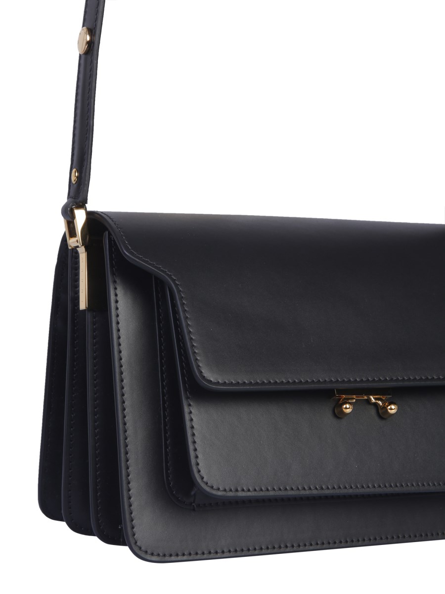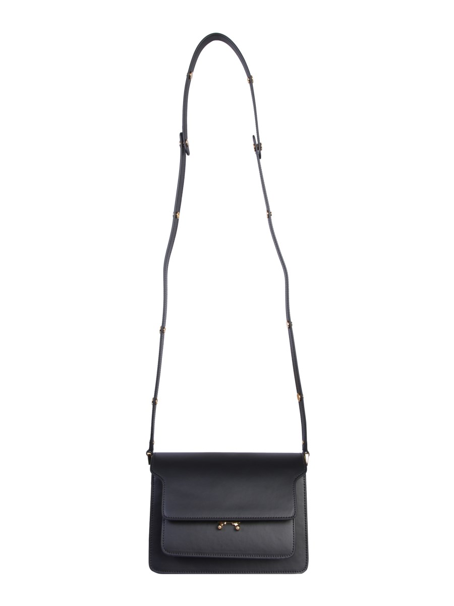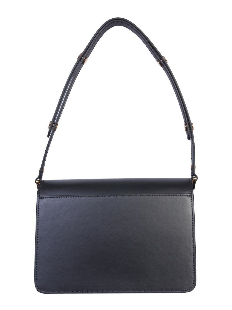 A hard-to-match combination of quality and utility, this trunk shoulder bag from Marni is a wonderful choice to flaunt to your elegant style and carry necessary belongings with ease. It uses 95% calfskin and 5% brass in the making process for a long-lasting feature. The bag is quite spacious, has an adjustable shoulder strap, contrast profiles, flap closure, and one back and one inner pocket.
