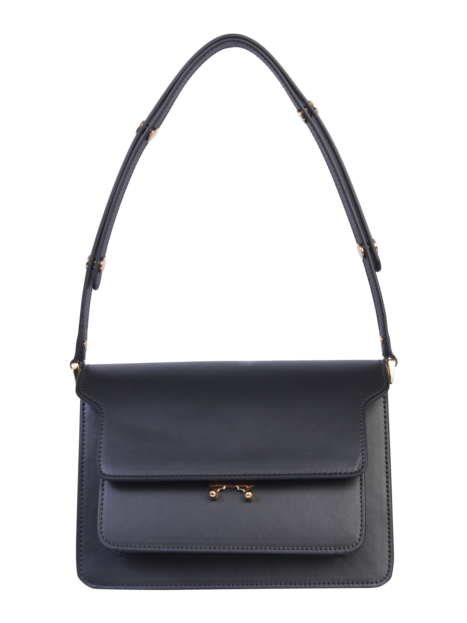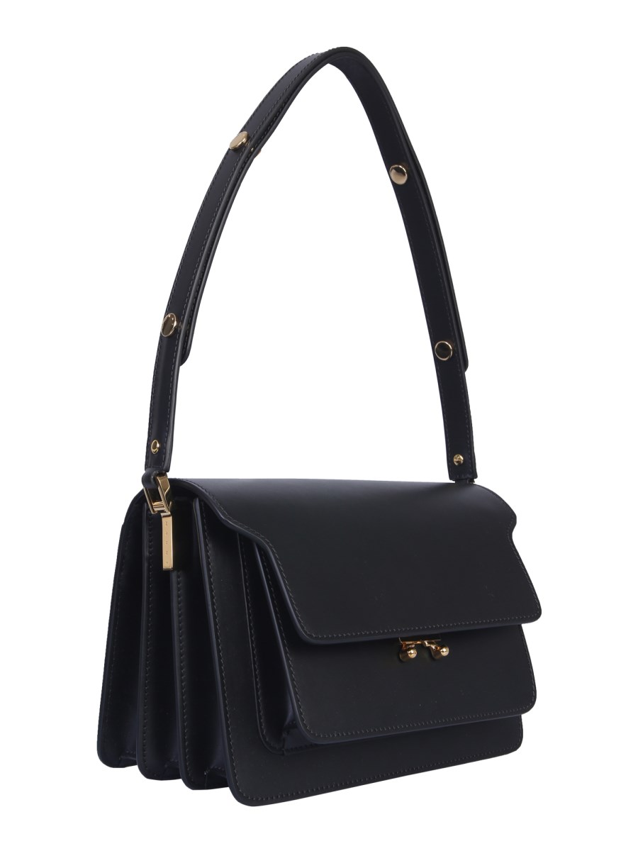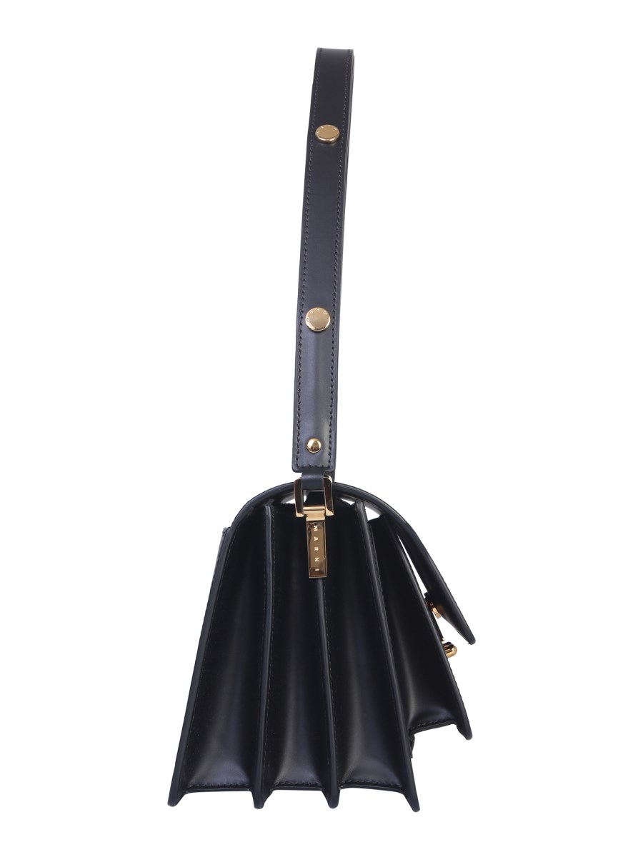A hard-to-match combination of quality and utility, this trunk shoulder bag from Marni is a wonderful choice to flaunt to your elegant style and carry necessary belongings with ease. It uses 95% calfskin and 5% brass in the making process for a long-lasting feature. The bag is quite spacious, has an adjustable shoulder strap, contrast profiles, flap closure, and one back and one inner pocket.