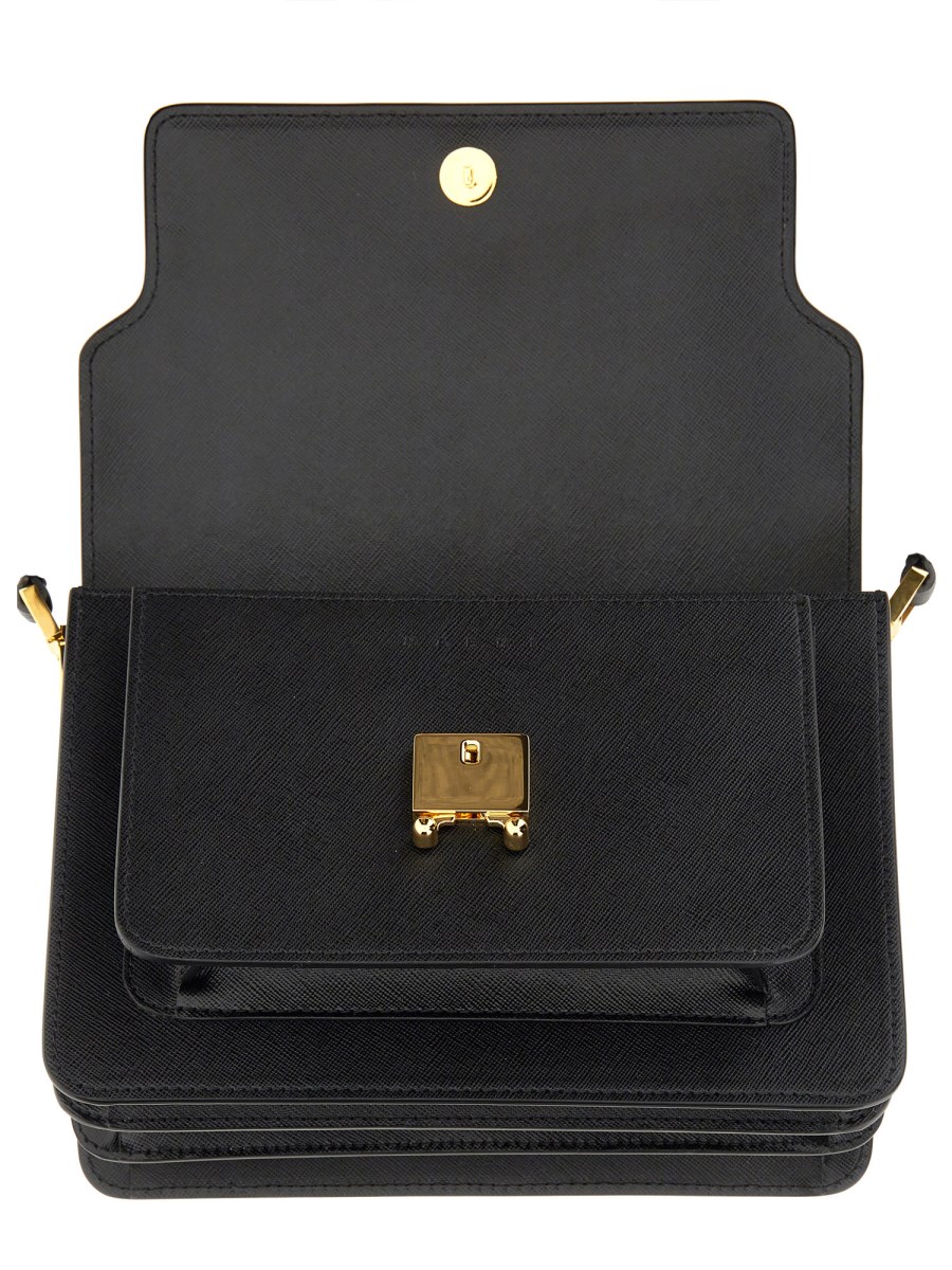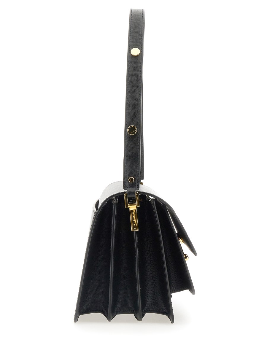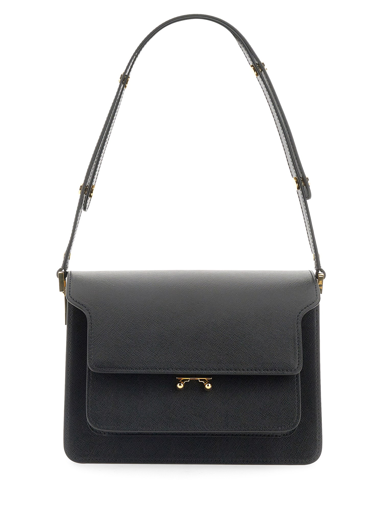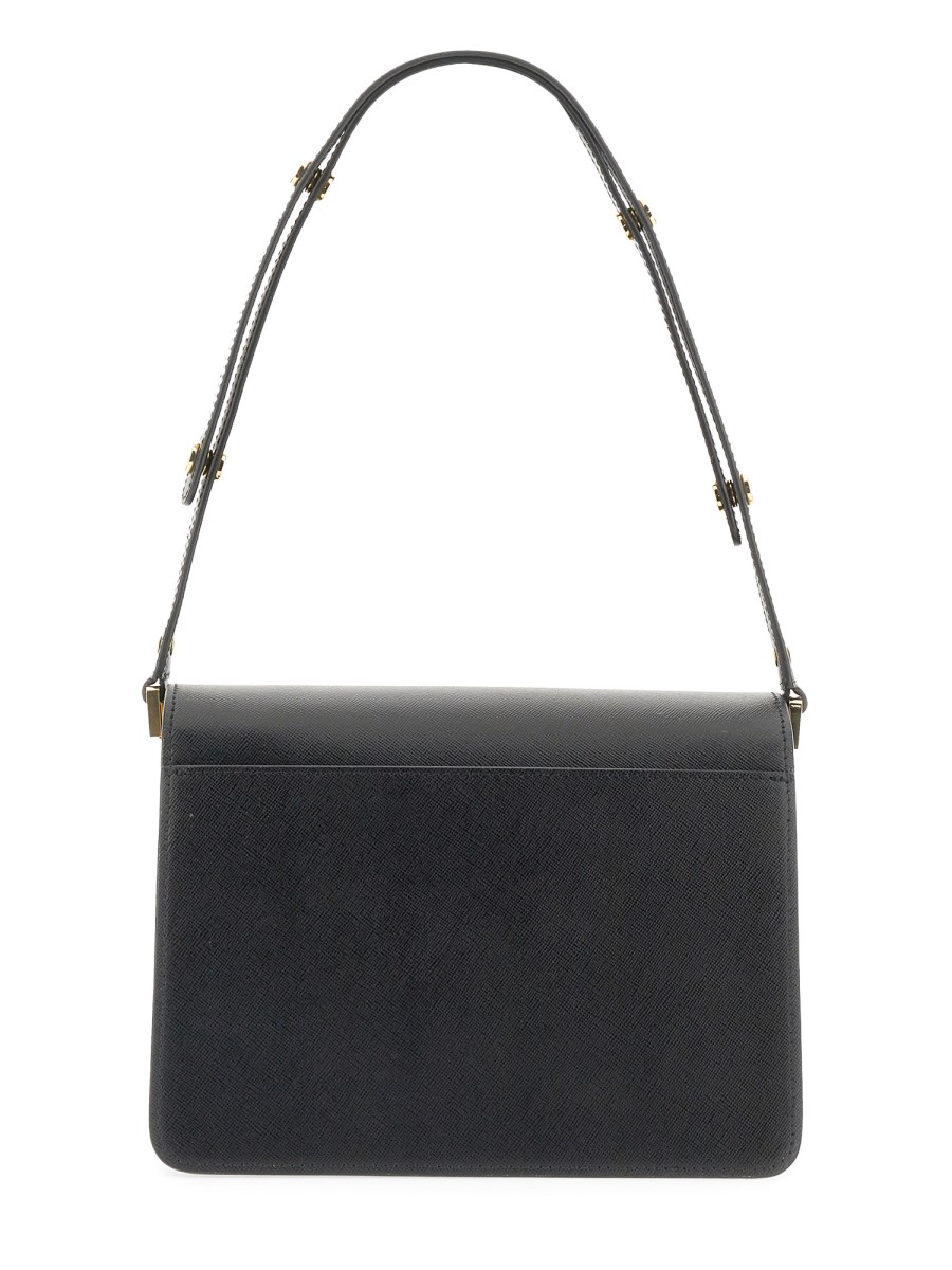 This leather trunk bag from Marni is a good companion for travel. The trunk bag has an adjustable shoulder strap with an extension to carry it with ease. It also features a flap closure and has contrasting profiles. The bag has a back pocket, an inside pocket, and five full compartments, two of which are zippered.