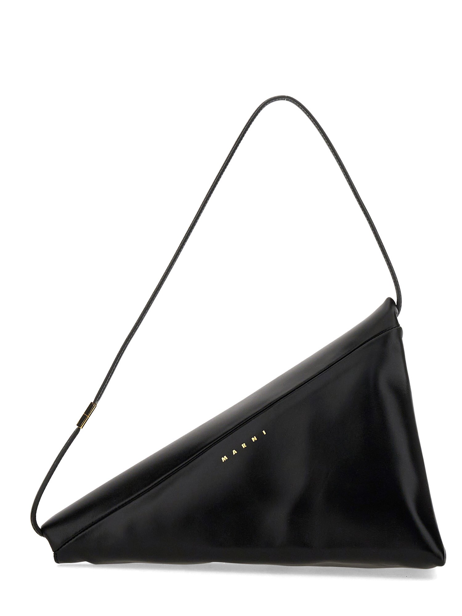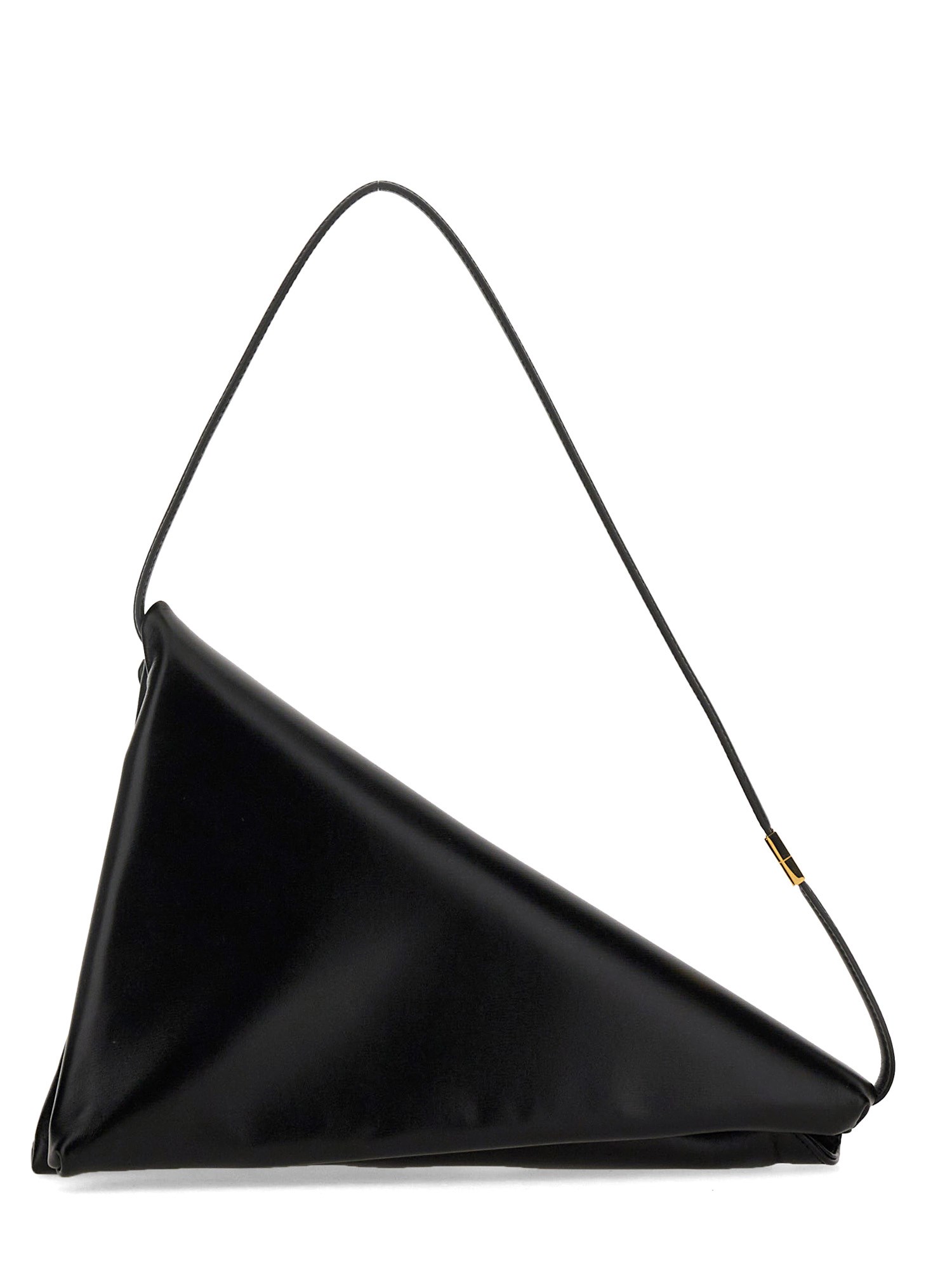 Introducing the Prisma bag, crafted from plush calfskin leather in a distinctive triangular shape. It boasts both a convenient zip and flap closure secured with a metal clasp, concealing two spacious compartments. Enhanced by shiny gold-tone hardware and lined with vegan leather, this bag exudes luxury. For added versatility, it comes with a detachable leather shoulder strap. Made with Italian craftsmanship.