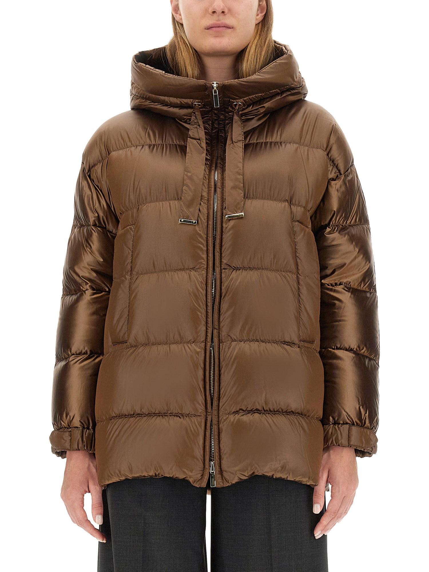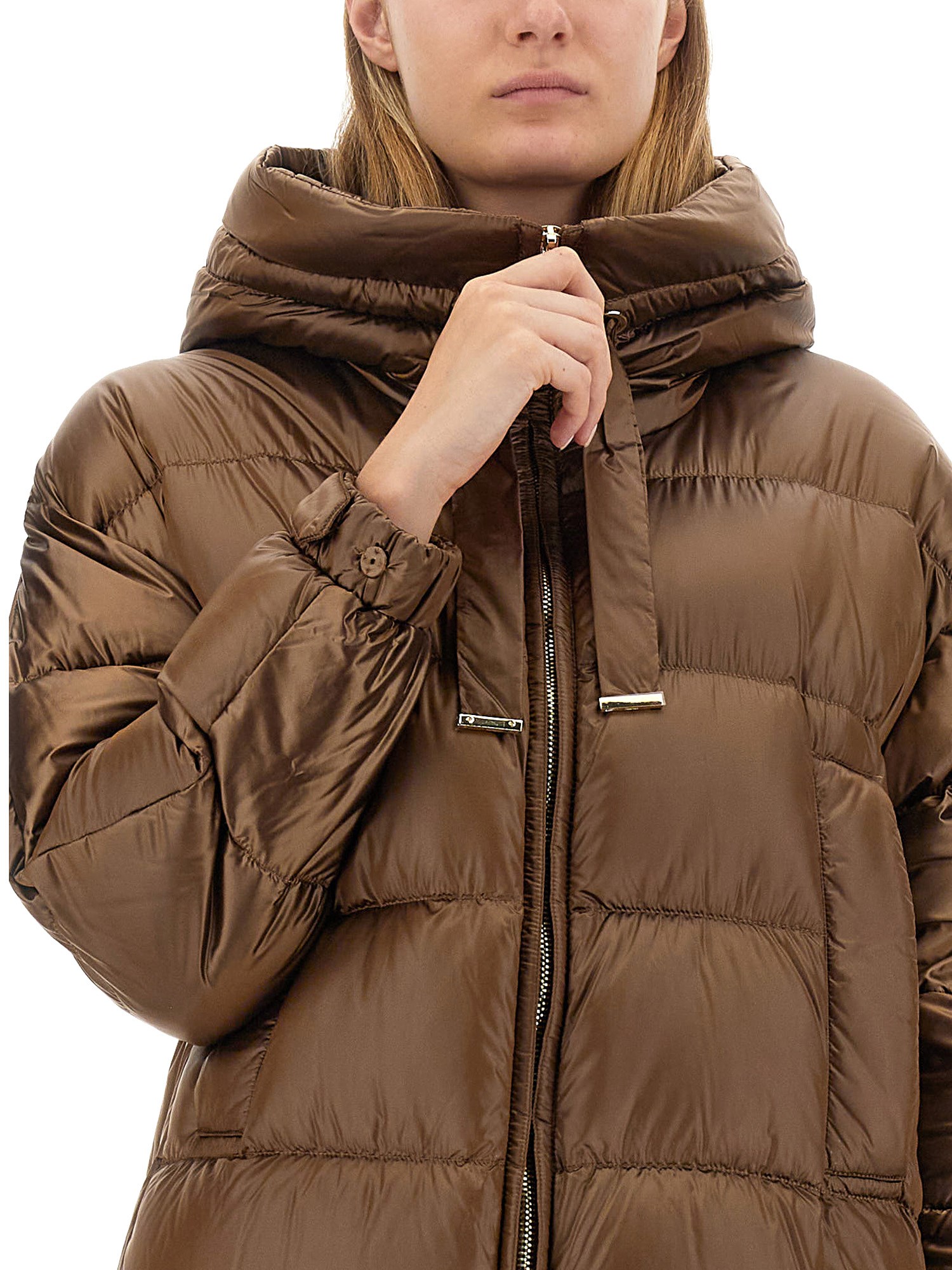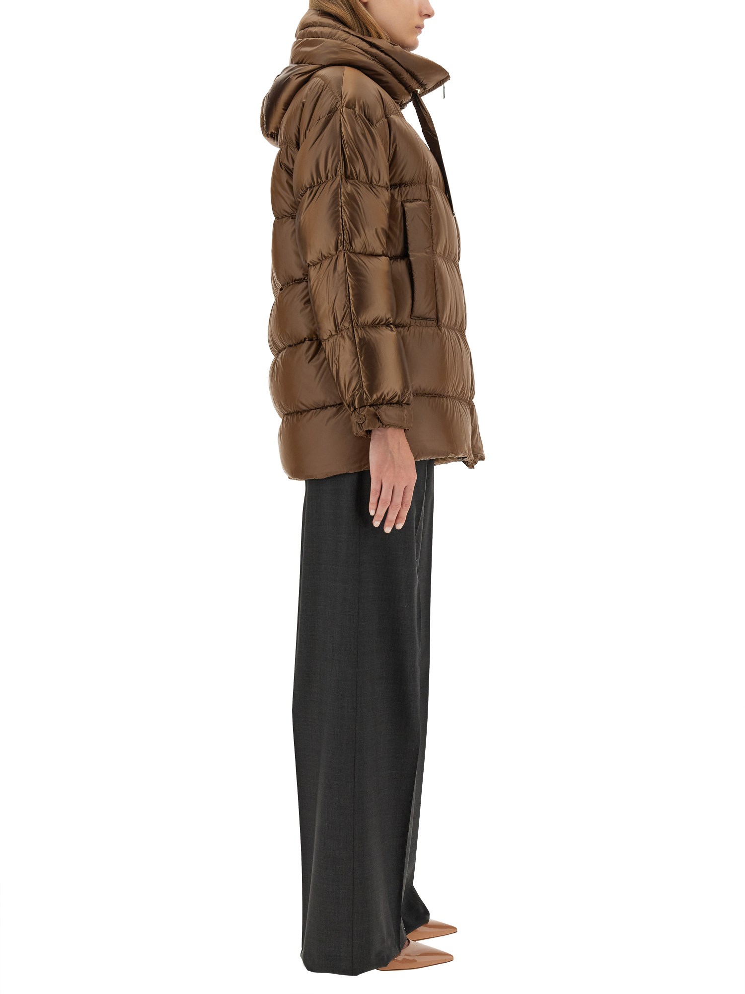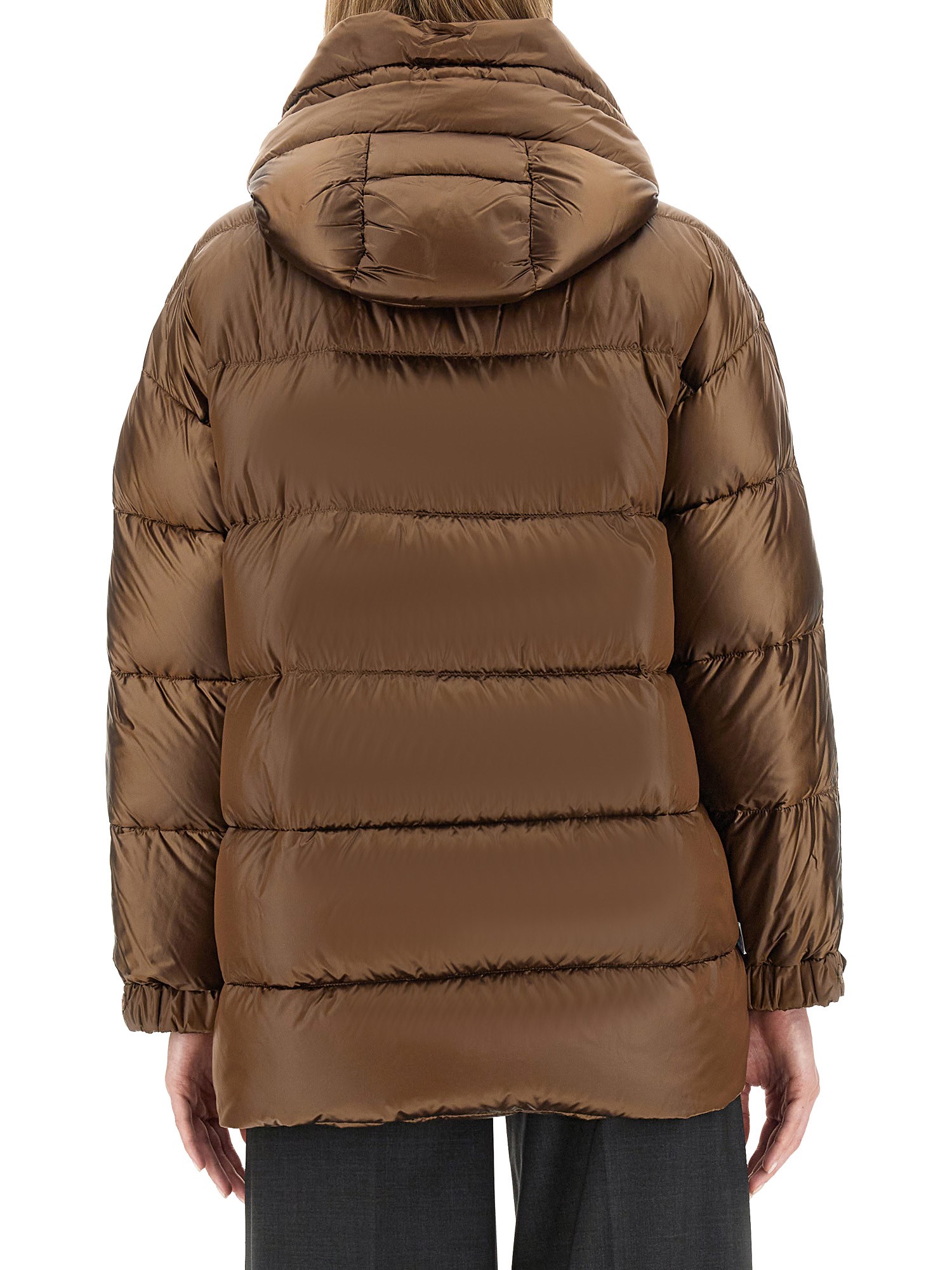 Short down jacket in water-repellent iridescent technical canvas featuring a drawstring hood, goose down padding, horizontal quilting, welt pockets and elasticated cuffs that can be adjusted by means of the press stud-fastening cuff tab detail. Zip fastening.