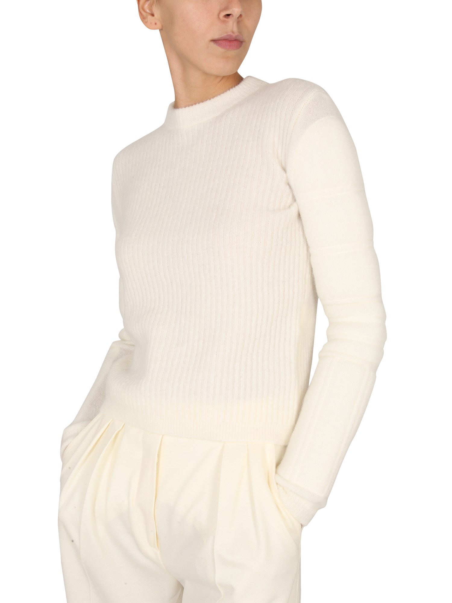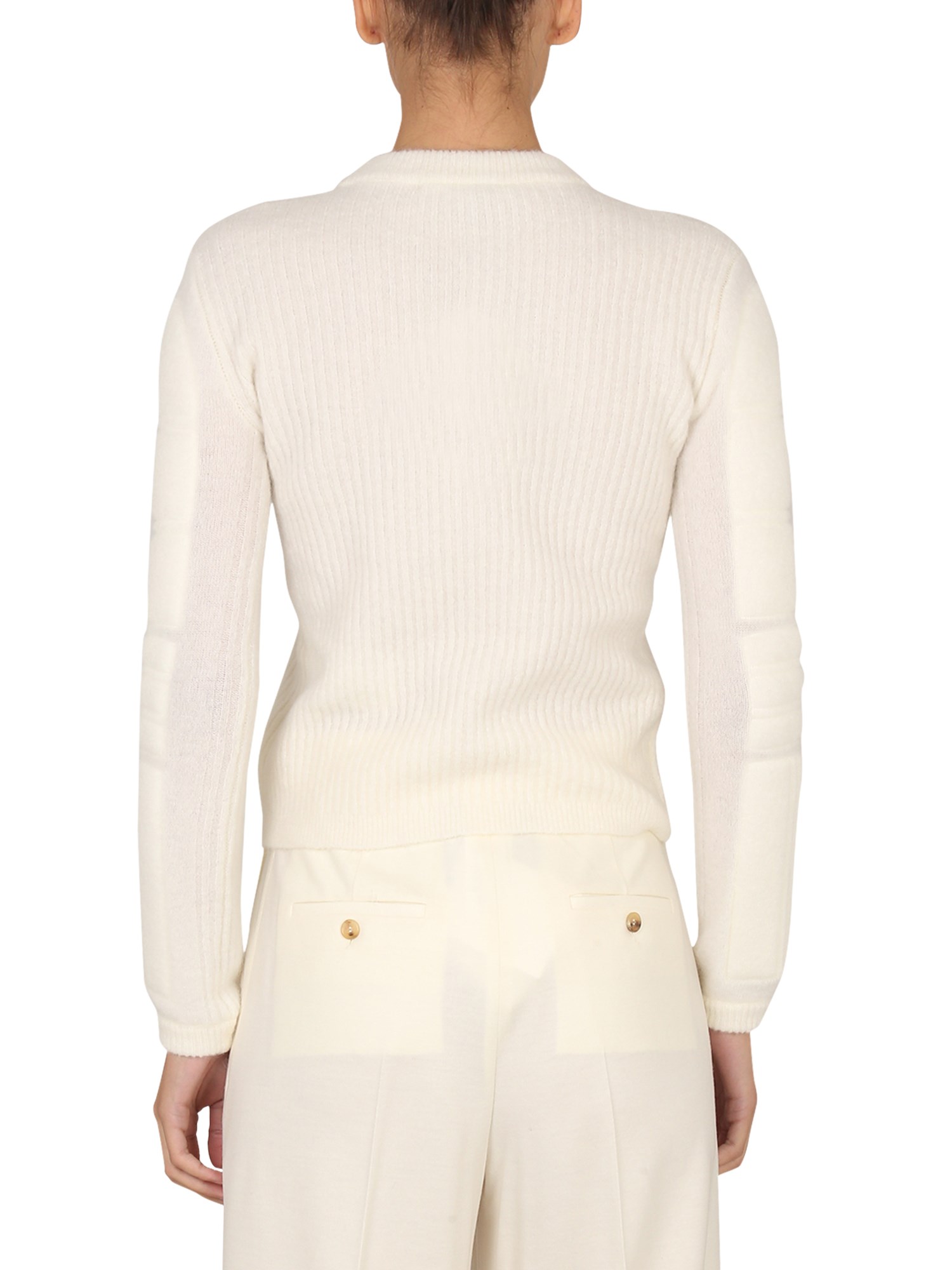 - CROWLING- STRETCH MOHAIR YARN WORKED WITH FLAT RIBBING- SLEEVES WITH PADDED EMBROIDERED MOTIF- SLIM FIT- 38% MOHAIR, 38% WOOL, 19% POLYAMIDE, 5% ELASTANE- MODEL IS 180 CM TALL AND WEARS SIZE M