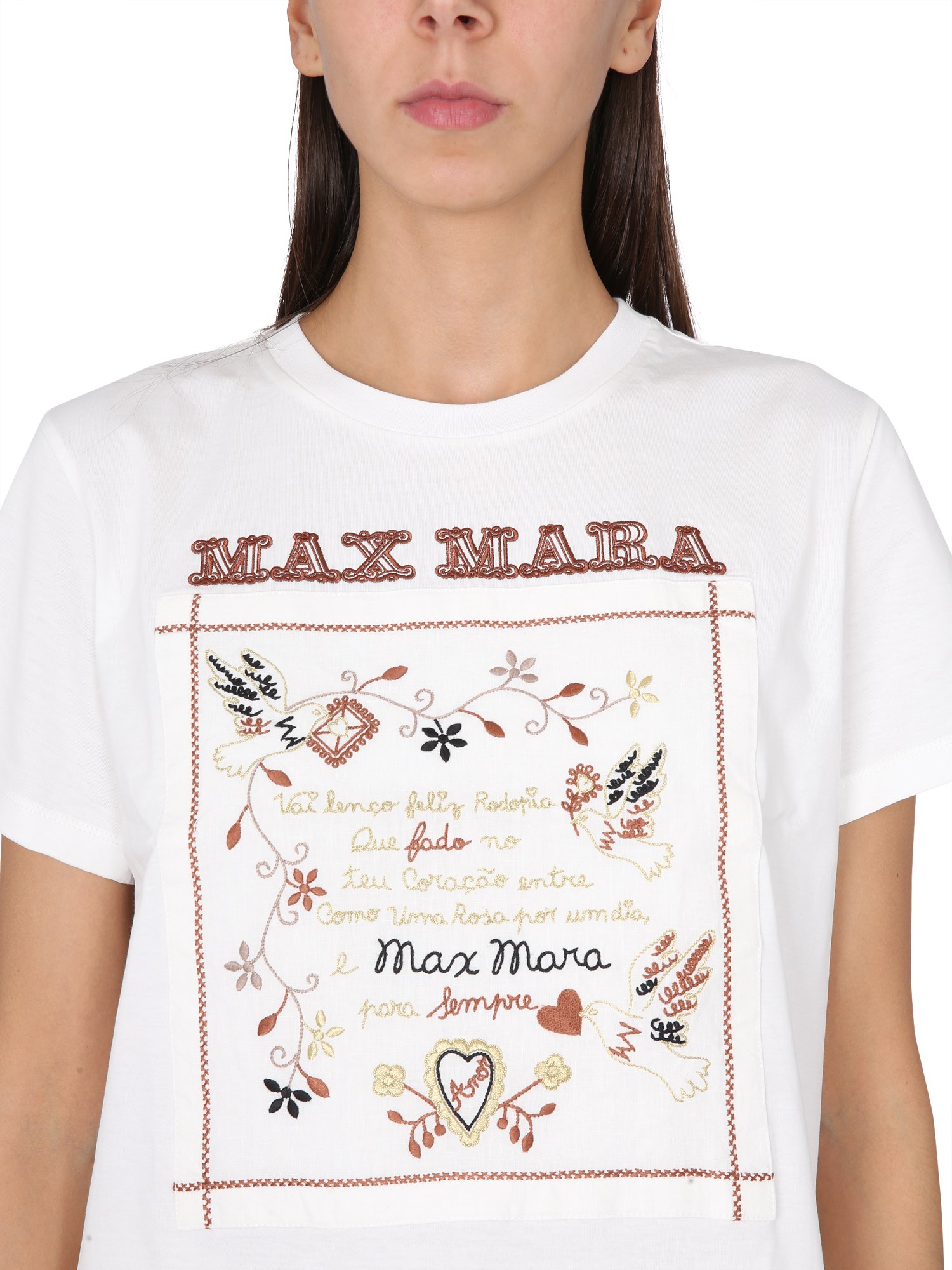 The front logo embroidery cotton jersey crewneck T-shirt from Max Mara is a great piece for those looking for a casual shirt. The white colour is very soft and can go with anything. The front logo embroidery is a great addition to this T-shirt. It's a classic look that will keep you cool on those hot summer days.
