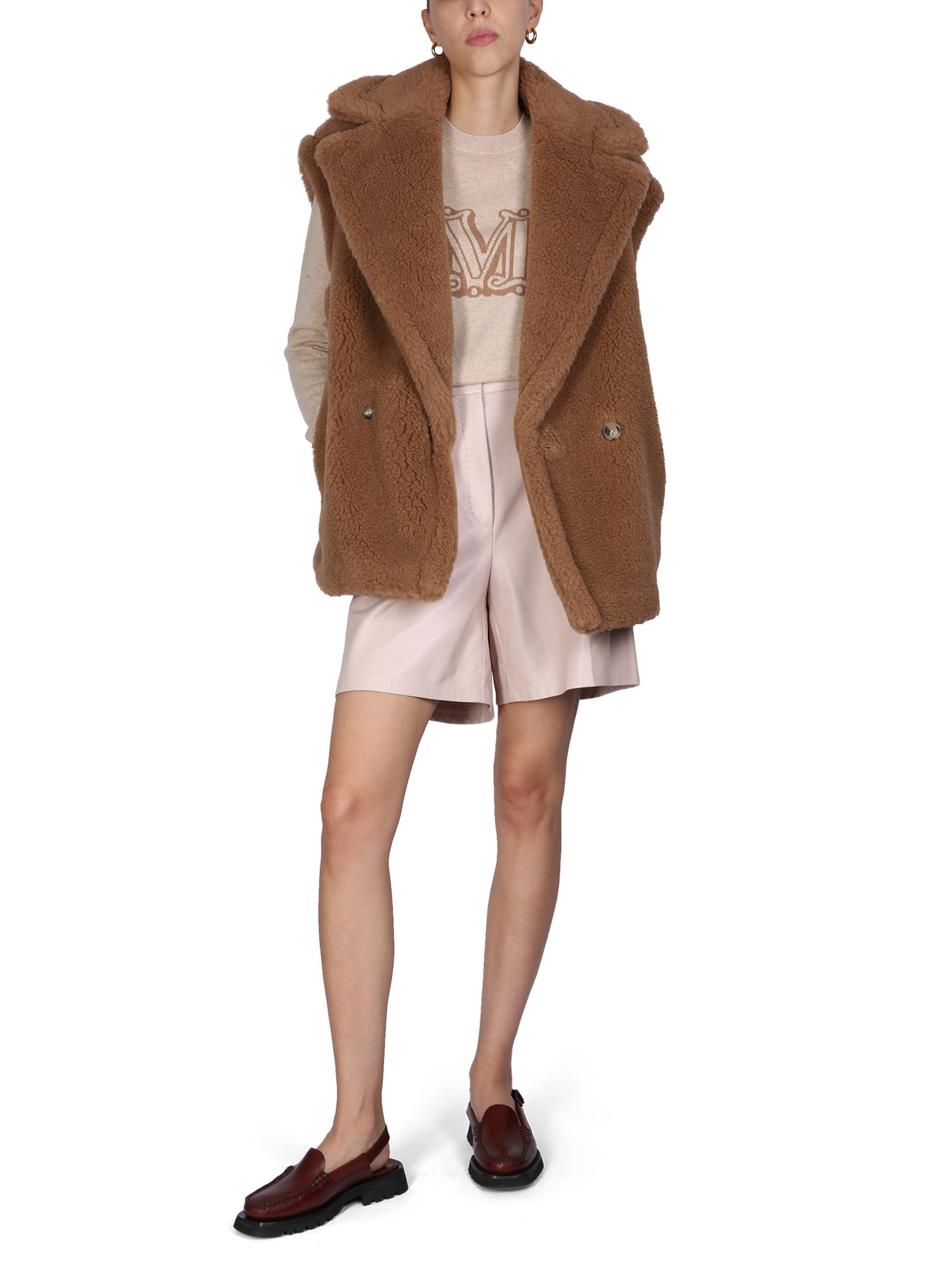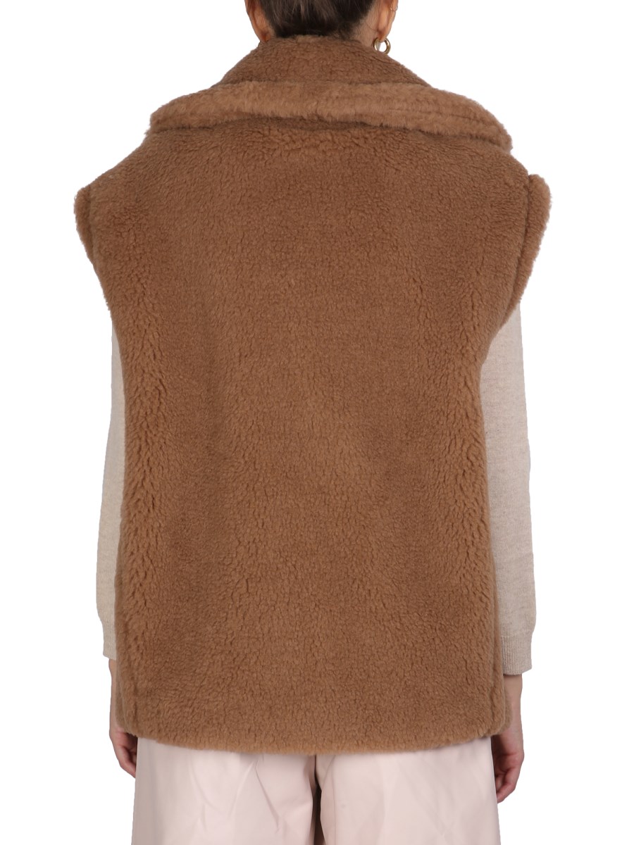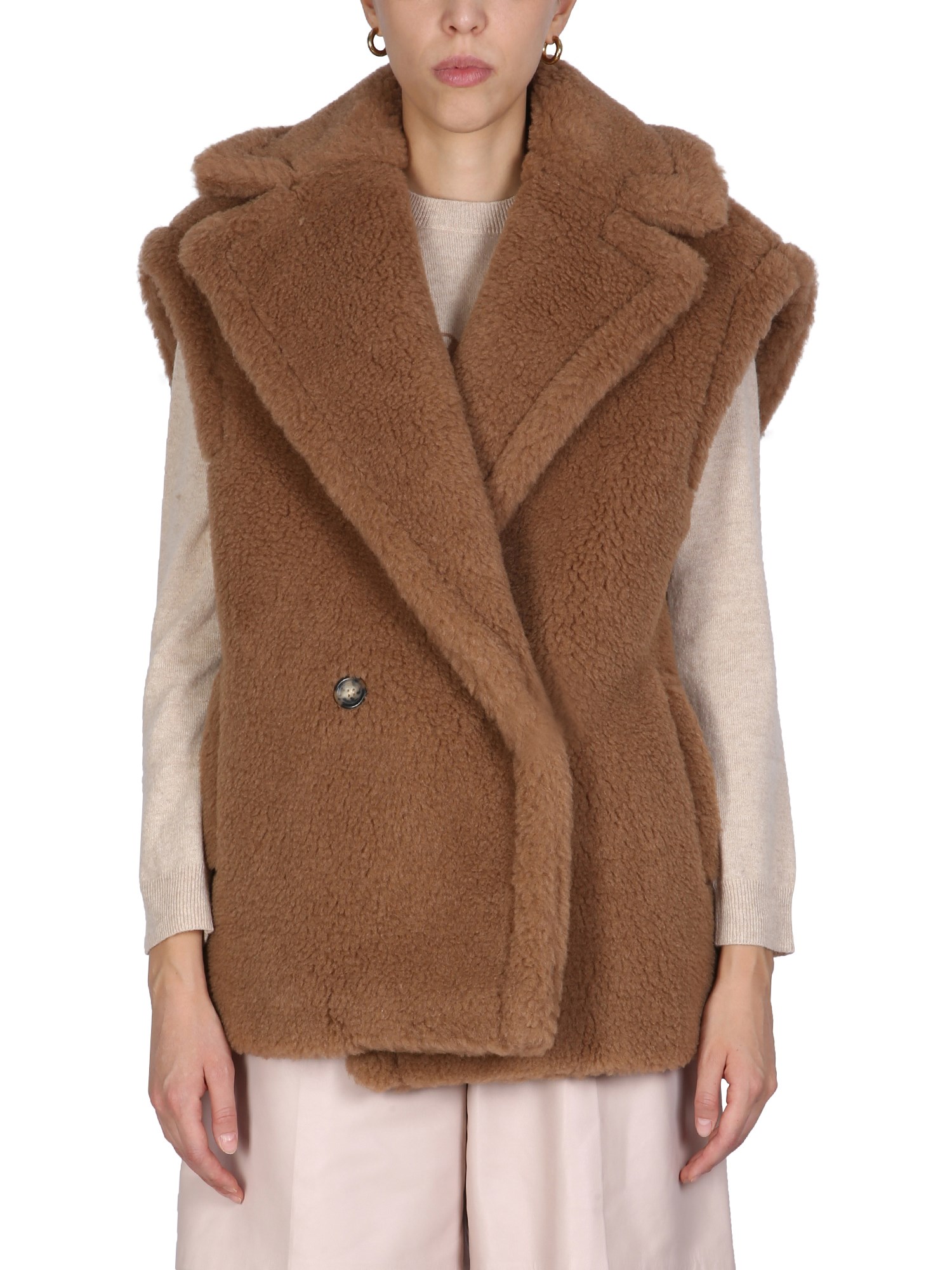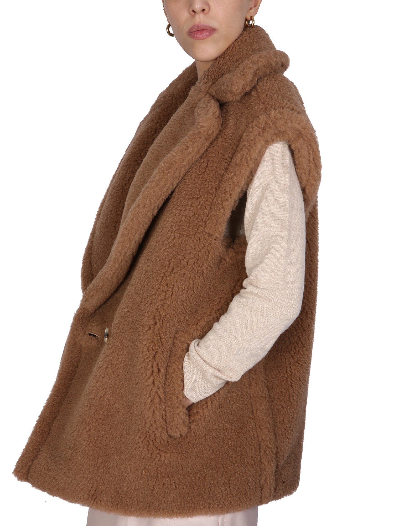 When the snow starts to fall, you need to bundle up with this camel-blend teddy bear vest by Max Mara. The long-sleeved design is perfect for a chilly winter day, and the adorable teddy bear print will make it hard to resist. This vest is a great way to stay warm and cosy, and it will have you feeling like a kid again.