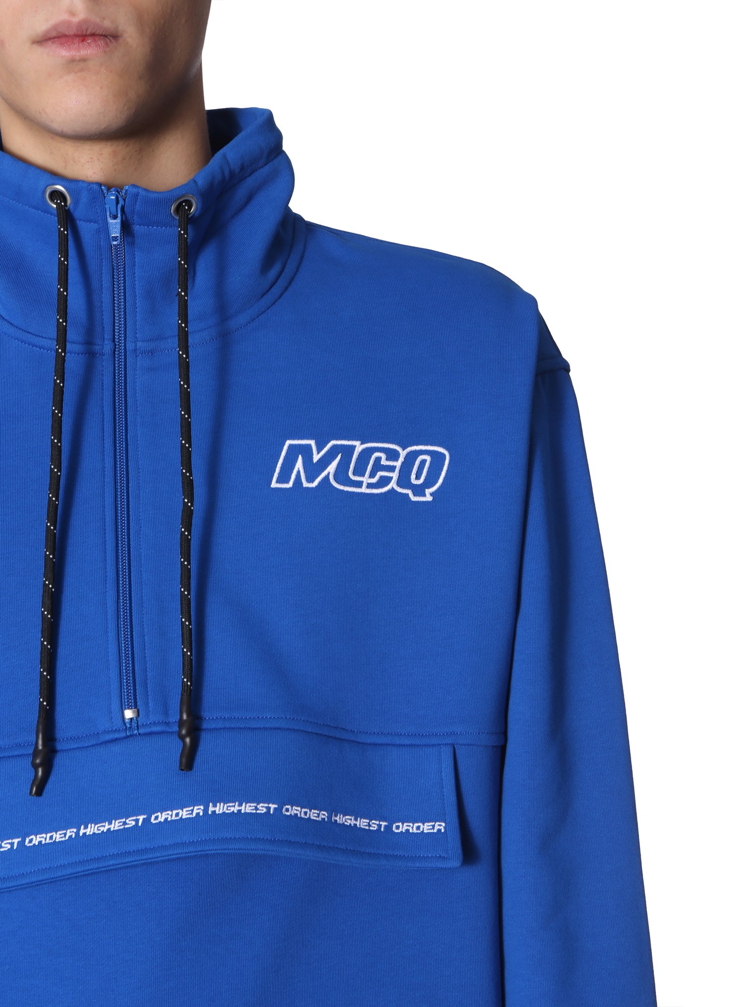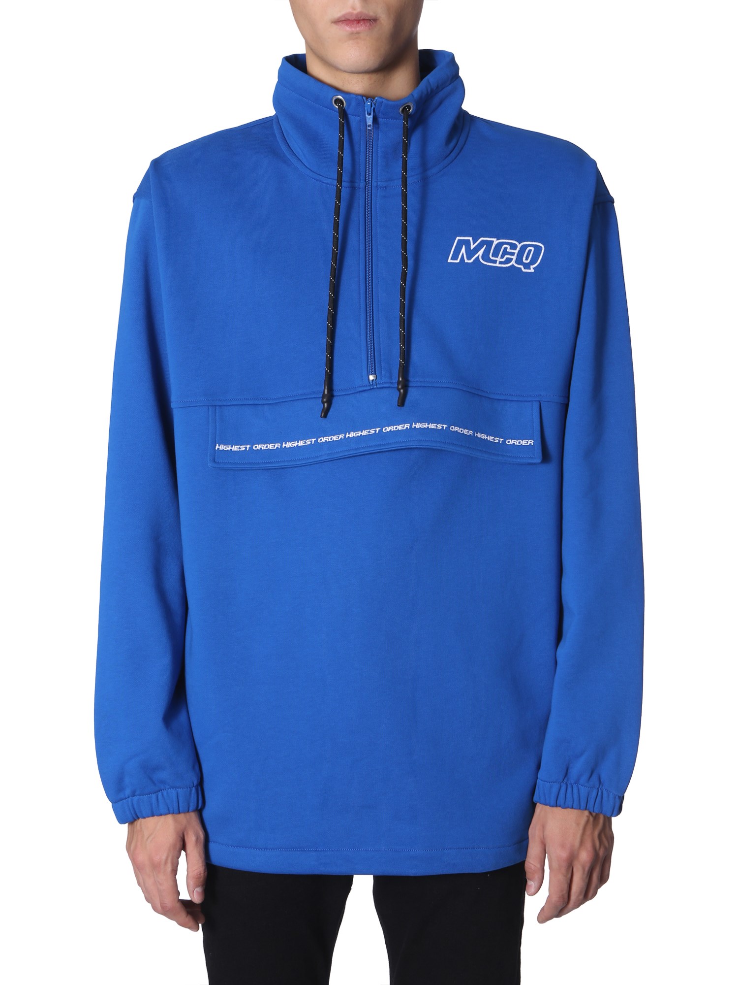 Be stylish and comfortable wearing this sweater from MCQ Alexander McQueen that has an oversized fit. Offered in an attractive colour, this jacket has a half-zip closure at the neck secured with a coulisse string. The elasticated bottom keeps you snug and insulated while the front has a bag with a zip.