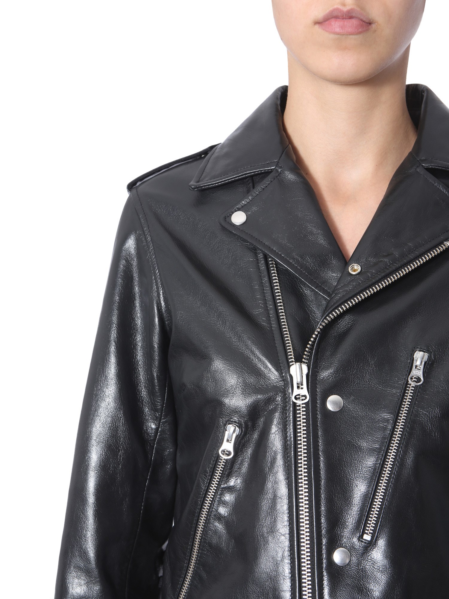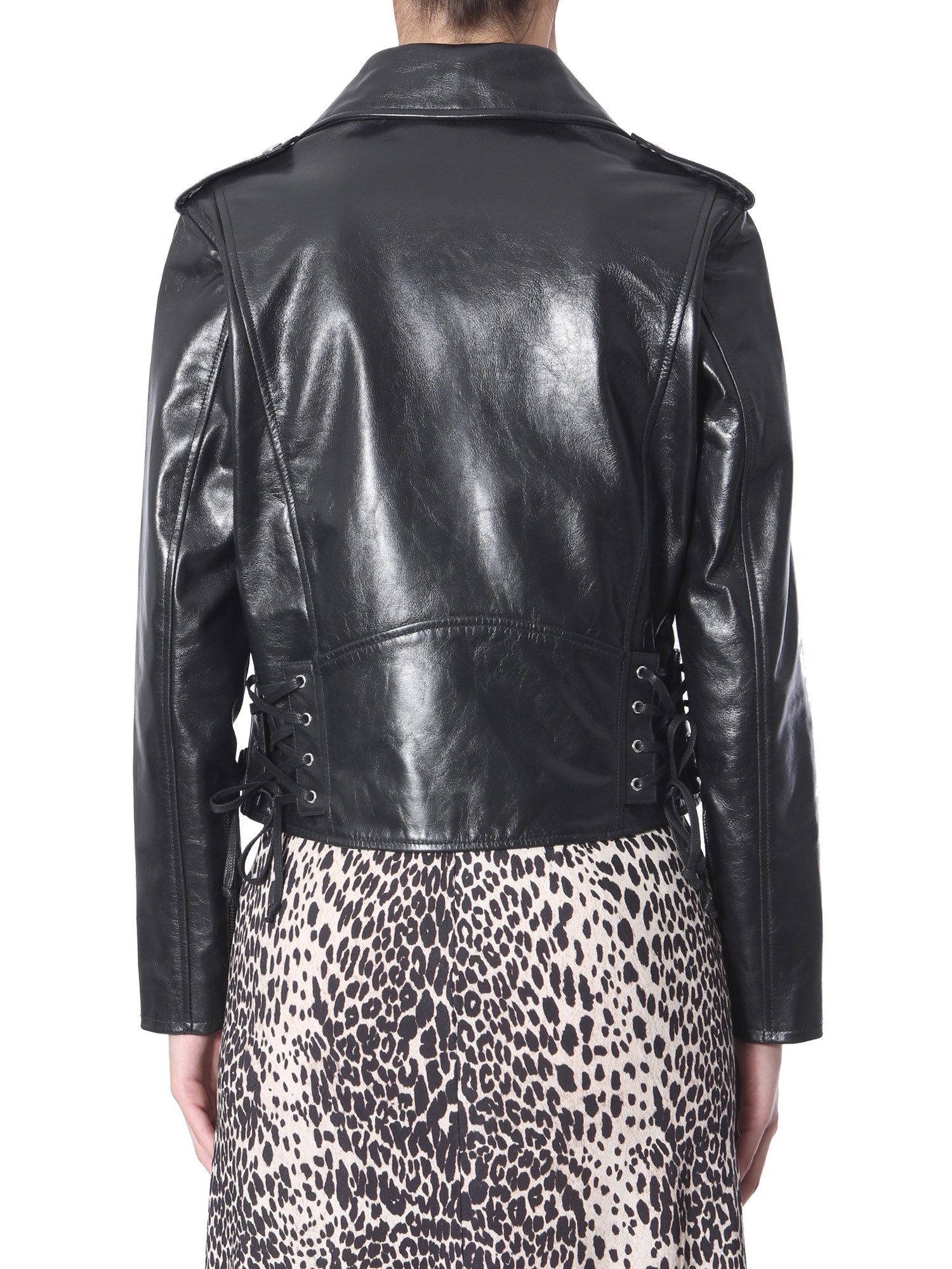 Make a lasting impression on everyone with this biker jacket from MCQ Alexander McQueen. The jacket is made from 100% goatskin that lends durability. It comes with a stylish side stringing zip closure with multiple pockets for added functionality. The jacket can be matched with leather boots to create a sassy winter ensemble.
