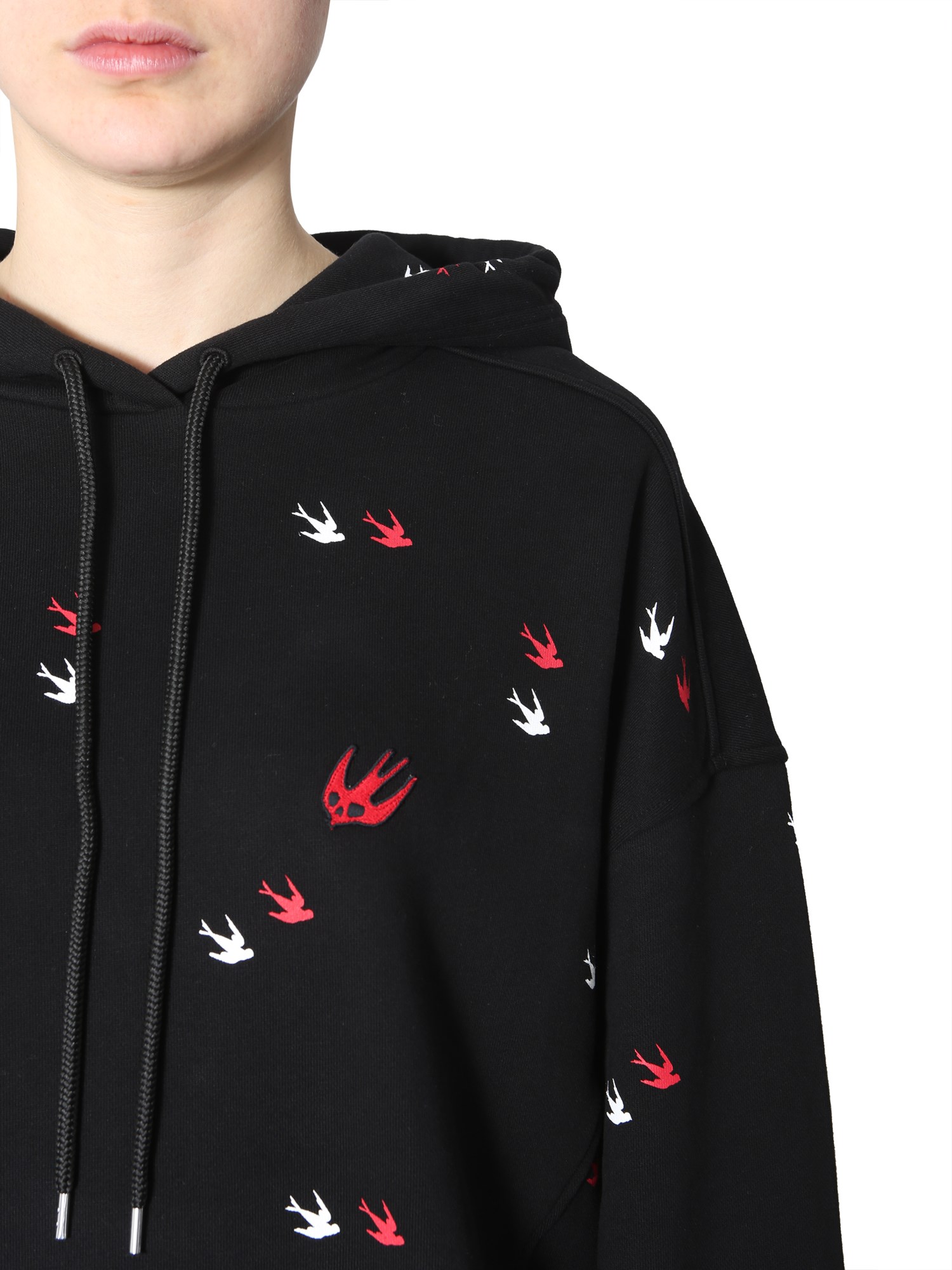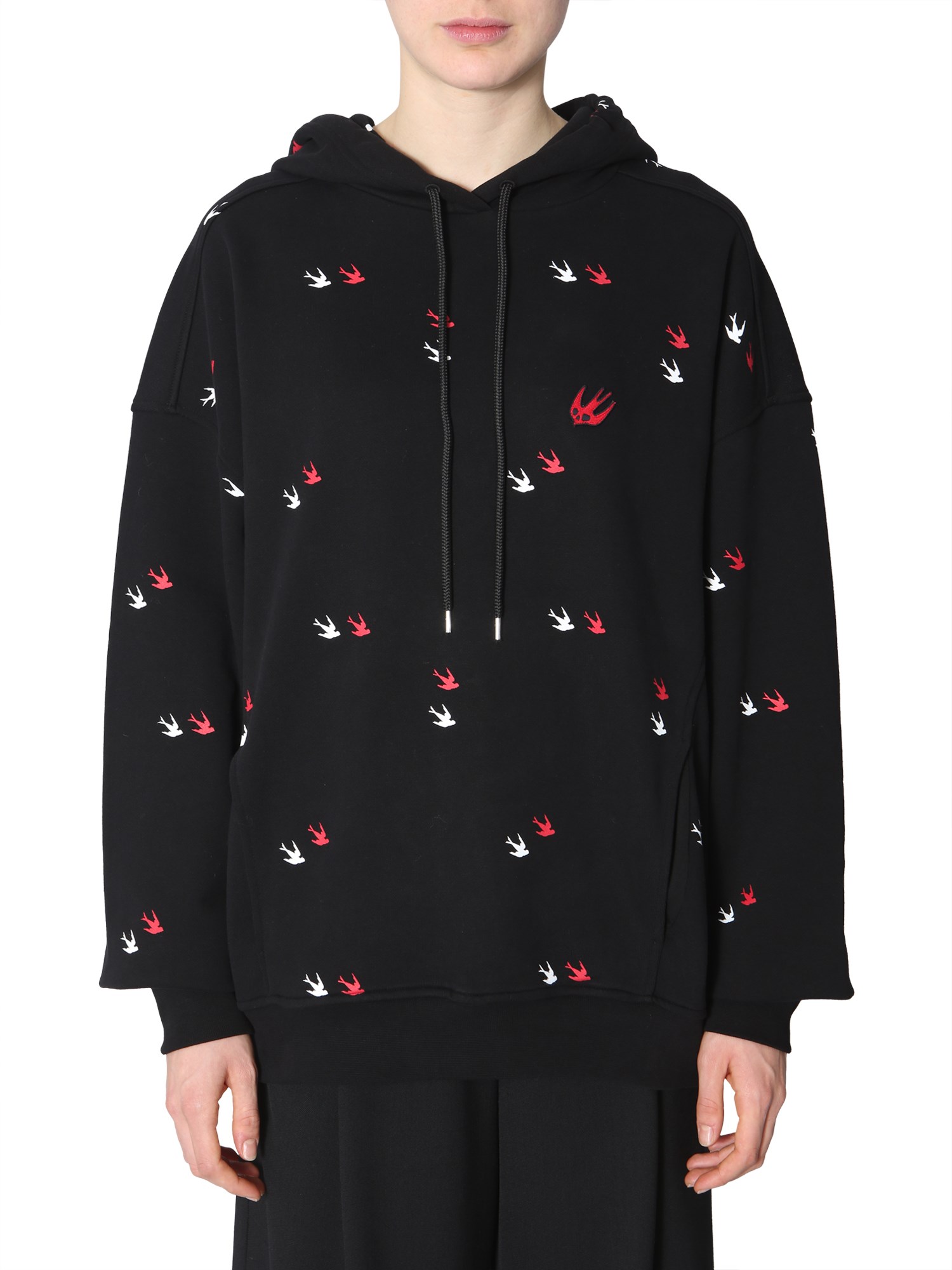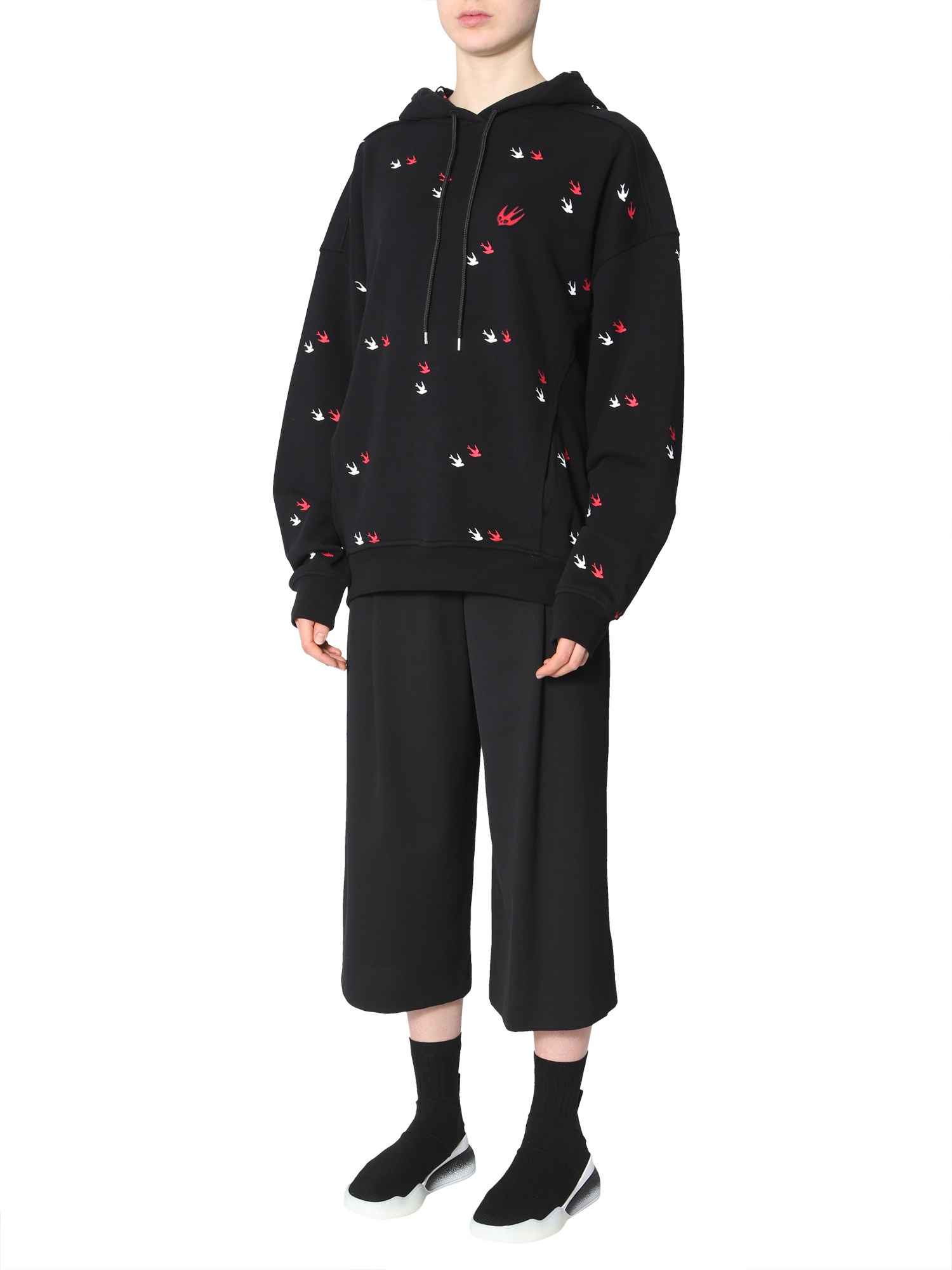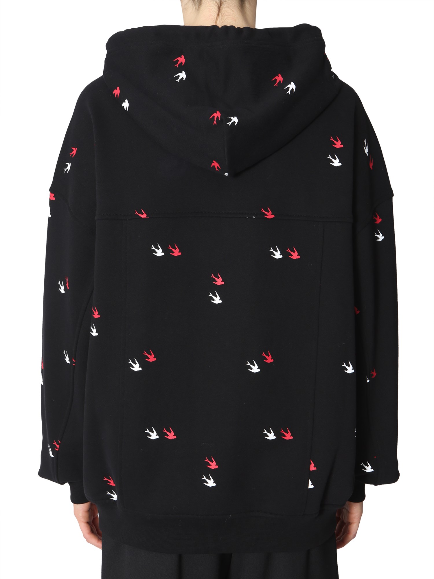 Keep warm and cosy in this sweatshirt designed by MCQ Alexander McQueen. Crafted with pure cotton, the sweatshirt features flying swallows throughout the surface. A hooded neck with coulisse offers more comfort during a winter morning. Wear it with jogging trousers to create your ideal, comfortable, and fashionable fitness gear.