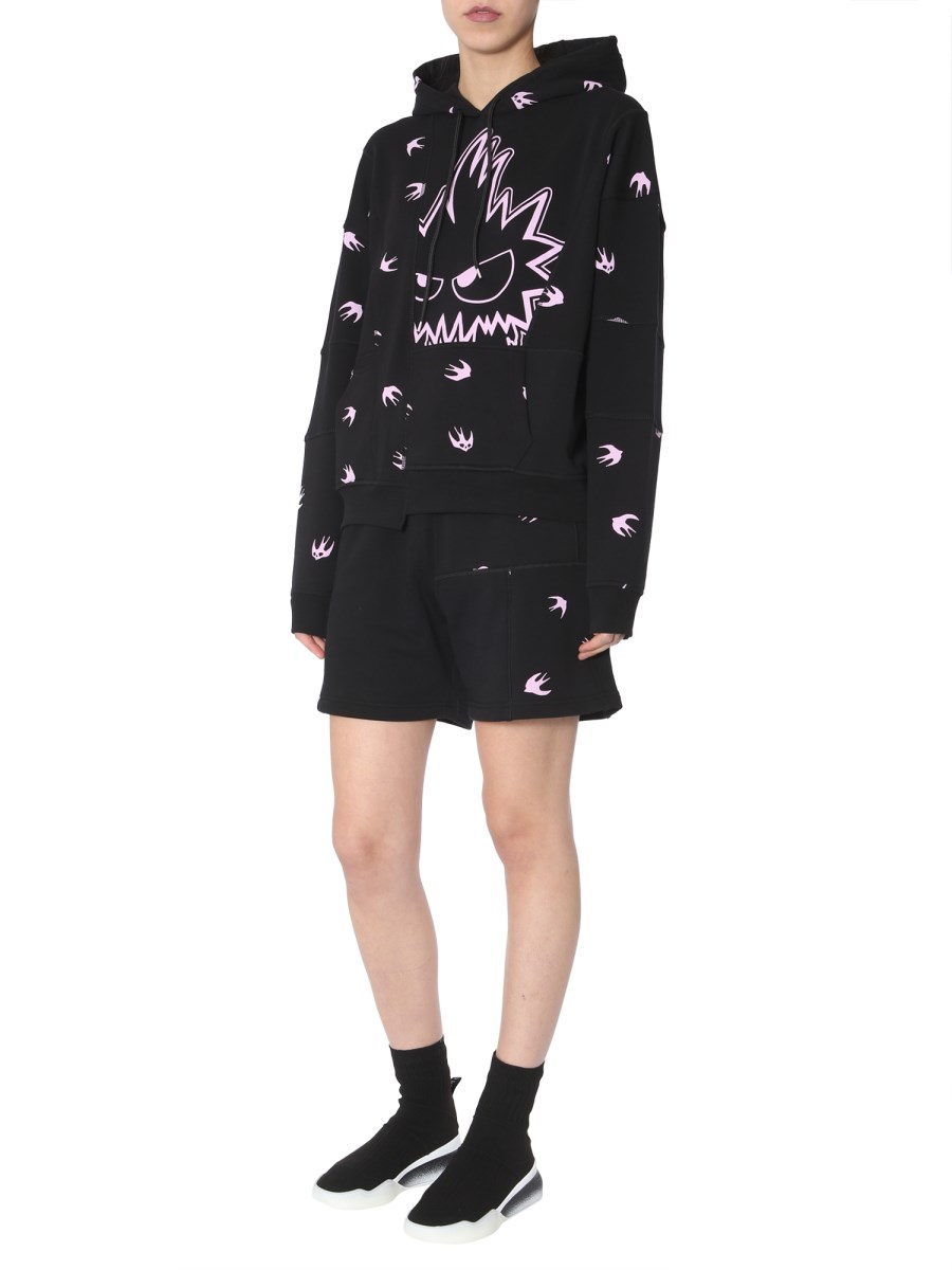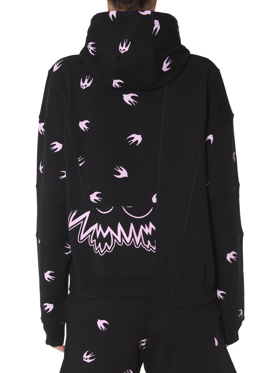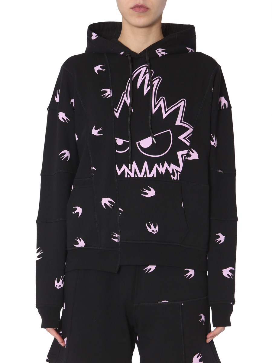 Catch up with your friends in fashionable women's hooded sweatshirt from MCQ Alexander McQueen. The sweatshirt features a hooded neck with a coulisse. The printed patchwork makes it look fashionable and trendy. The asymmetric hem and vintage seams render it a dapper look. With two side pockets, the sweatshirt lets you carry your stuff on-the-go.